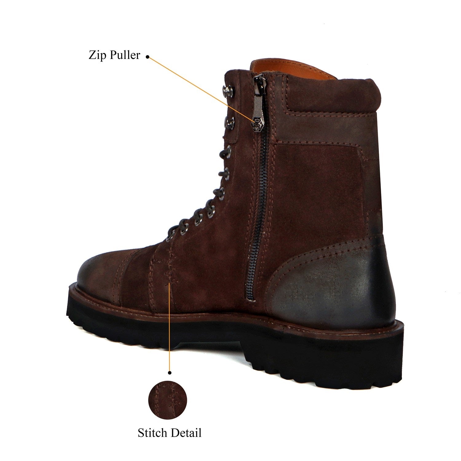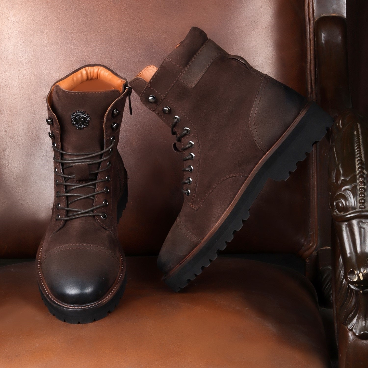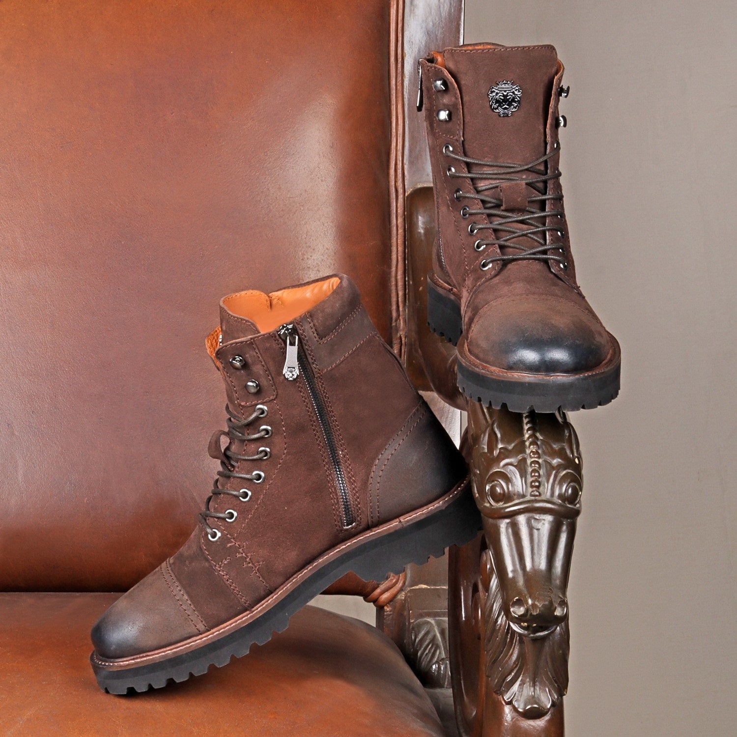 These high-ankle-length Dark Brown Sued-Leather Biker Boots are very elegant. The contrasting toe, heel, and neck cap provide the accented look. Tips of these rounded leather boots enhance the style statement. The color of the shoe can be customized to your liking. Wear it and make a remember able mark of fashion.