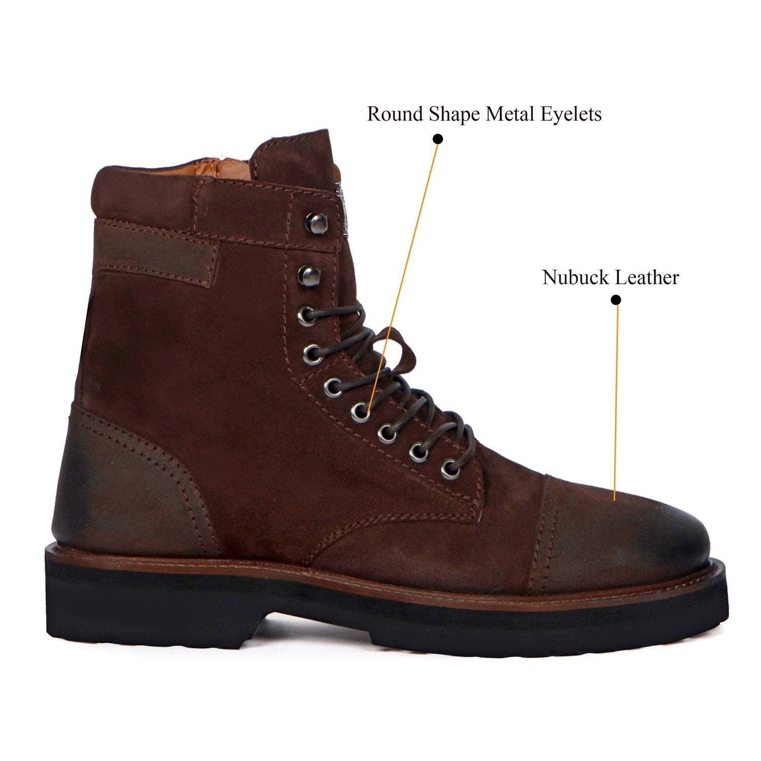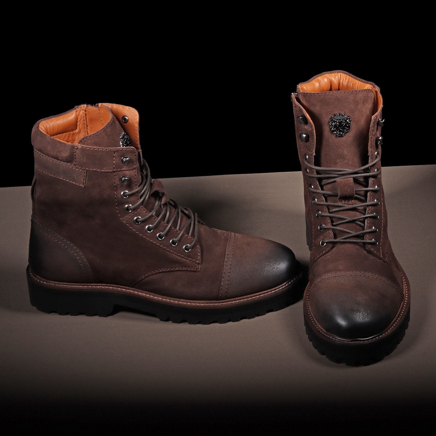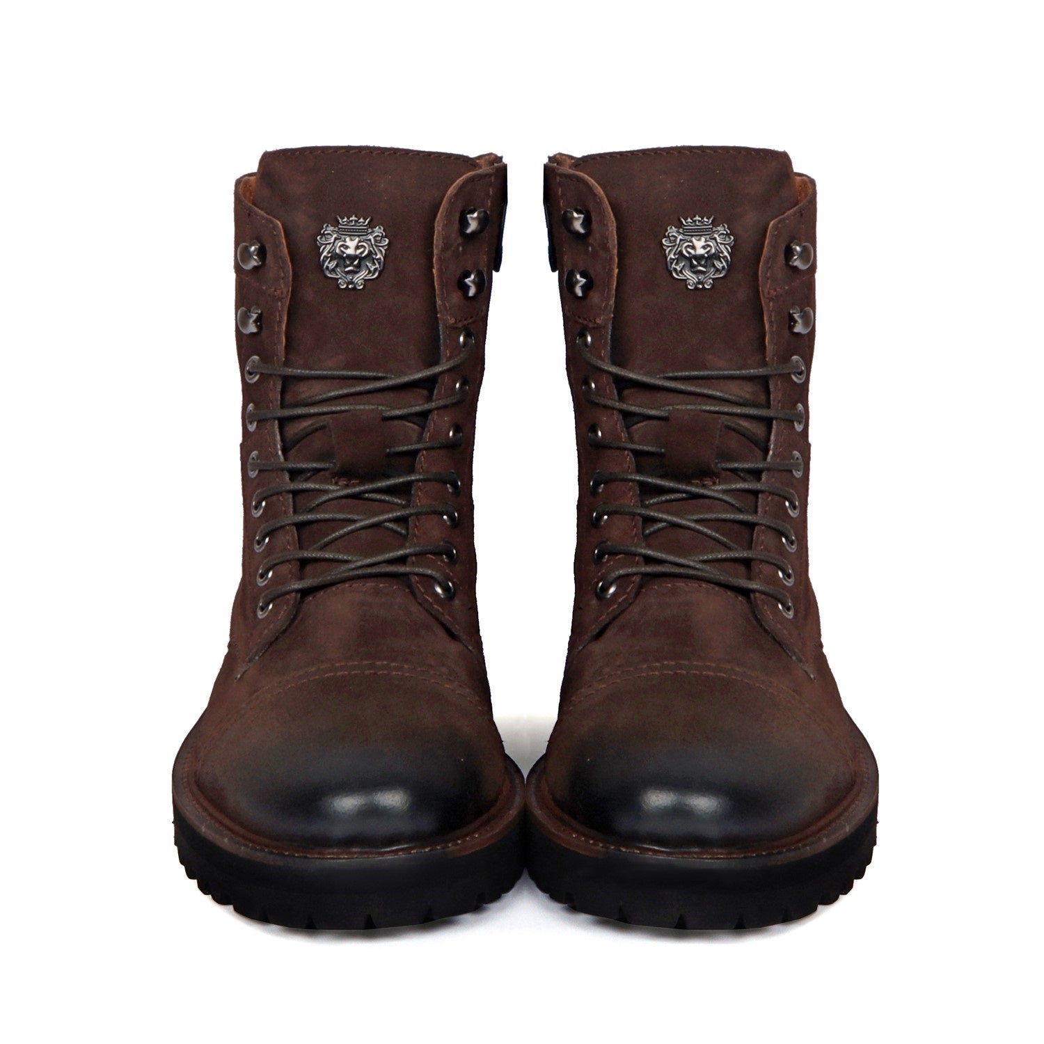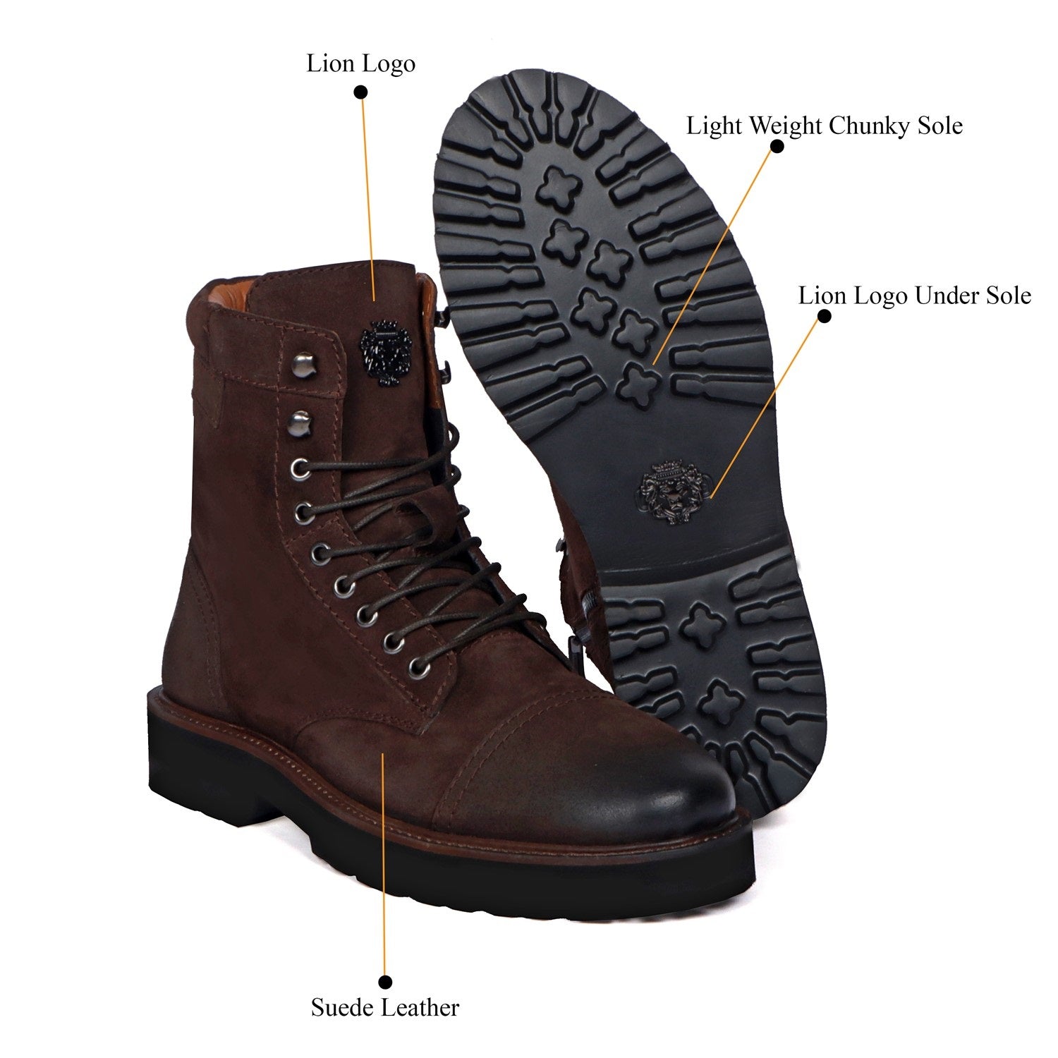 These high-ankle-length Dark Brown Sued-Leather Biker Boots are very elegant. The contrasting toe, heel, and neck cap provide the accented look. Tips of these rounded leather boots enhance the style statement. The color of the shoe can be customized to your liking. Wear it and make a remember able mark of fashion.