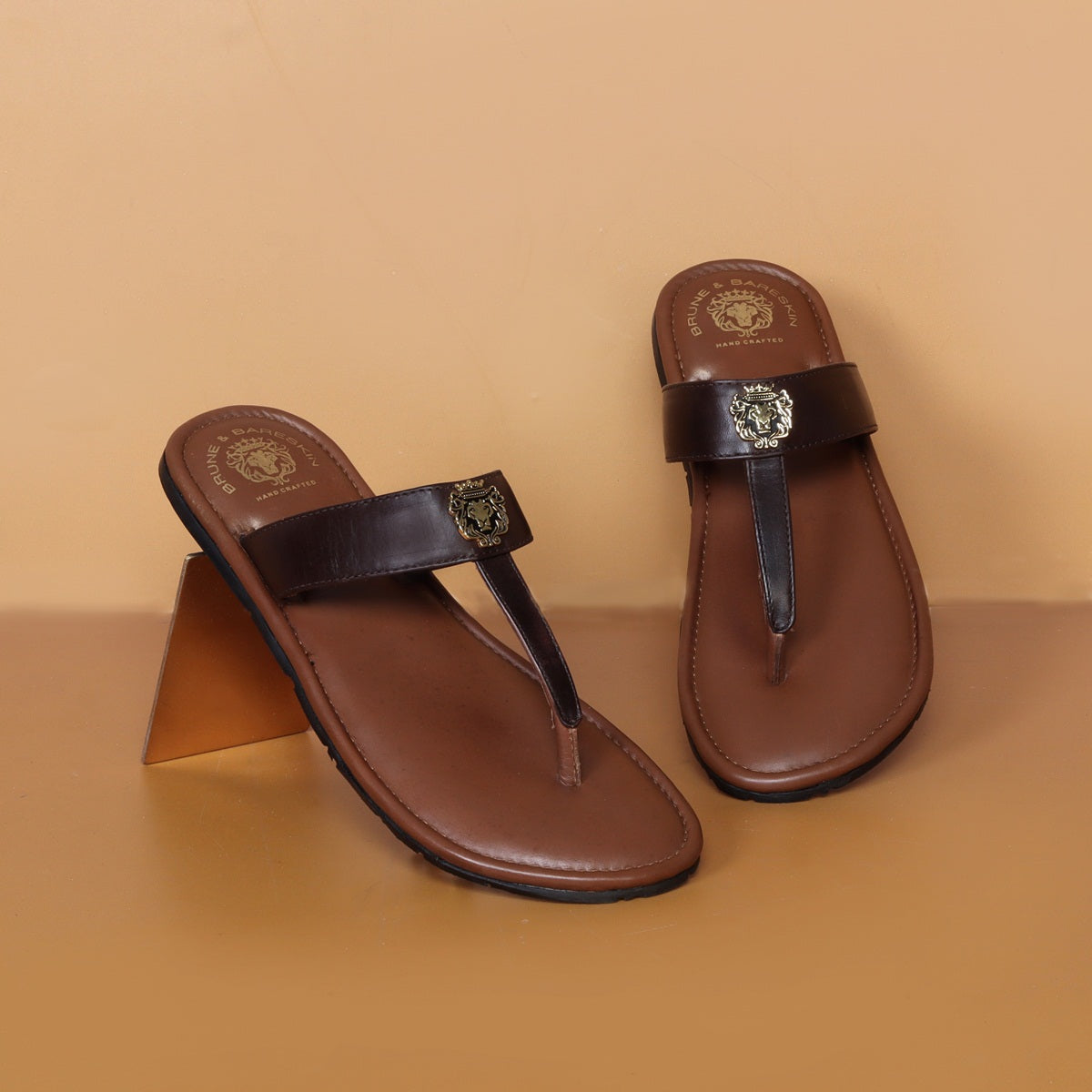 Experience luxury and quality in Brune & Bareskin's T-Strap slippers. Designed with genuine leather, a soft inner lining and a lightweight construction, these slippers keep you comfortable throughout the day. Featuring a dark brown hue and a golden Metal lion logo, these handmade slippers are perfect for the summer months. These slippers feature a flat sole for superior cushioning. This super-soft base gives you all-day comfort. These women casual footwear is a good pick to wear with casuals and ethnicities.