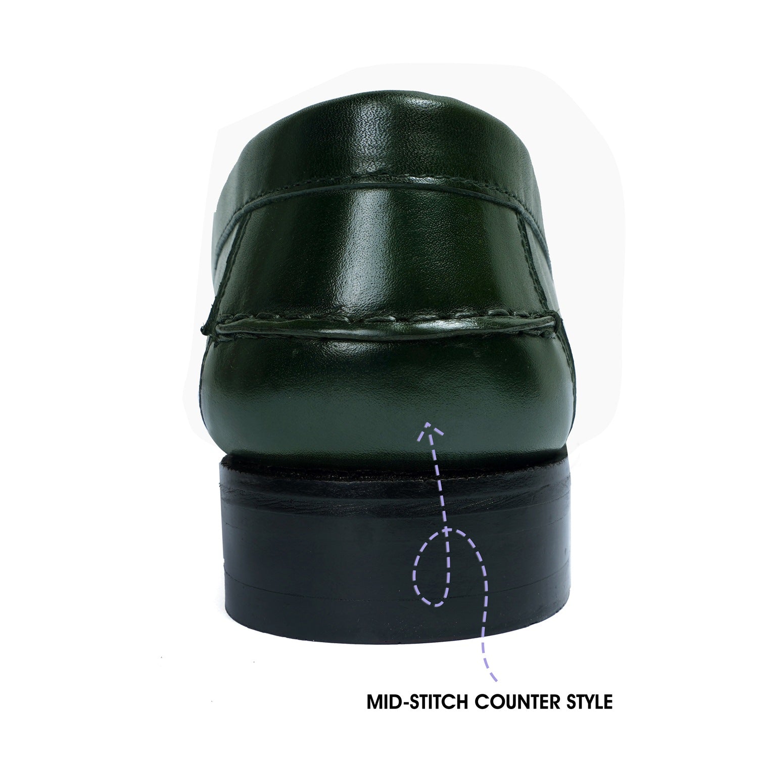Introducing our Dark Green Moccasin Loafer, crafted with premium quality genuine leather and featuring a trademark Lion Logo on the vamp with a stylish chain embellishment. With a perfect combination of style and comfort, this handcrafted loafer boasts extra padded and cushioned insoles for maximum comfort. The dark green color and stitched detailing piping on the heel cap add to its elegance. It also features a laser-detailed anti-skid rubber sole, making it the perfect choice for both formal and casual outfits.