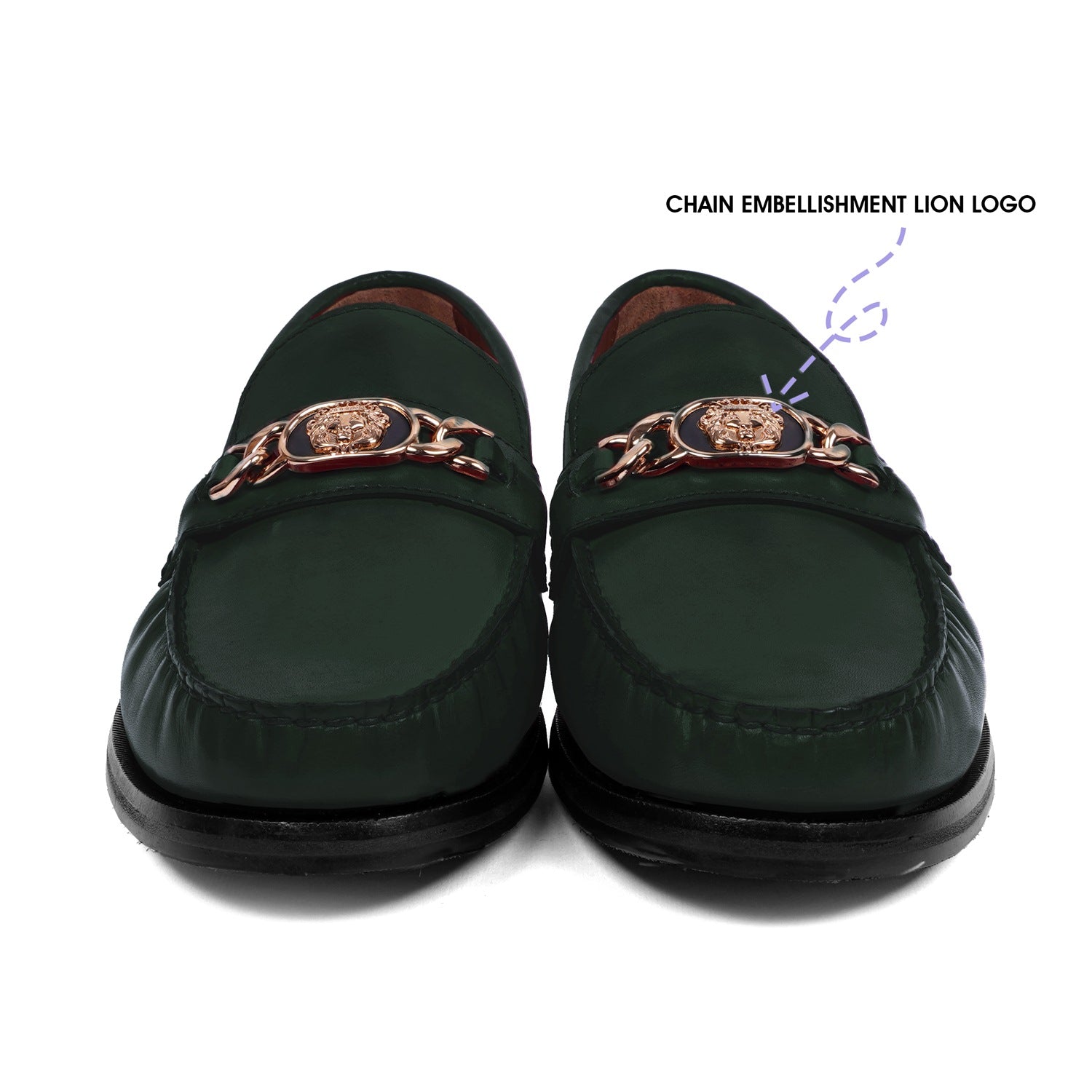 Dark Green Moccasin Loafer with Chain Embellishment Lion Logo