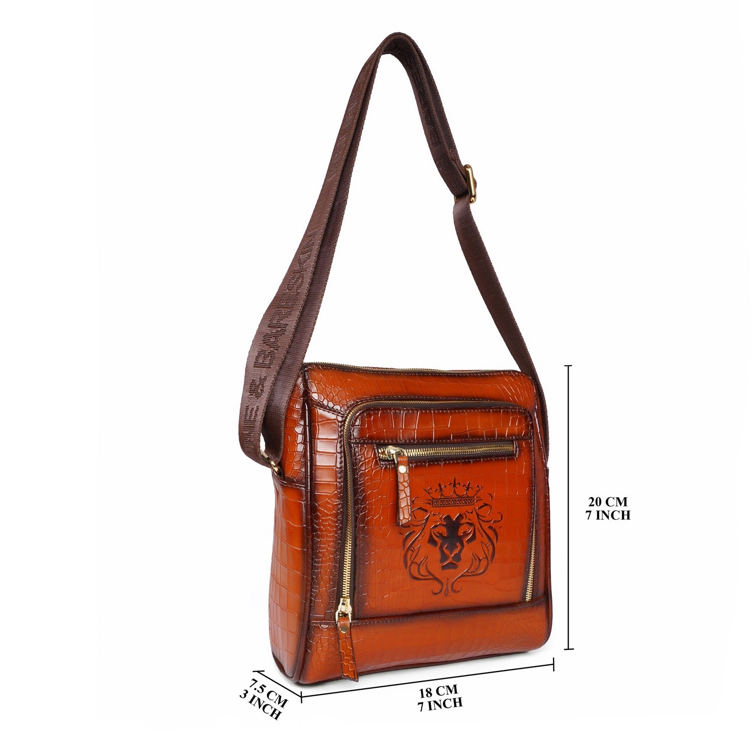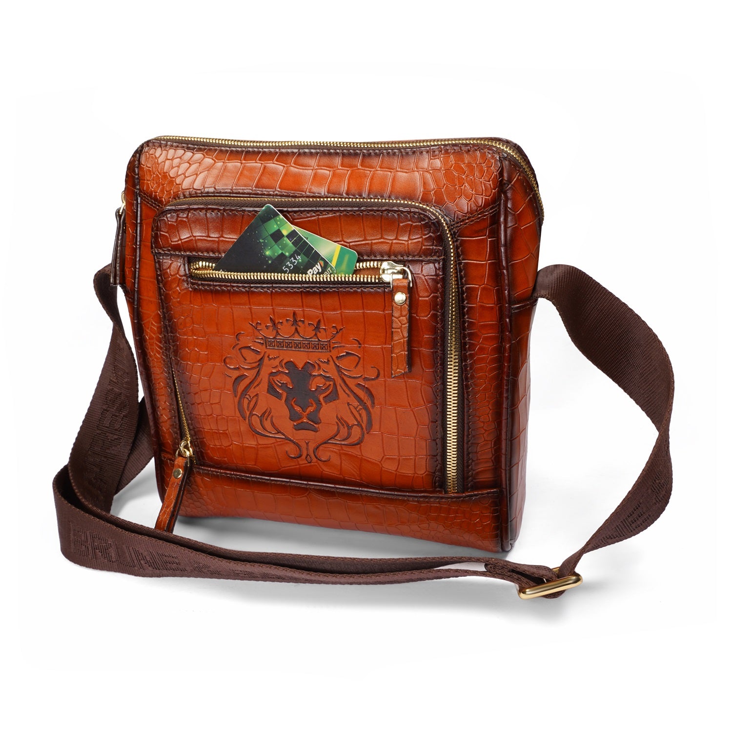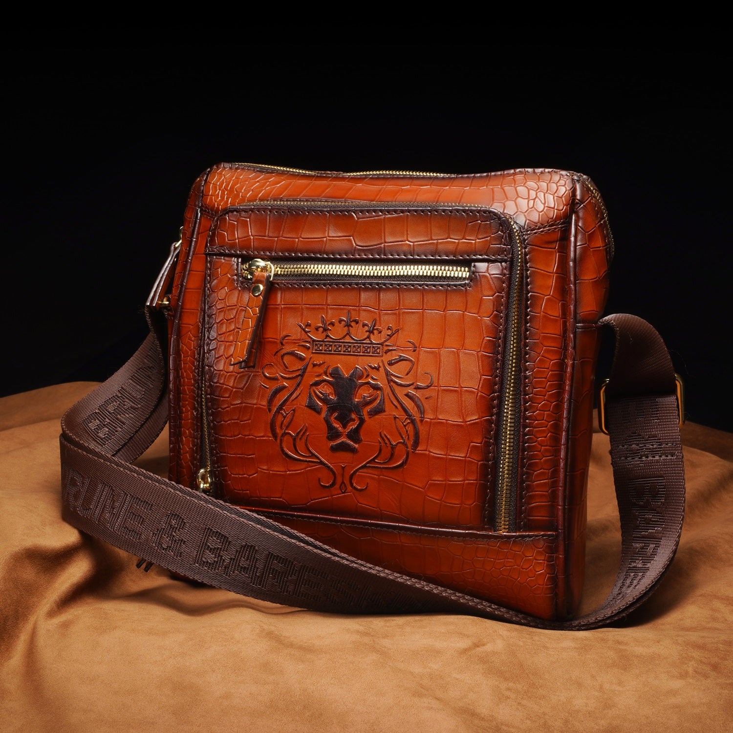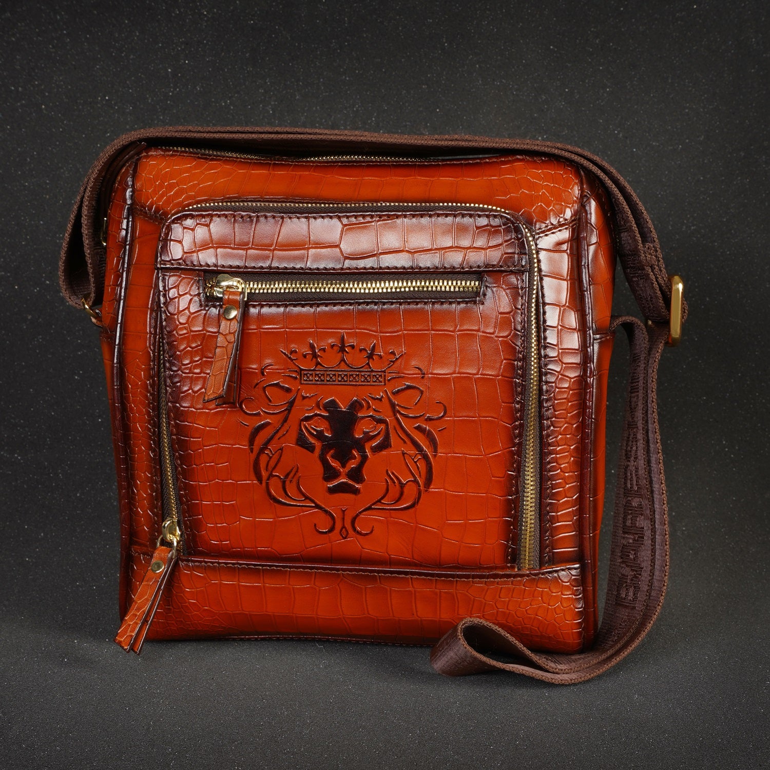 Deep Cut Croco Fanny Pack Bag In Tan Leather with Embossed Lion