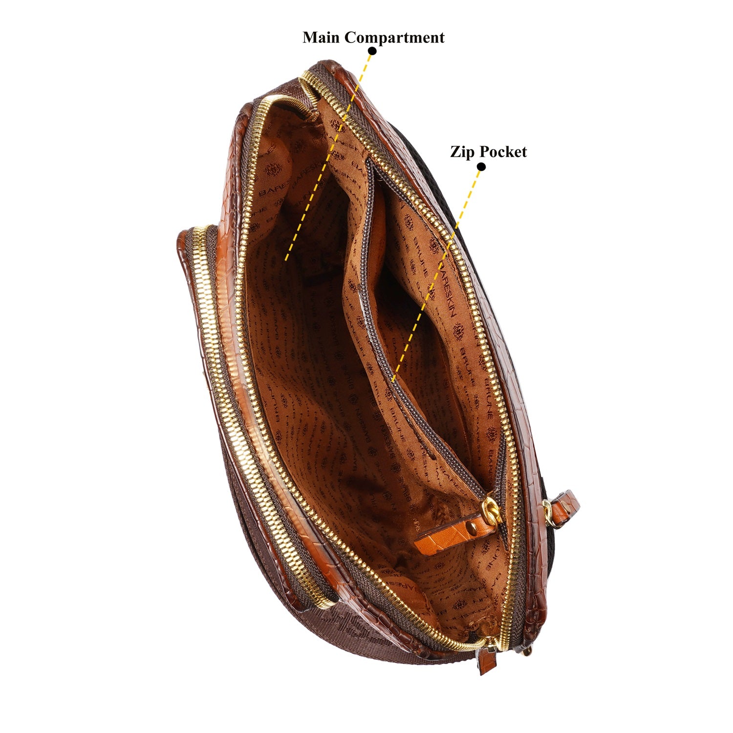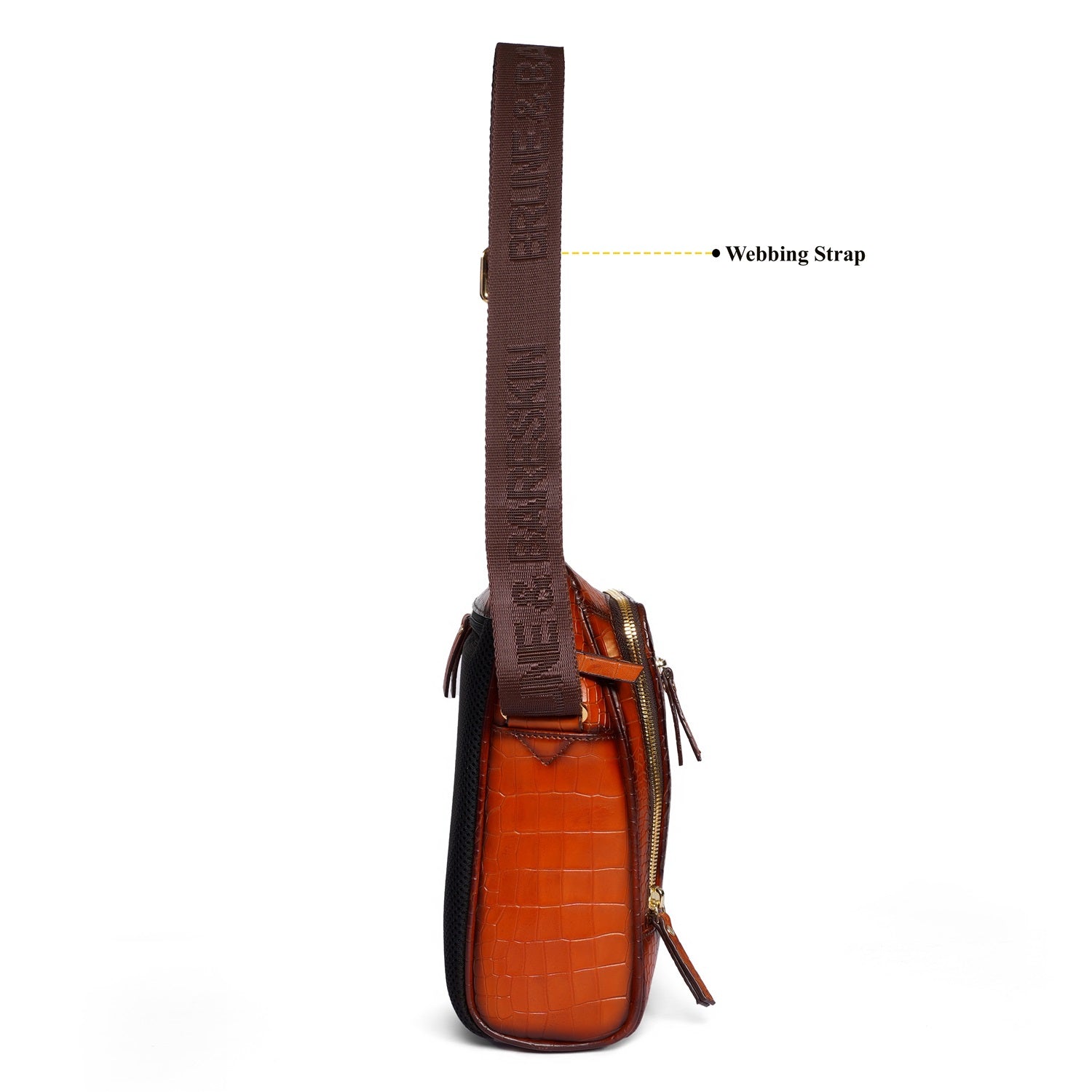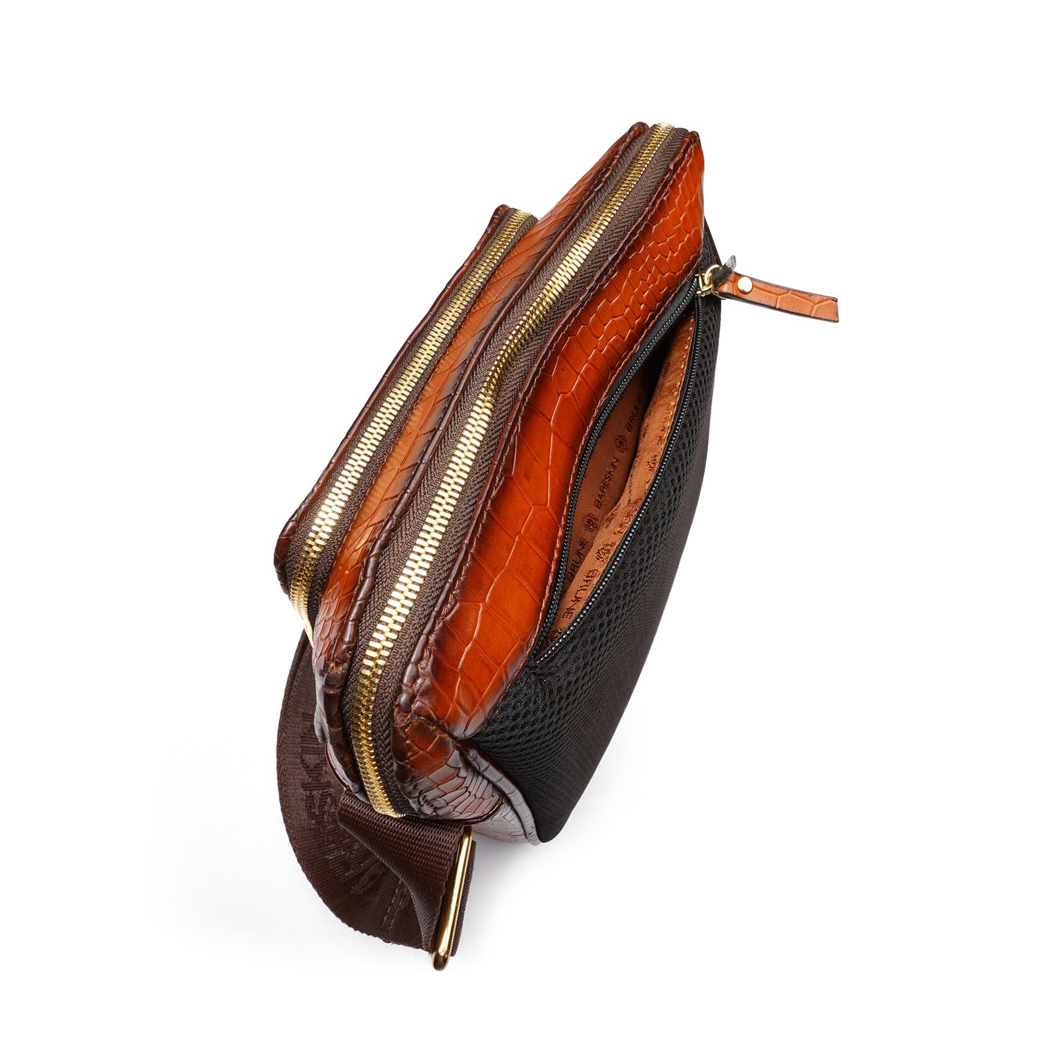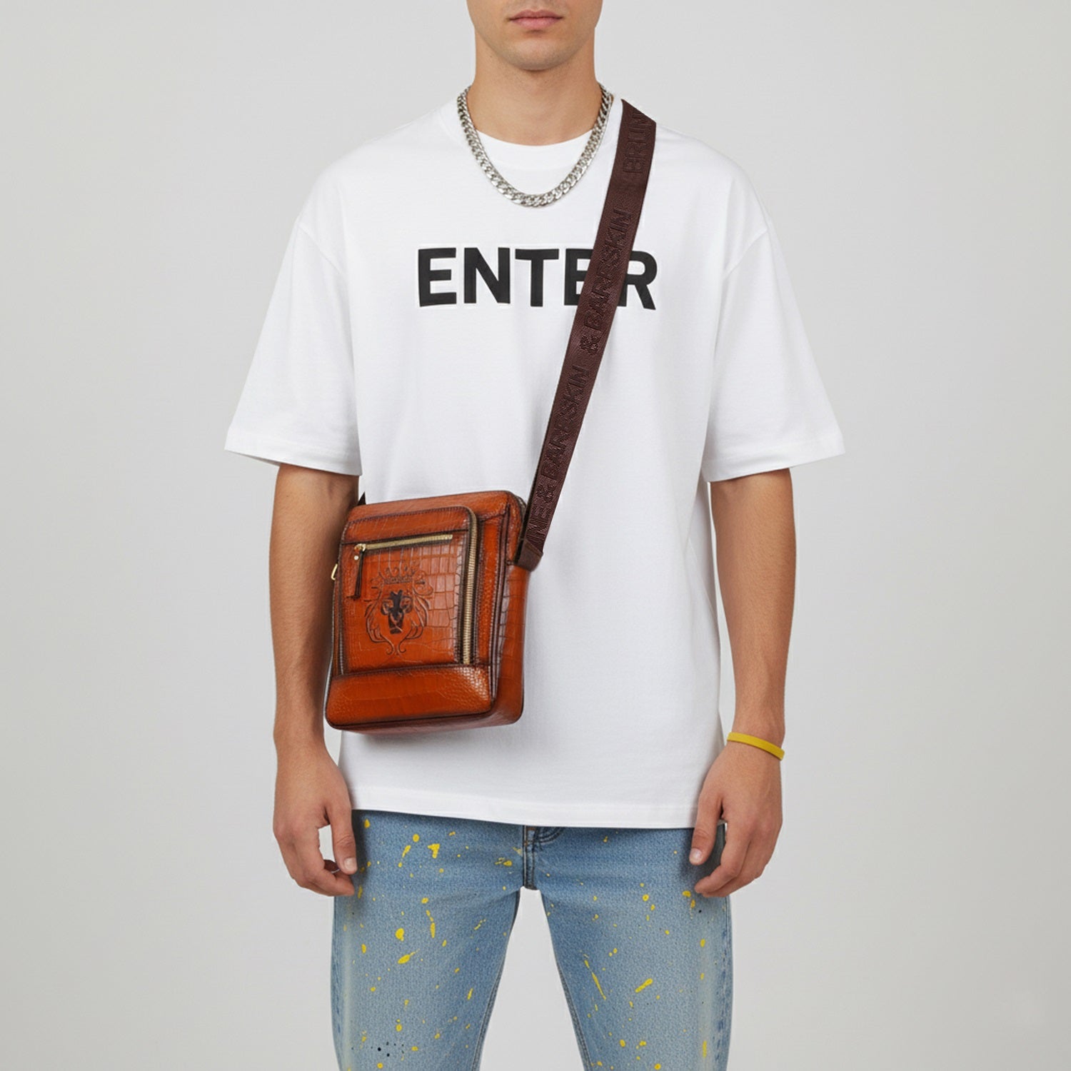 Deep Cut Croco Fanny Pack Bag In Tan Leather with Embossed Lion