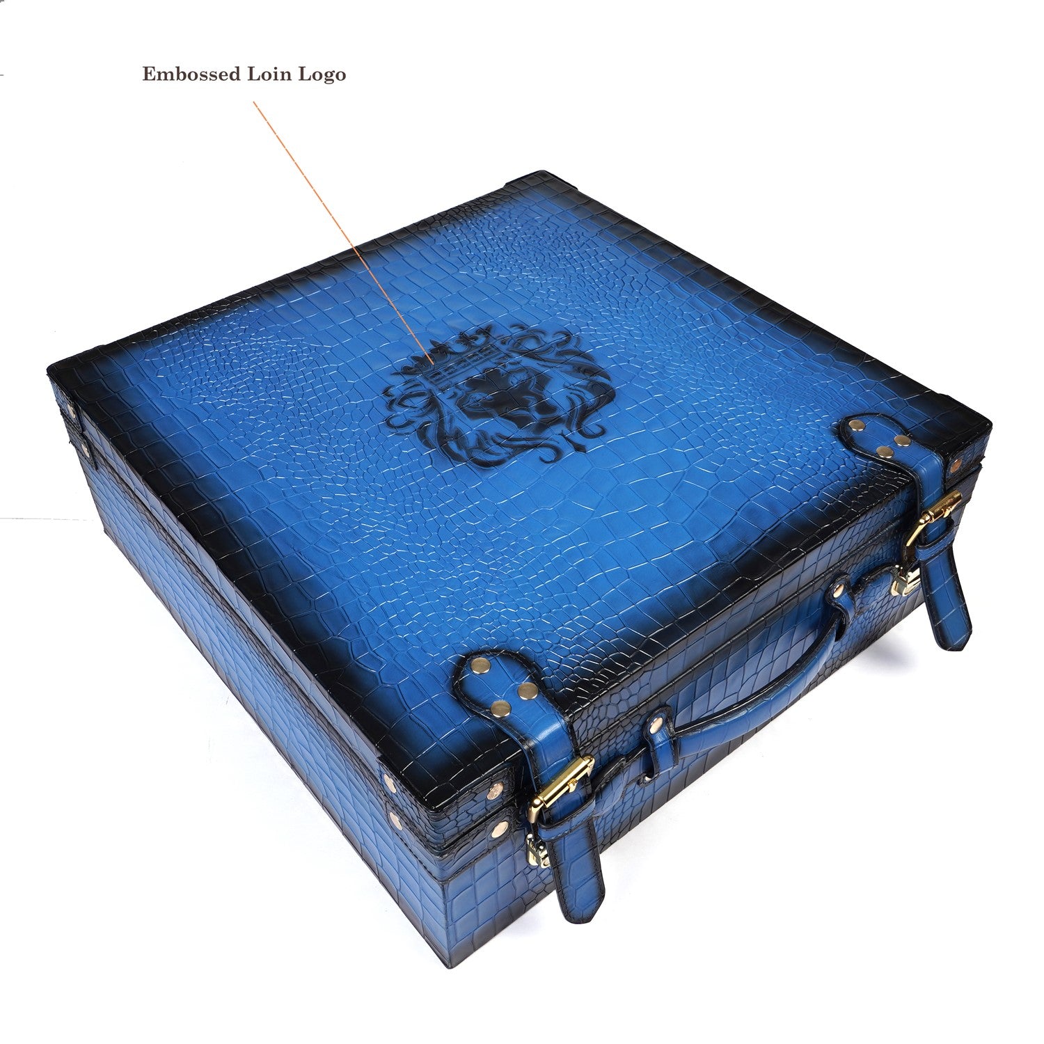 Introducing the Luxurious Shoe Case in Deep Cut Croco Leather - the perfect accessory for your wardrobe. Crafted from high-quality leather with a patina finish and embossed lion logo, this organized shoe case offers both style and practicality. The dual mechanism push button lock and extra security ensure your shoes stay in place, while the inner side velvet lining and You can carry it easily with perfect size carry handles. Keep your shoes protected and look stylish while on-the-go with this Blue colored shoe case from the renowned brand Brune & Bareskin. You can get it customized with your name initials with our bespoke services.