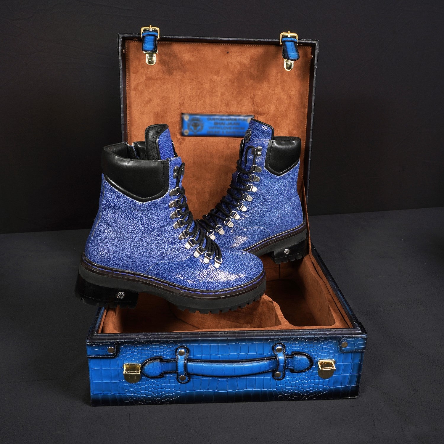 Deep Cut Croco Leather Shoe Case in Blue with Golden Detailing