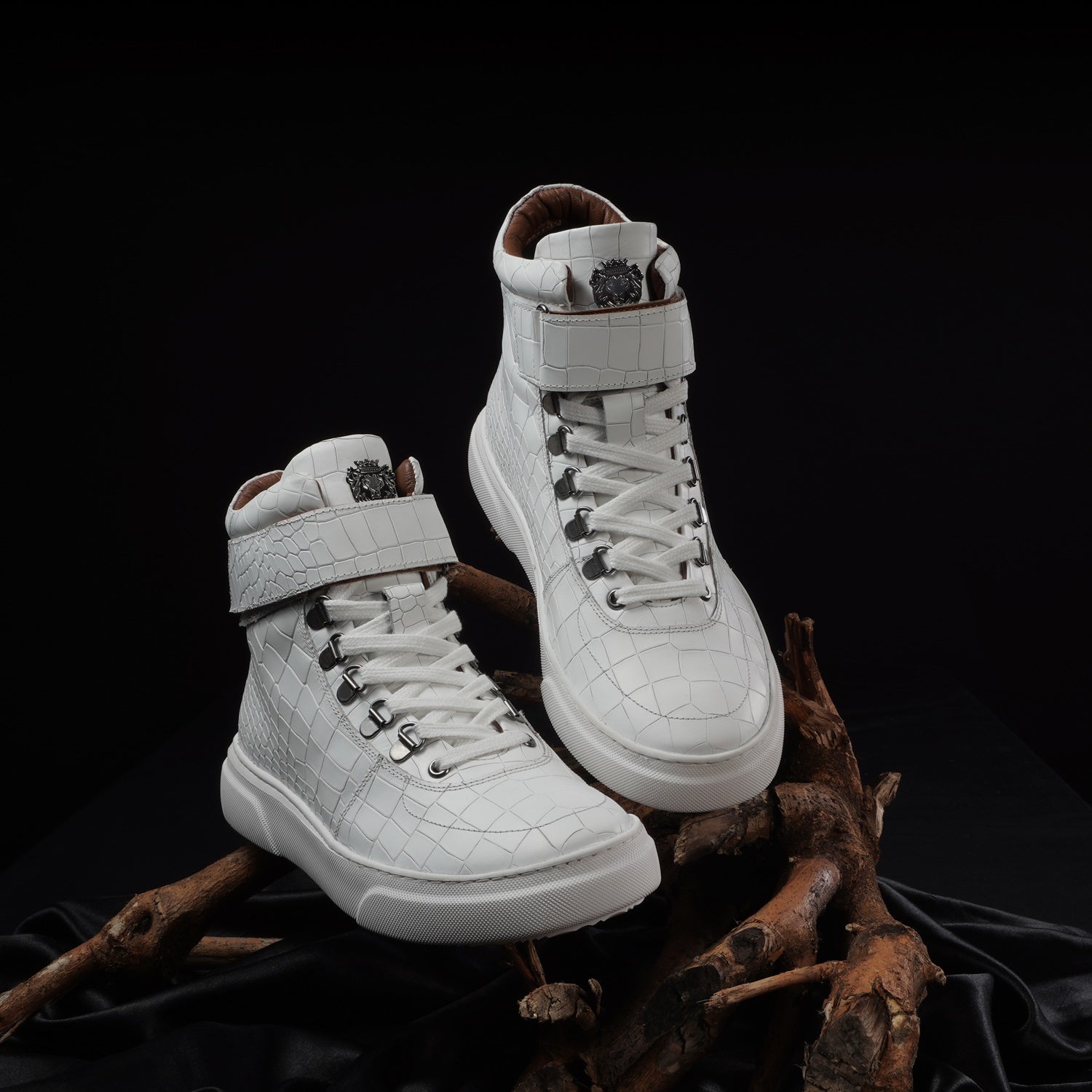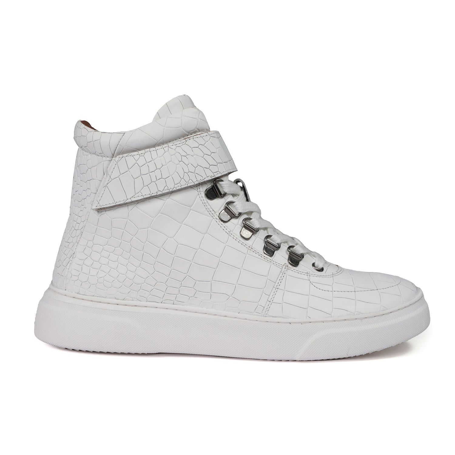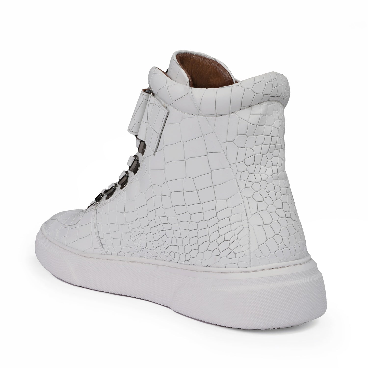 Deep Cut Croco White Leather Lace Ups with Adjustable Leather Strap Mid-Top Sneakers