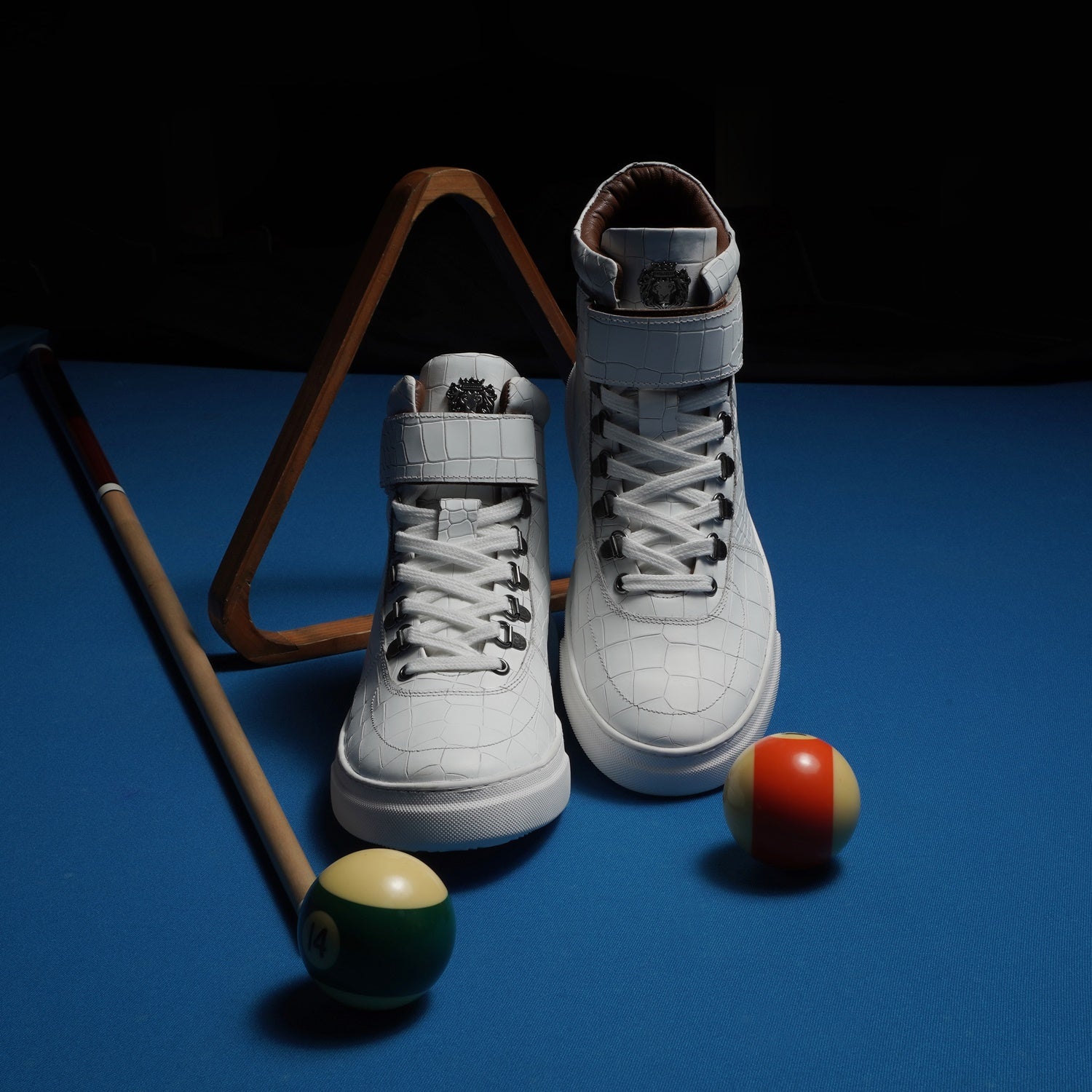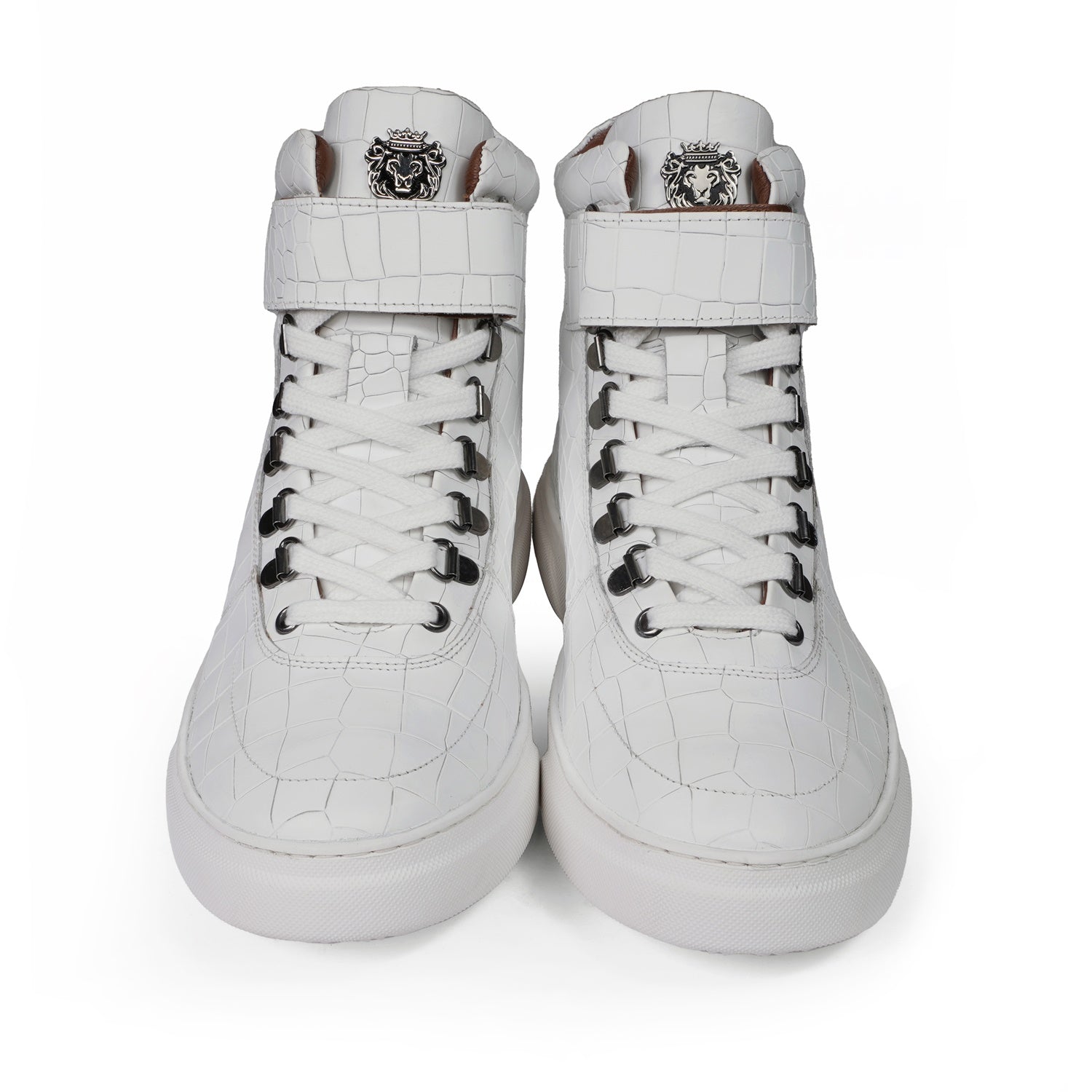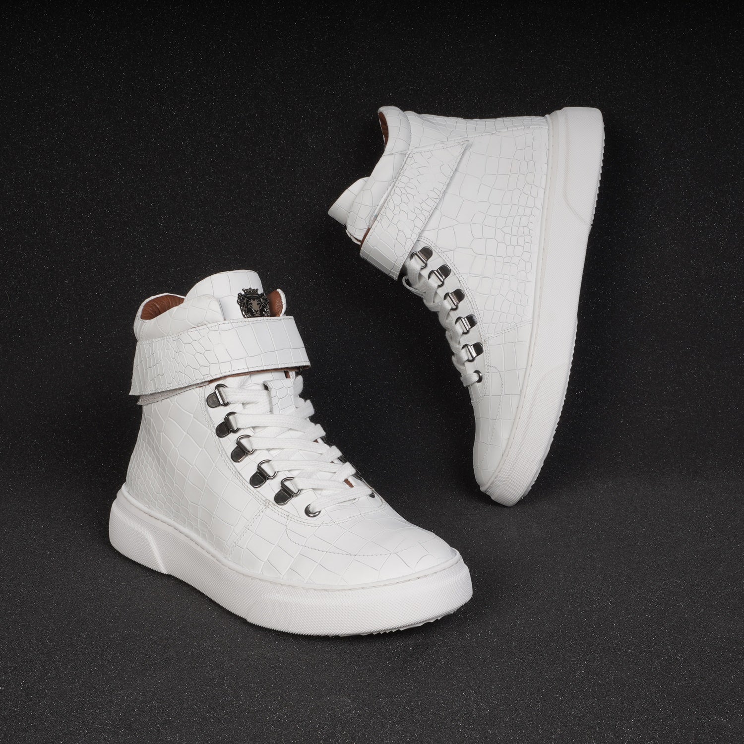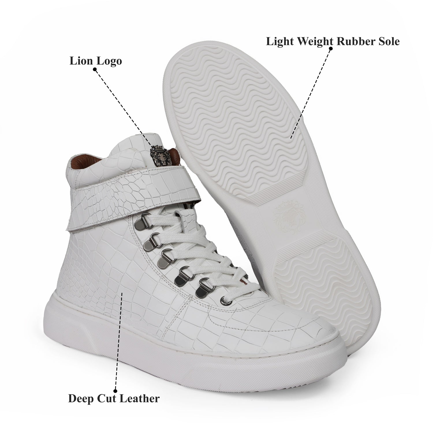 Deep Cut Croco White Leather Lace Ups with Adjustable Leather Strap Mid-Top Sneakers