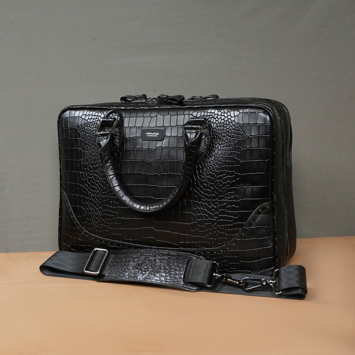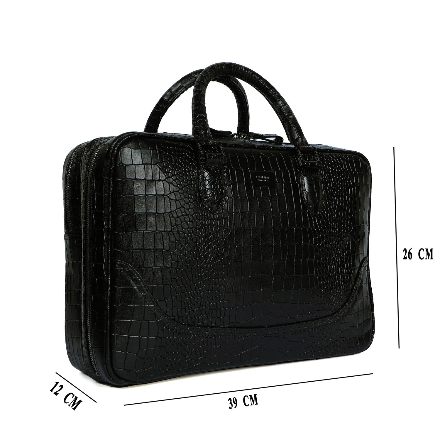 Get the style and convenience at the same time with this Brune & Bareskin Laptop/Office Bag. The genuine leather provides the durability which is hard to find anywhere else. The smokey black croco textured leather office laptop briefcase provides the perfect gentleman look. The punching brogue detail on front make it more elegant. It has a dedicated laptop sleeve inside with the ultra soft lining along with pockets for your charger or other accessory and a back zip compartment for holding your paper works safely. The end to end zip closure provides the extra ease to access the stored stuff. Due to an extra compartment It provides ample space and multiple small pockets in main compartment. The adjustable shoulder strap connects and removes easily with the hidden hardware loops. A perfect bag for a perfectionist gentleman to organize his daily on goings in his way. It is a perfect bag for today's fast office life.