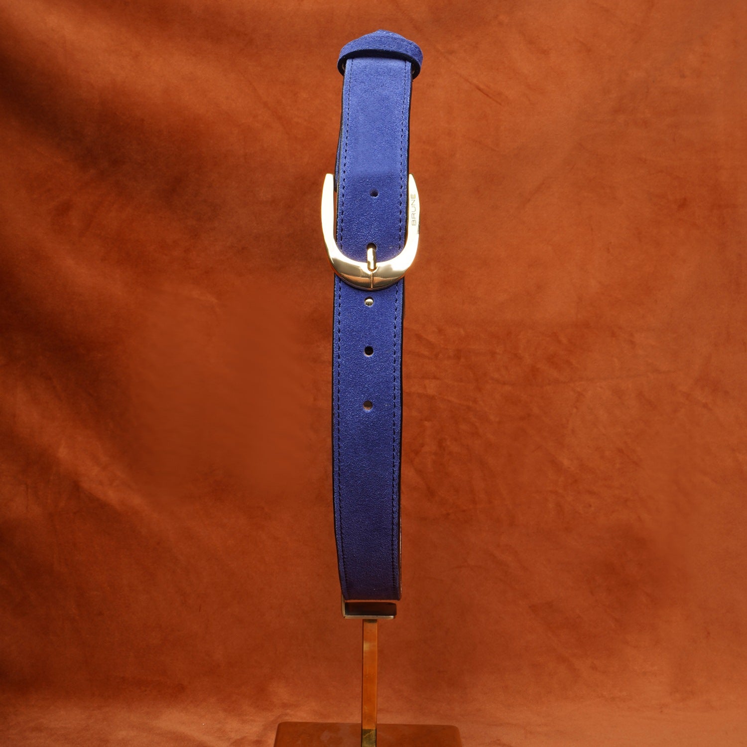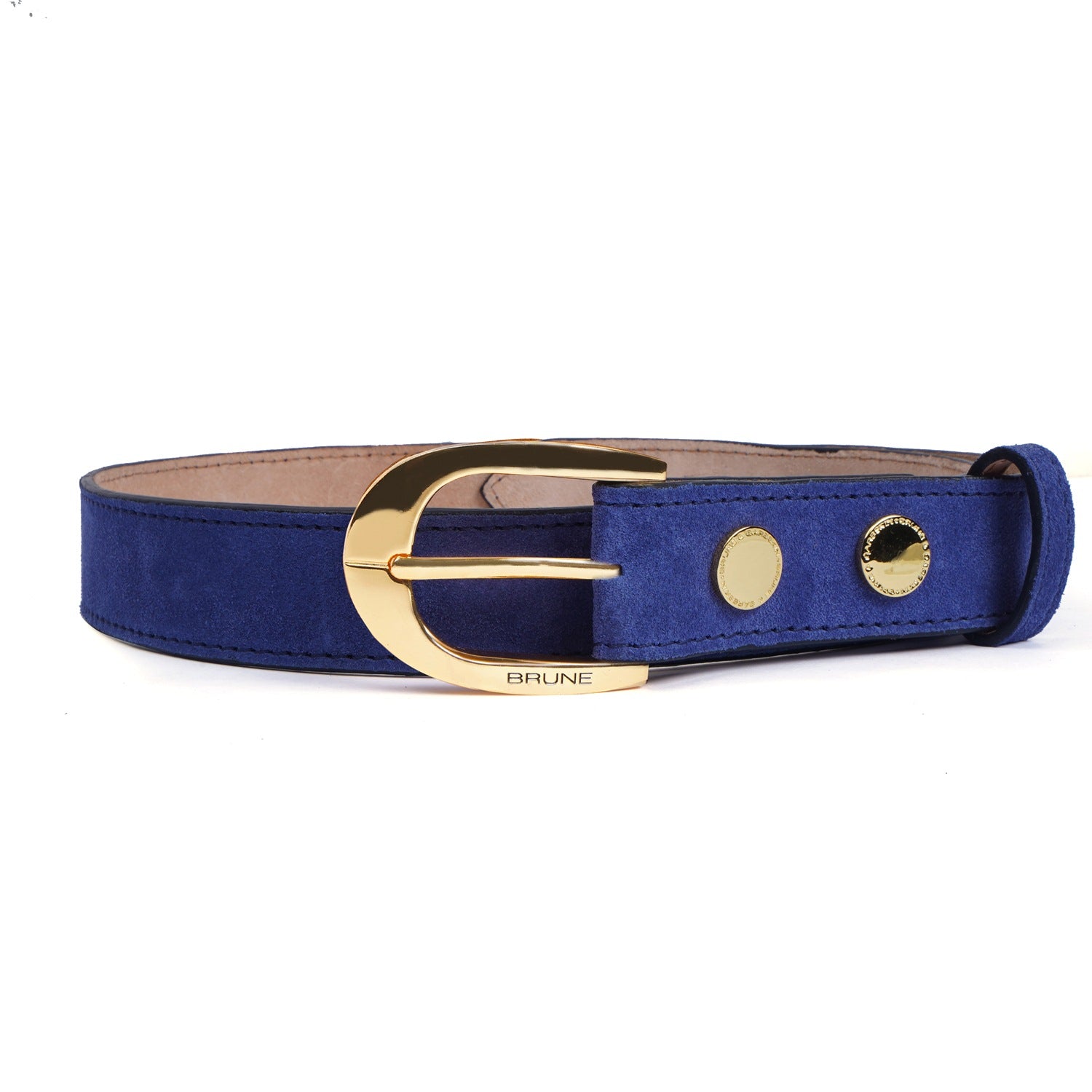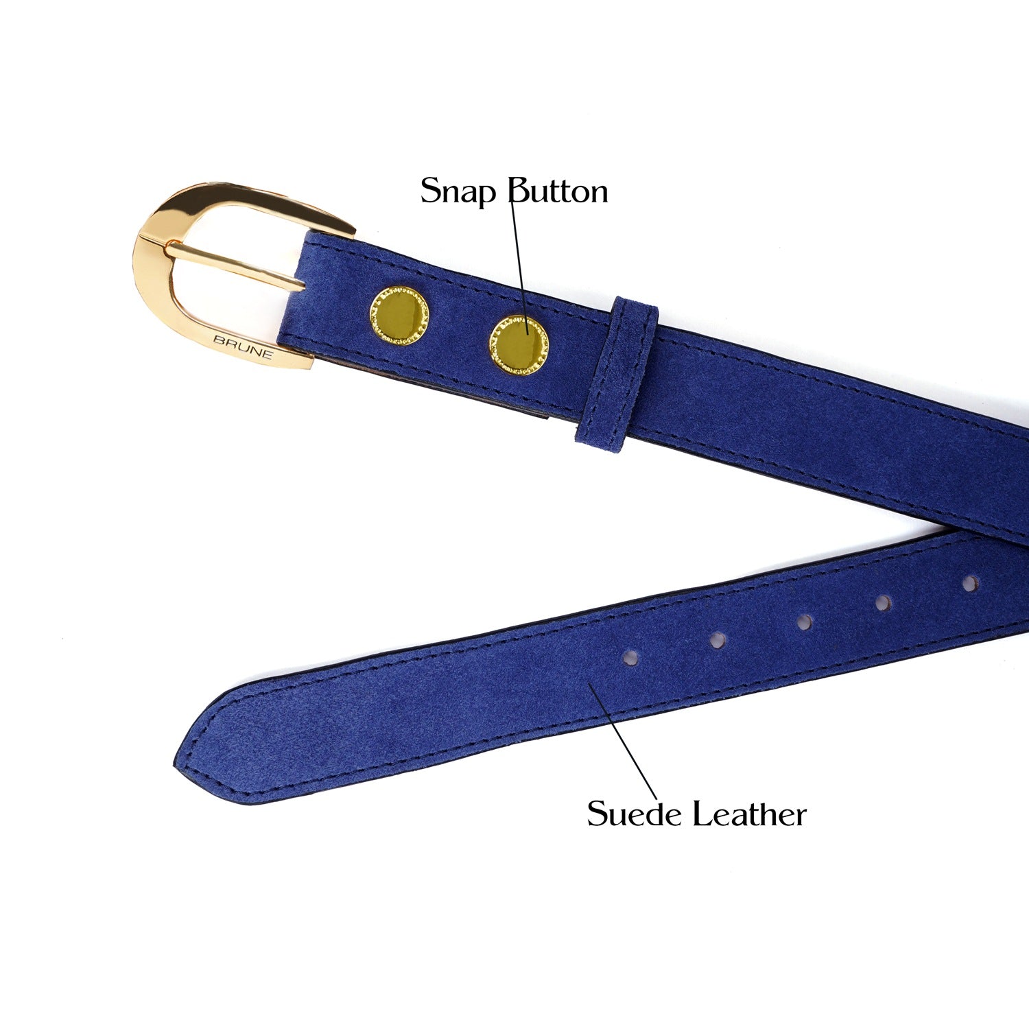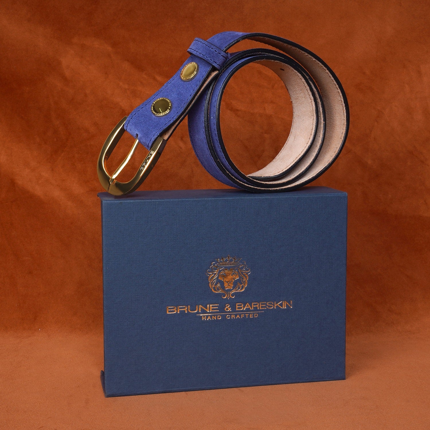 This luxurious piece is crafted with blue suede leather, hand-stitched for durability, and features a gold finish oval-shaped metal buckle with the brand, Brune & Bareskin. Its double snap button closure and detachable buckle strap make it a versatile choice for both formal and everyday wear, giving you the option to easily change the buckle. Elevate your style with this detachable buckle belt in blue suede leather.