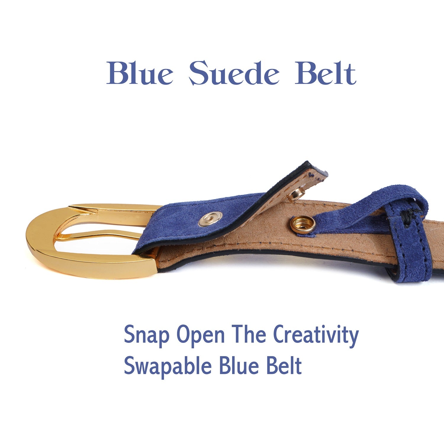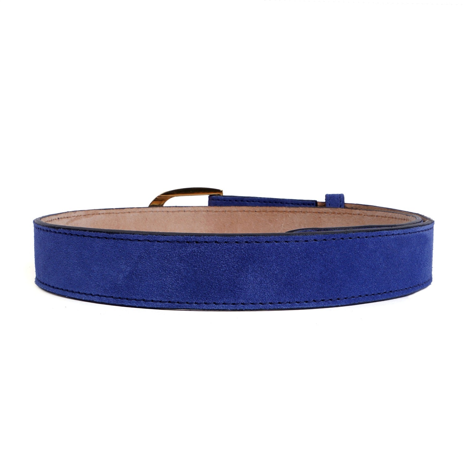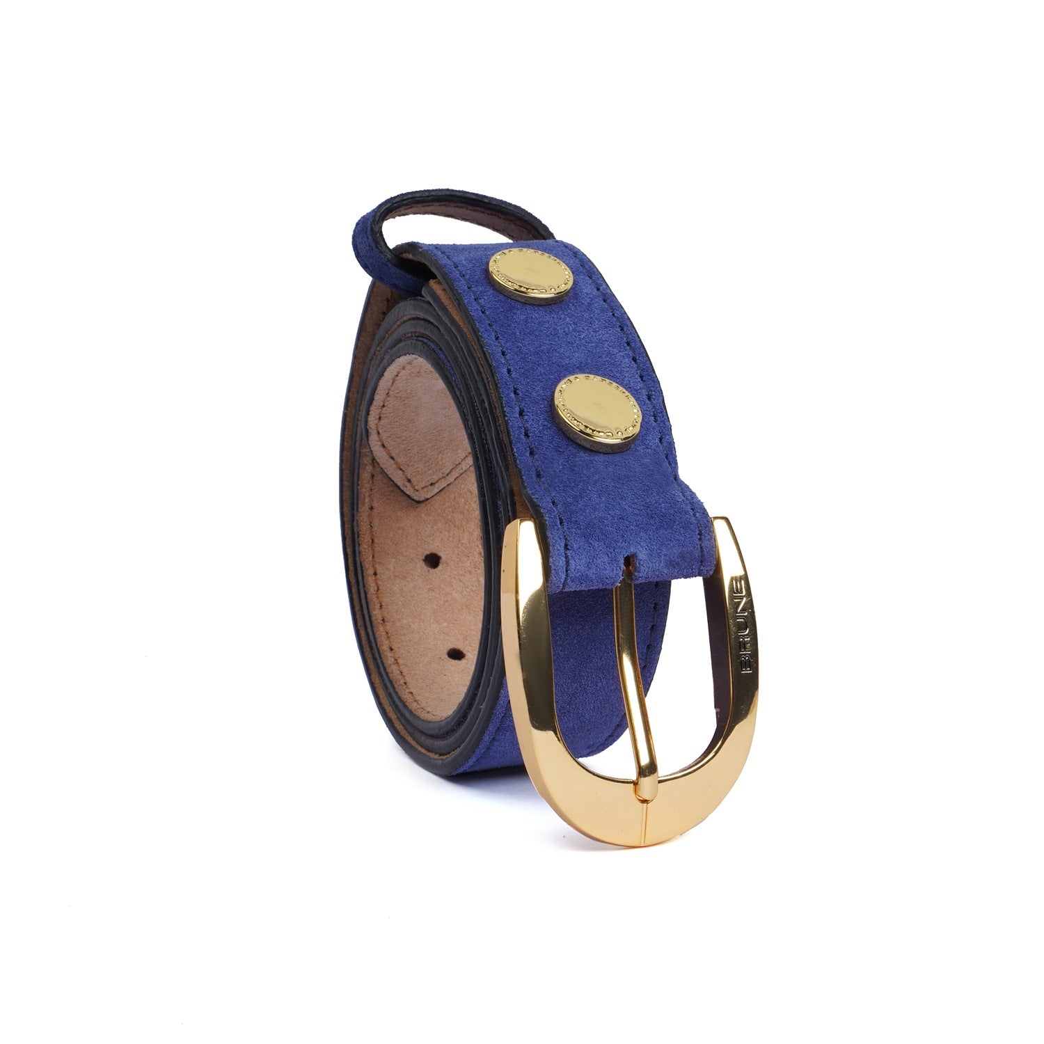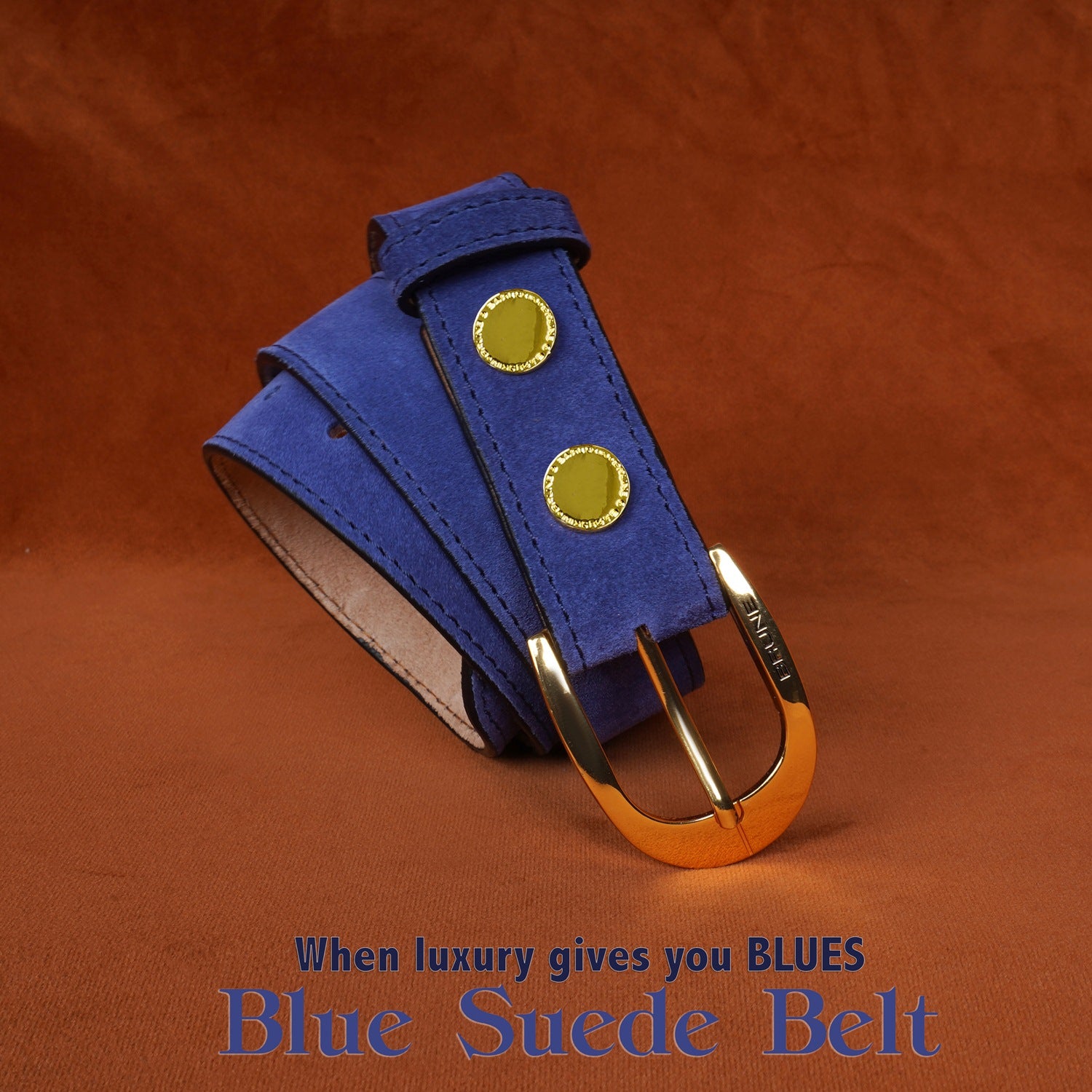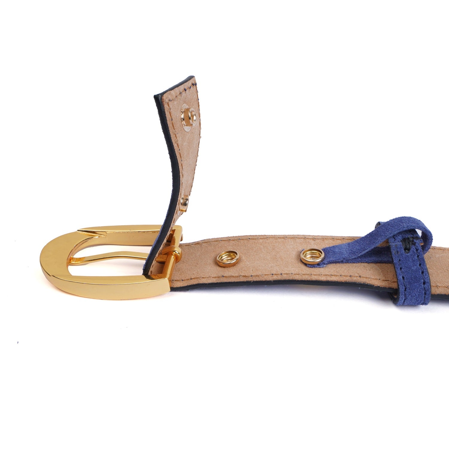 This luxurious piece is crafted with blue suede leather, hand-stitched for durability, and features a gold finish oval-shaped metal buckle with the brand, Brune & Bareskin. Its double snap button closure and detachable buckle strap make it a versatile choice for both formal and everyday wear, giving you the option to easily change the buckle. Elevate your style with this detachable buckle belt in blue suede leather.