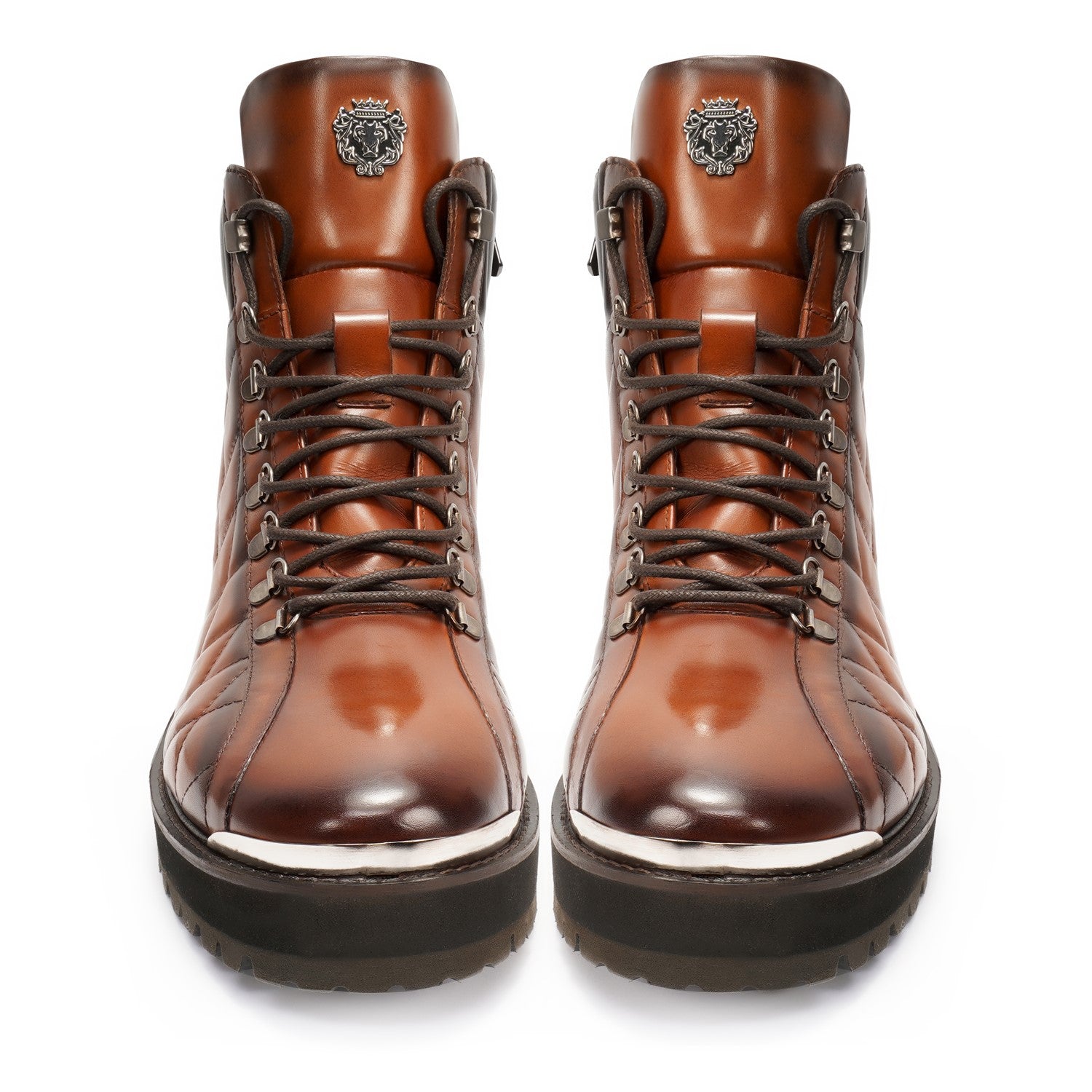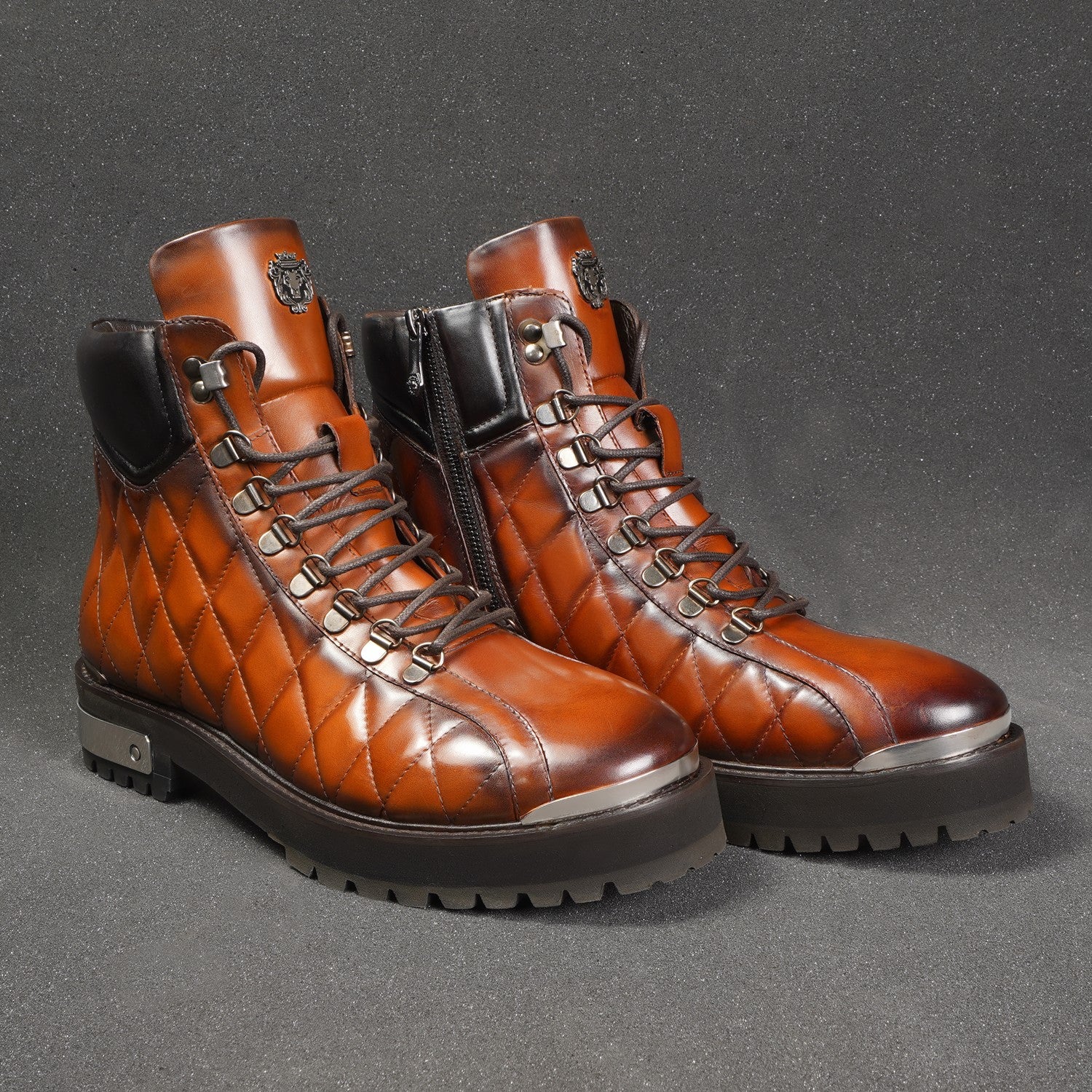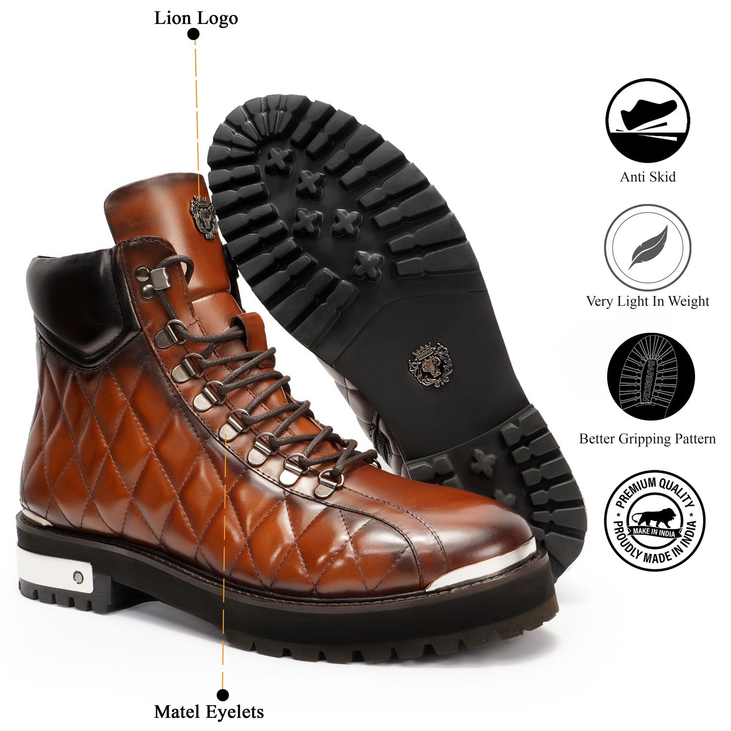 Look no further than the Light-Weight Tan Chunky Boot by Brune & Bareskin. This premium quality boot features leather and a full heavy-duty look. The ultra light weight and lace-up closure provide both comfort and convenience. The silver finish Signature Metal Lion Logo adds a touch of luxury, while the rubberized chunky sole detailing completes the street wear look. Pair with any casual outfit for a fashionable and comfortable statement.