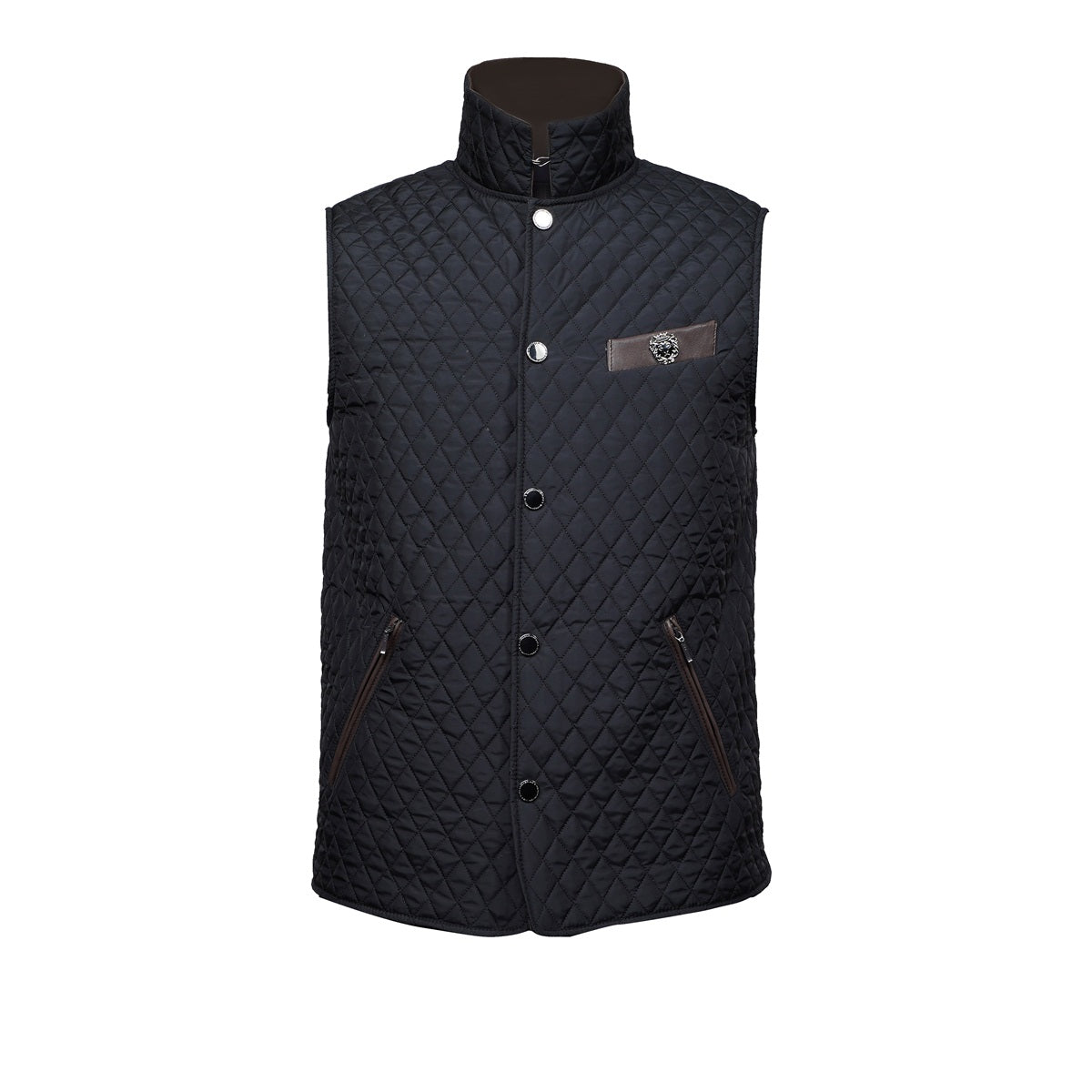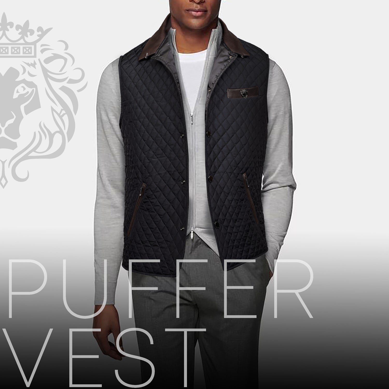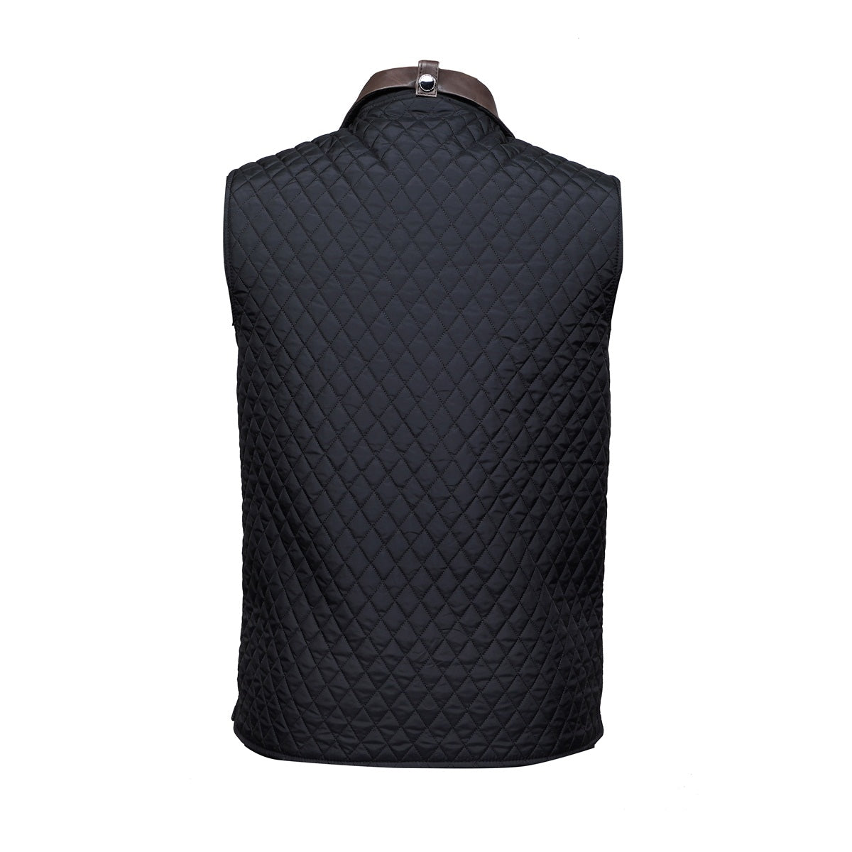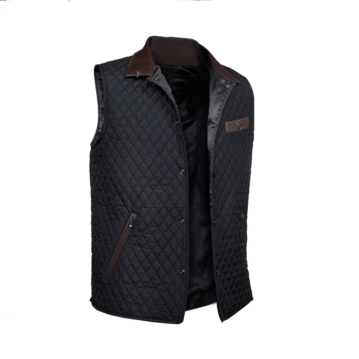 Diamond Stitched Black Puffer Vest with Dark Brown Leather Trims Collar & Pockets