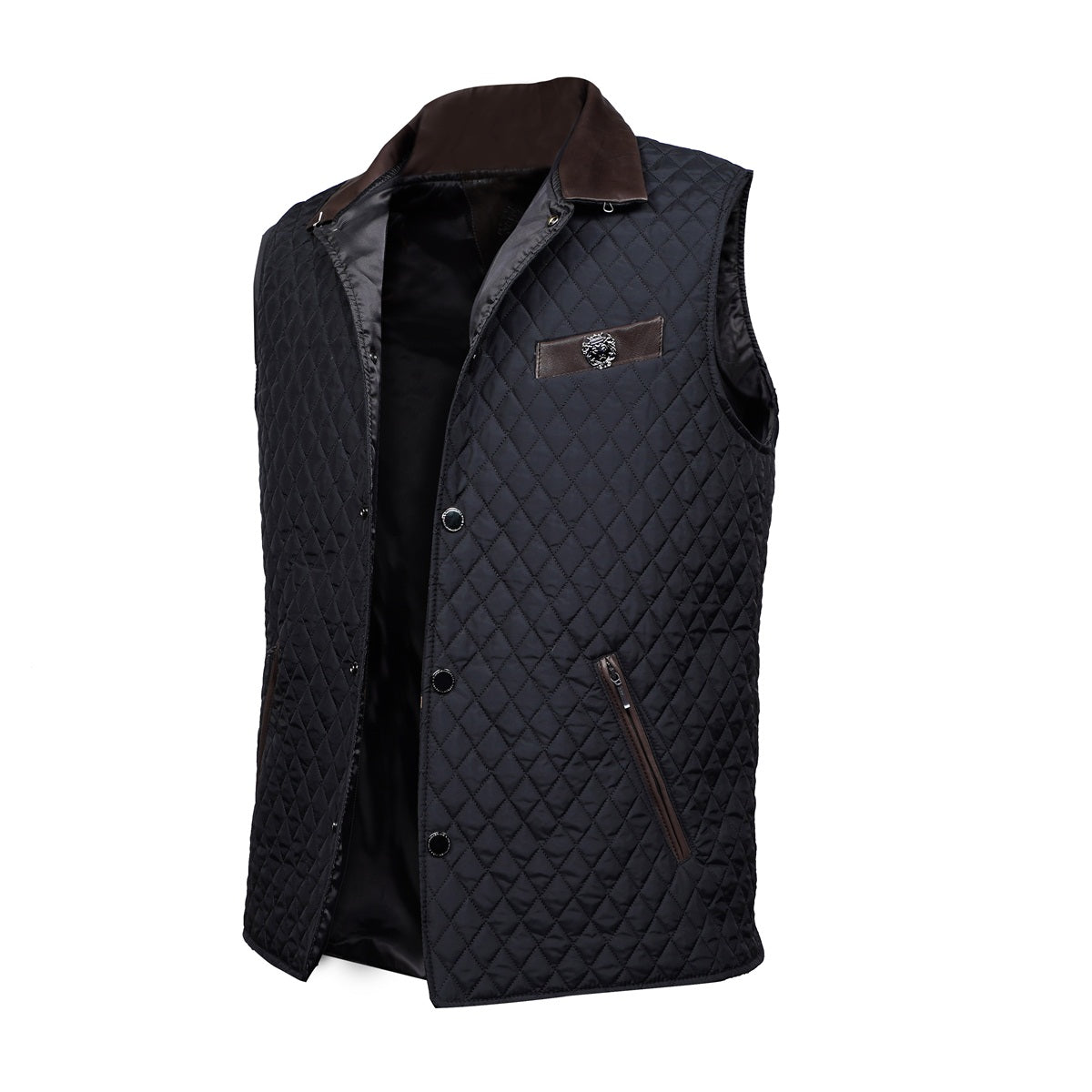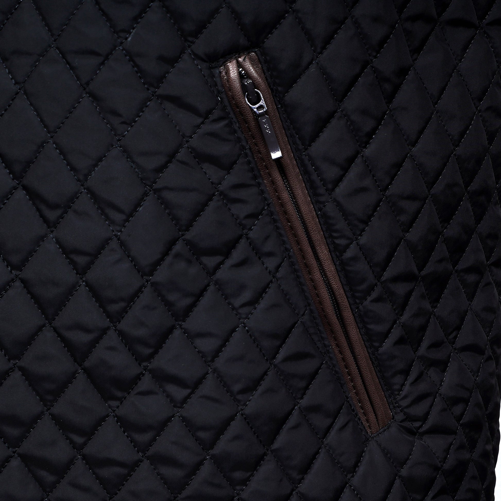 This light weight jacket is crafted to provide the warmth in this winter season. The contrasting dark brown leather trims on black diamond stitched jacket enhances the grace further. Snap buttons closure on front ensures the easy access while wearing. Snap buttons also adds the style element while keeping the vest open.