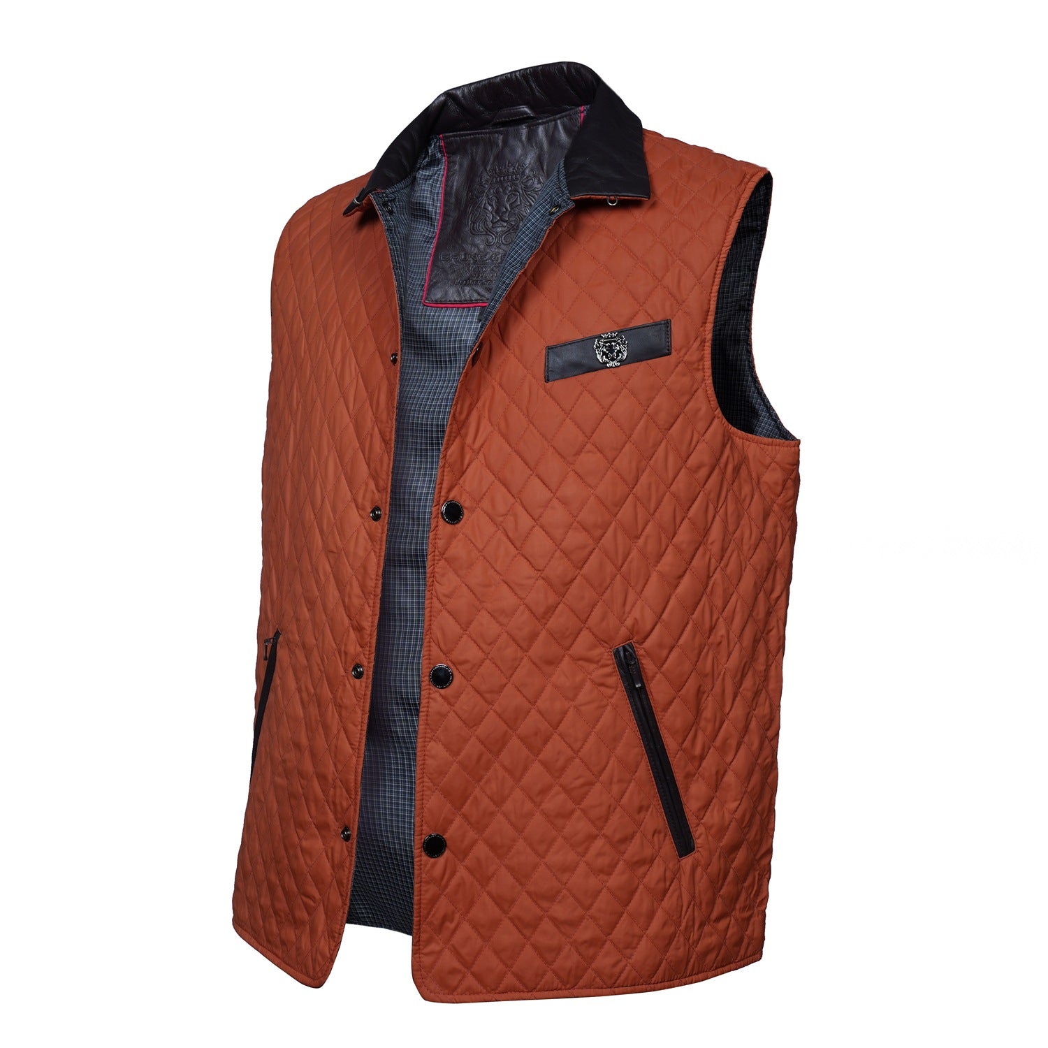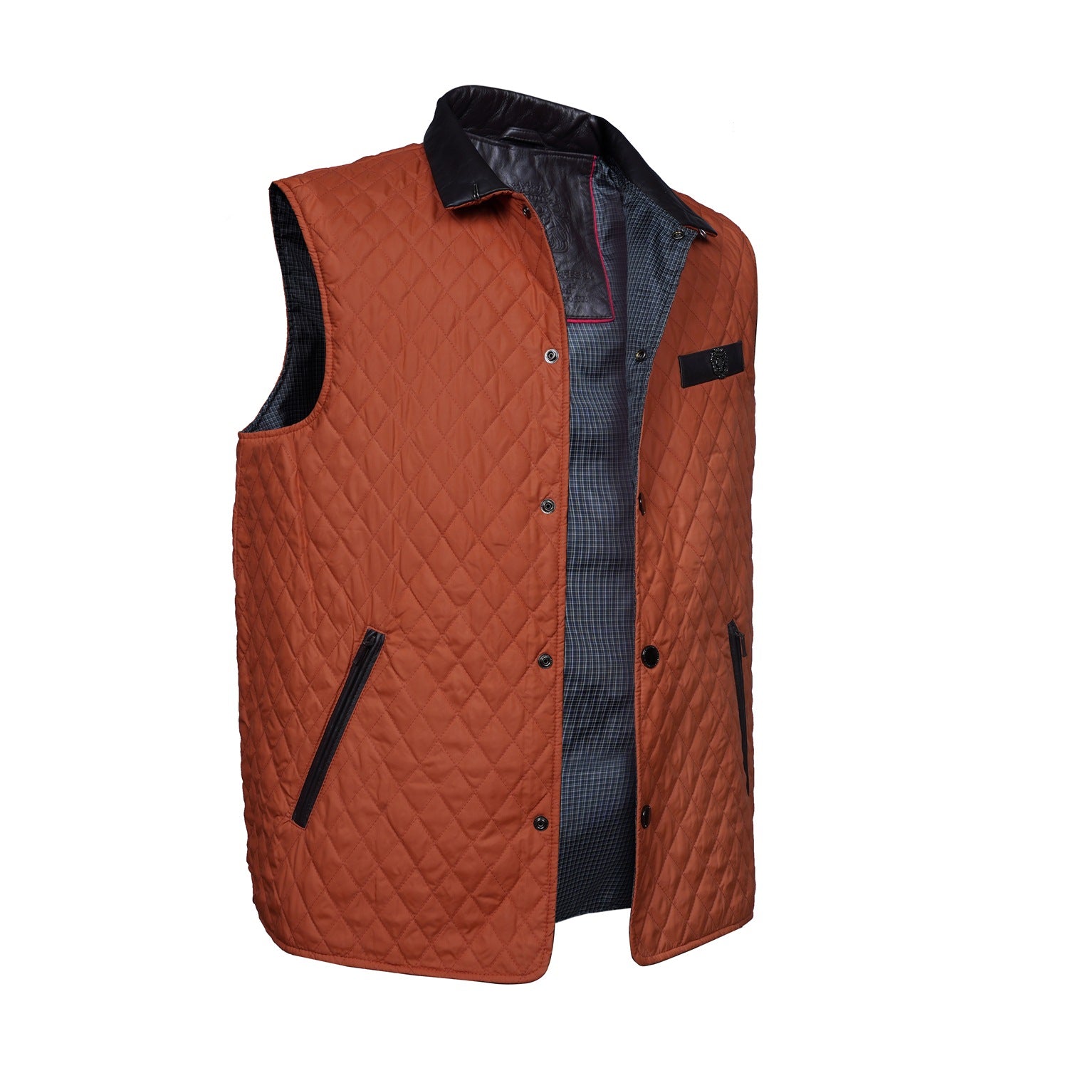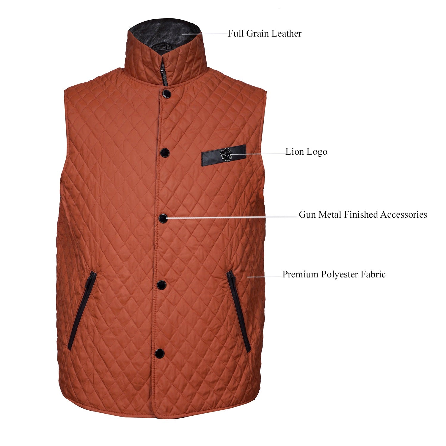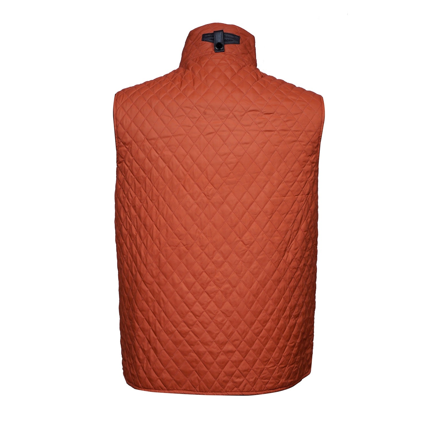 Diamond-Stitched Orange Puffer Vest with Leather Trimmed Collar