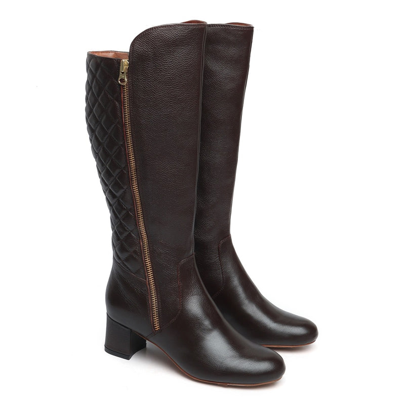 Girls are always fascinated by luxurious footwear for their Functions & get-together. This Tan handmade rounded toe Long Boot spells the fashion quotient on every event. Blocked Heel from brune & bareskin featuring a Rounded toe, Diamond stitched design, zip closure and a branded insole. The subtle tan finished leather looks amazing. This look is to provide the chic presence. The long zipper closure on outer side boot and diamond stitched pattren on back side of the boot provides the smooth plain feel with ease to access. The high long length ensures to look good from casuals to formal attires It is the perfect footwear to gift to that perfect woman in your life. This ladies long boot is Perfect for pairing with jeans, shorts, slacks, skirts, and midi dresses in your wardrobe.