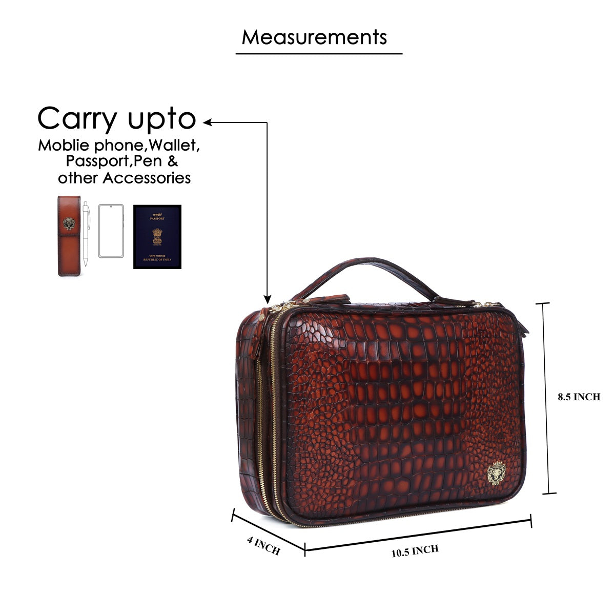 This Double Compartment Kit Bag in Tan Leather is a perfect travel essential for your adventures. This exquisite handcrafted bag is made with the finest Smokey finish tan deep cut croco textured leather detailing, enhanced with a hand-painted patina technique. With spacious pockets and wide opening, the bag offers dual zip compartments and elastic holders with mesh pockets to securely carry all your essentials. Plus, you can customize it with your name initials to match your other travel bags. This kit bag is the perfect accessory for your travel duffle, backpacks and trolleys.