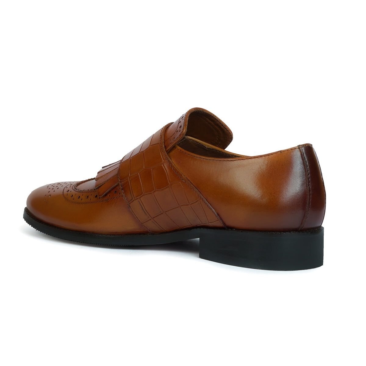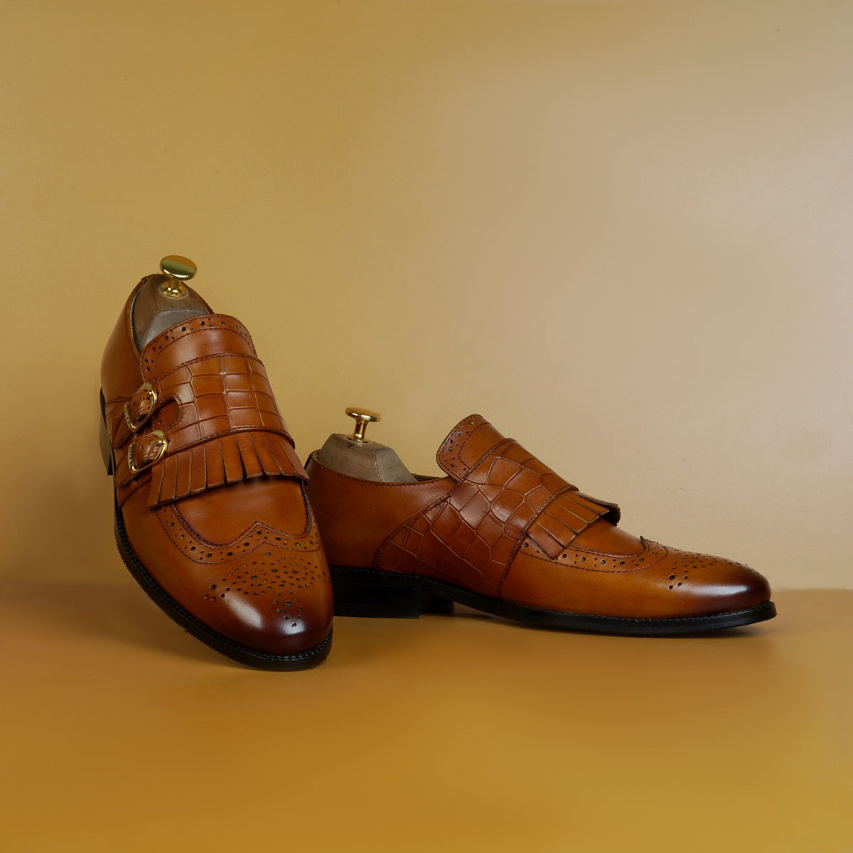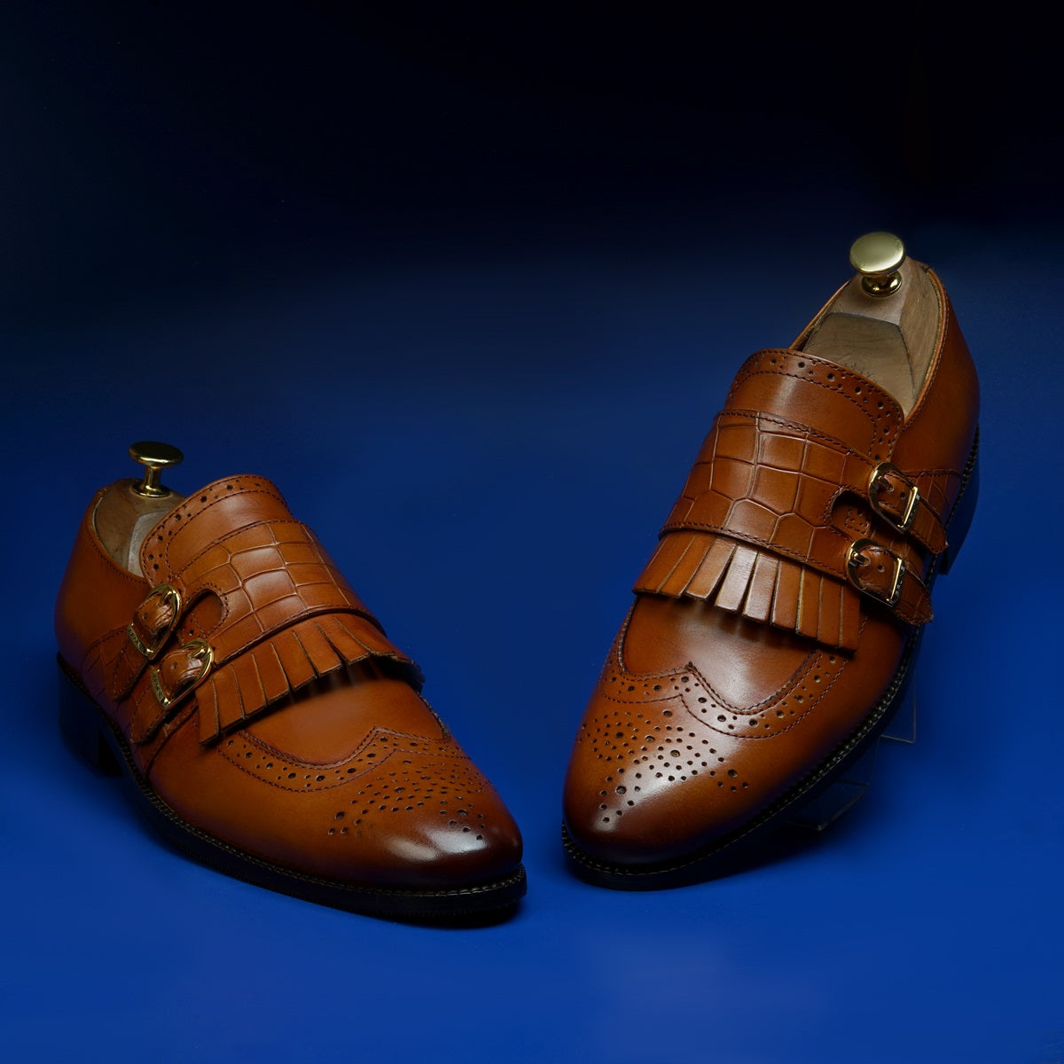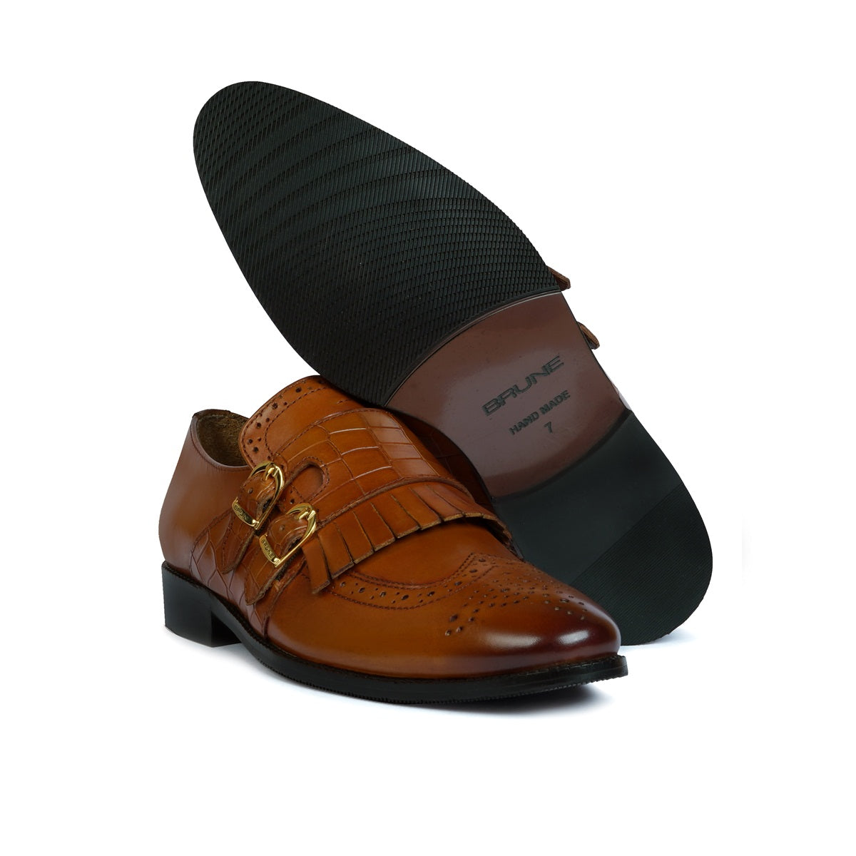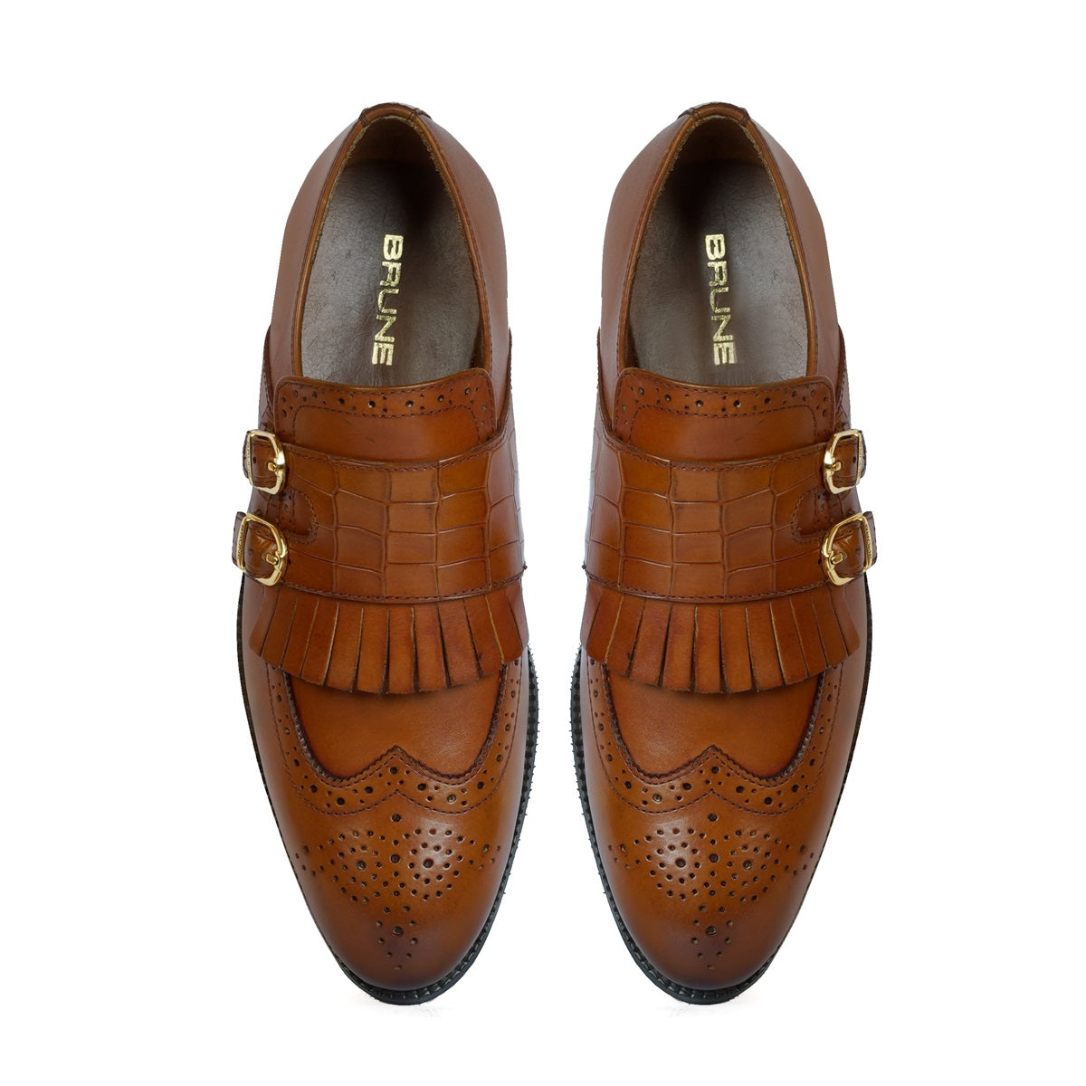 Double Monk Buckled Punching Tan Leather Formal Shoes with Fringes Design