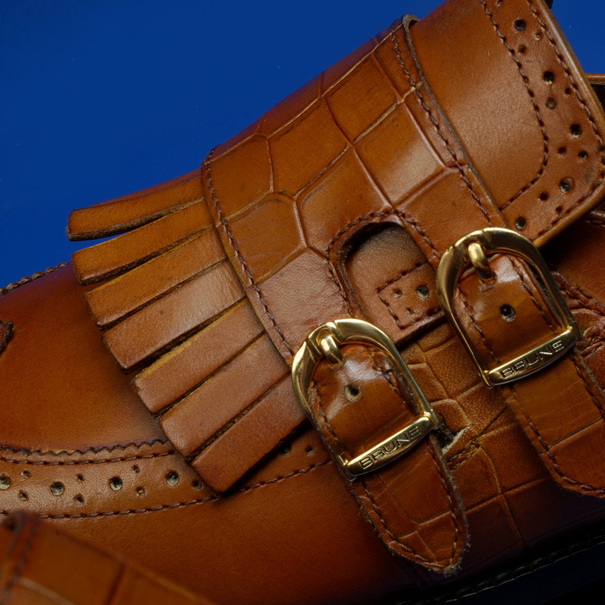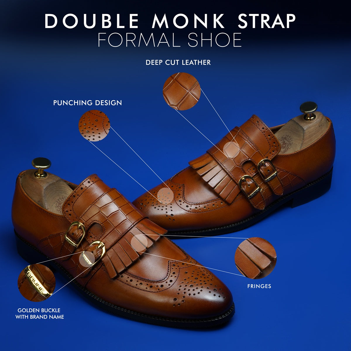 Our Luxurious Deep Cut Croco Print Leather Double Monk Strap makes a refined statement with its subtle fringes design and punching on the toe. Crafted from the finest tan leather with branded metal buckles, this polished piece features an adjustable buckle for a personalized fit. Perfect for any formal occasion, this timeless classic adds an elegant touch to any wardrobe Cushioned inner sole conveniently takes care of every step you take. The anti-skid rubberized outer sole provides a perfect grip on all the terrains.