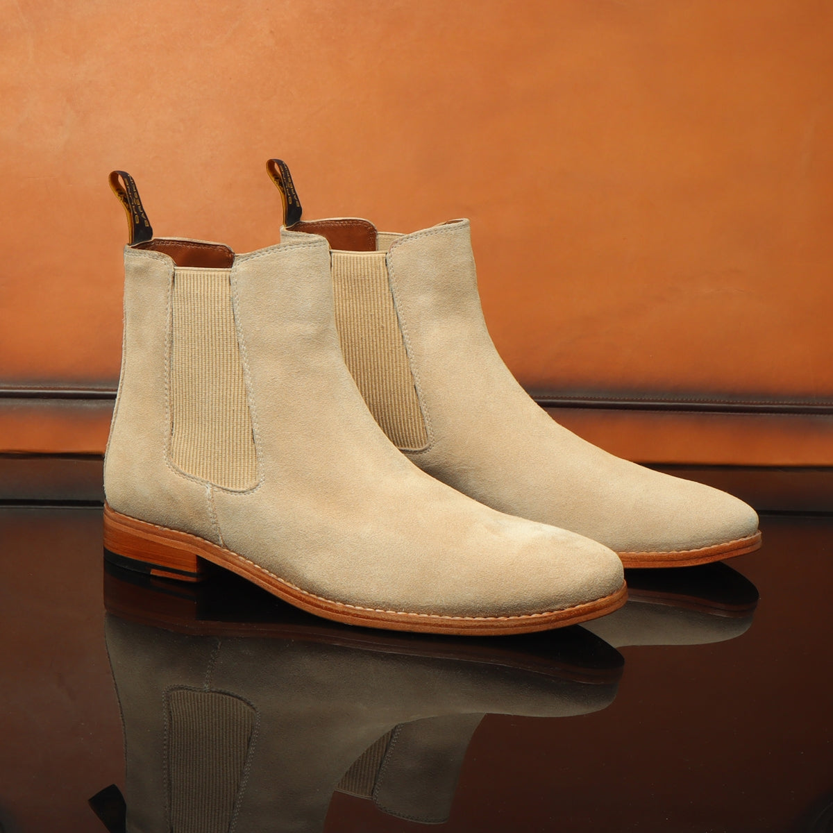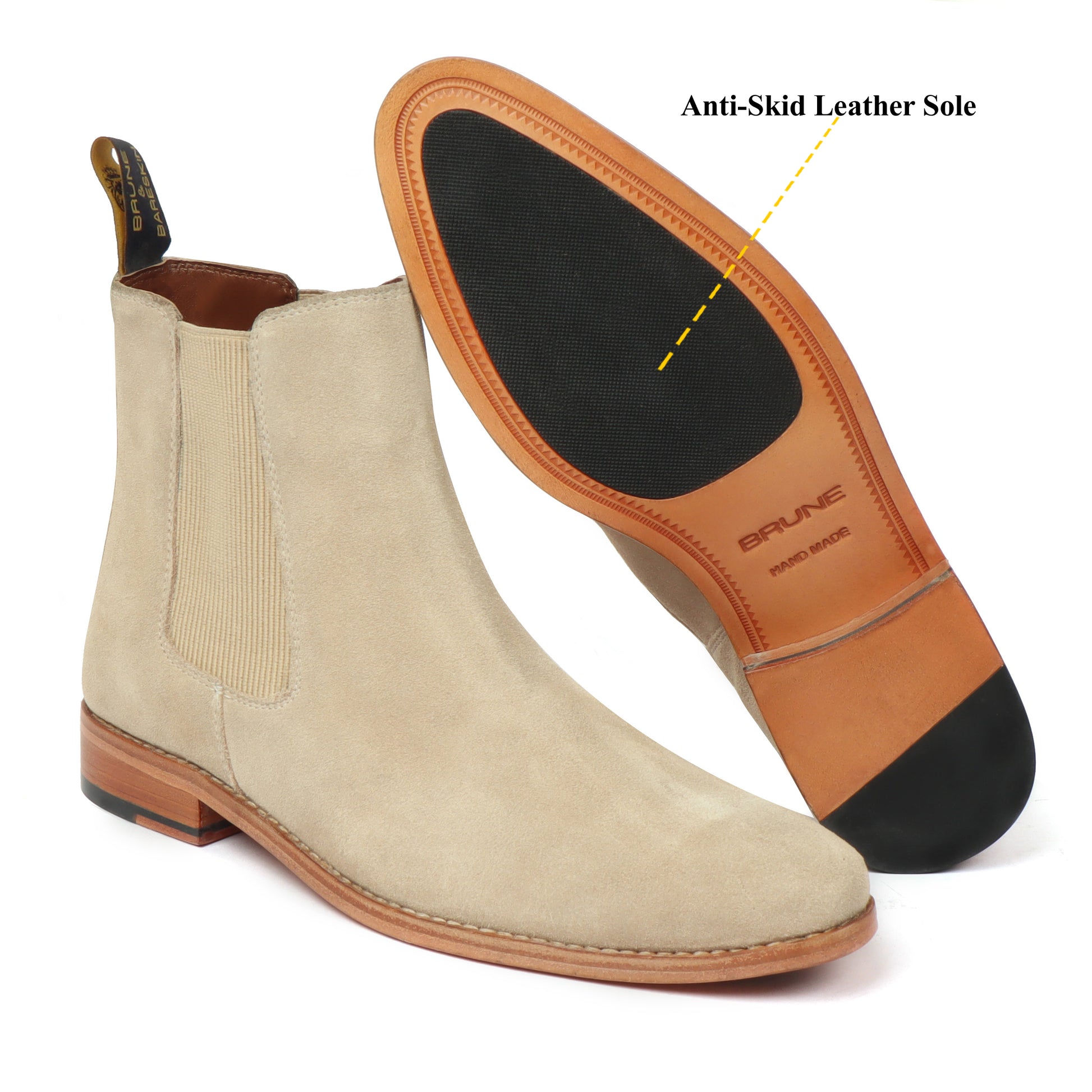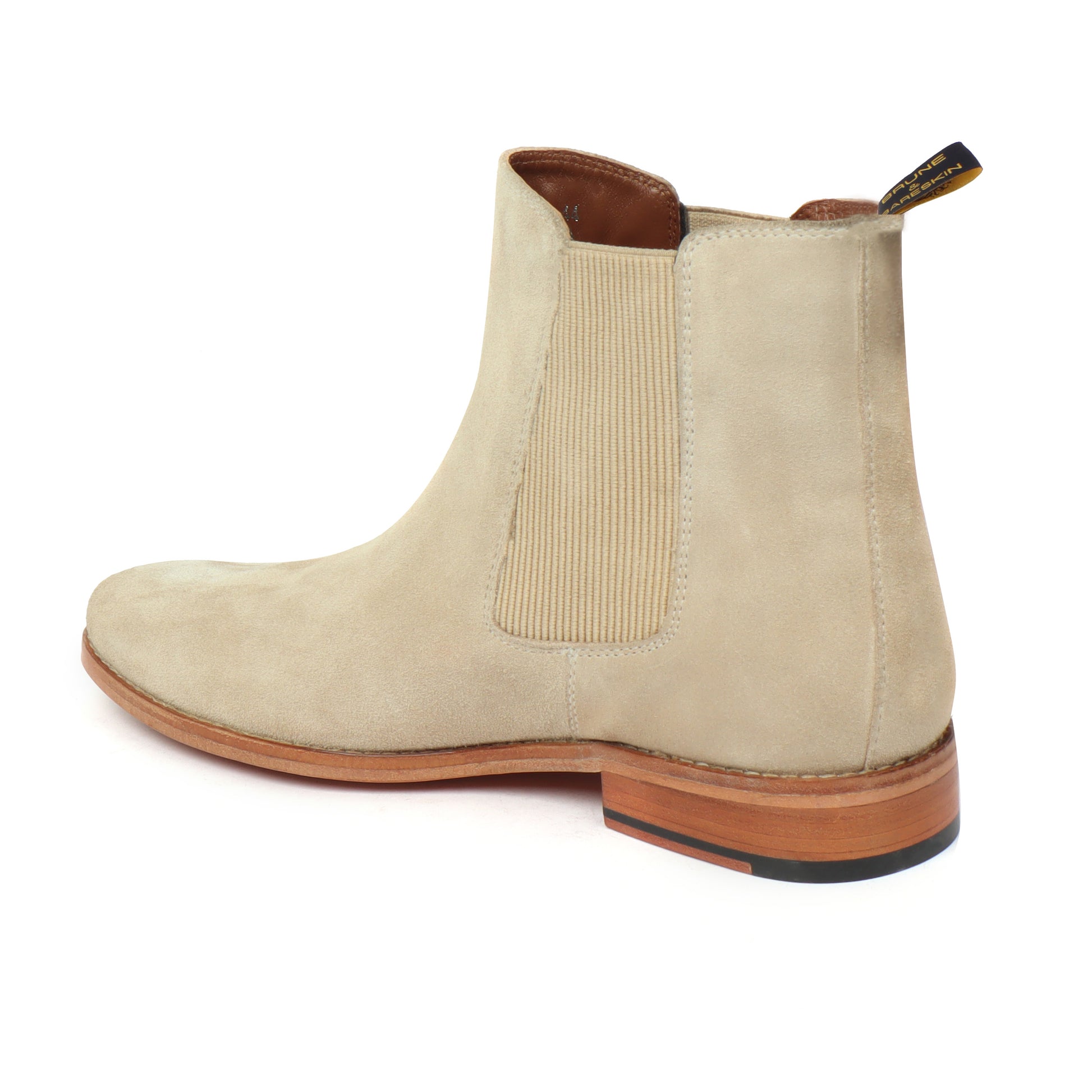 This high-ankle length Beige suede leather Chelsea Boots is a must need in your wardrobe. From the English times till today these just slow down in the fashion world. These leather boots are a perfect piece of style and trend. The Beige suede leather with leather sole looks very elegant. These ankle-length shoes are fitted shoes that emphasize the size and shape of your feet to perfection. This high-ankle length beige leather boots can be customized to your liking. The deep detailing with leather sole and the side elastic closure lend a classy look to these leather formal shoes. Wear it and make a remember-able mark of fashion. They are easy to team with formal trousers as they blend well with the classic fabrics as well as the modern blended synthetic fabric pants, slacks, trousers and boot cuts.