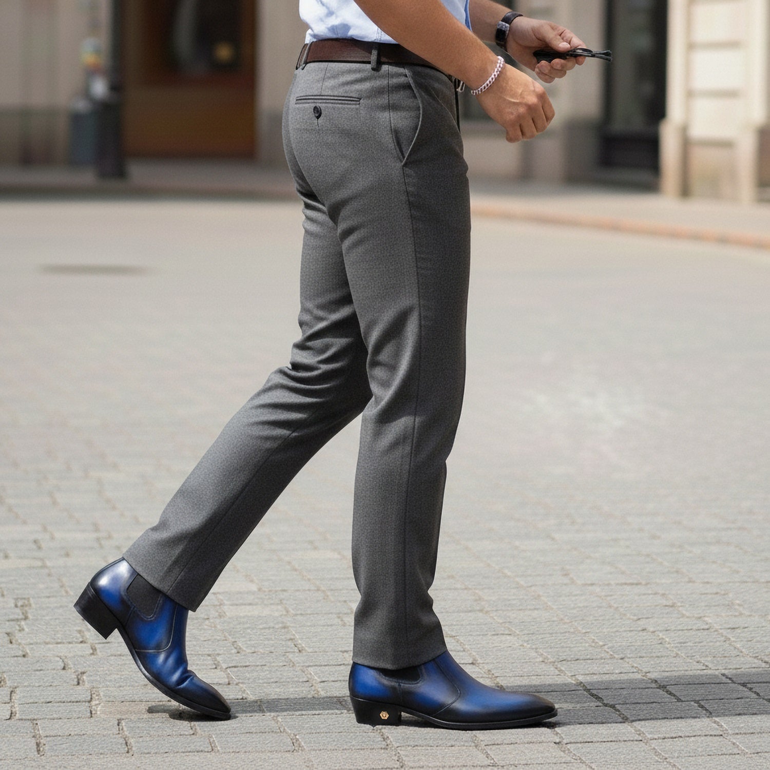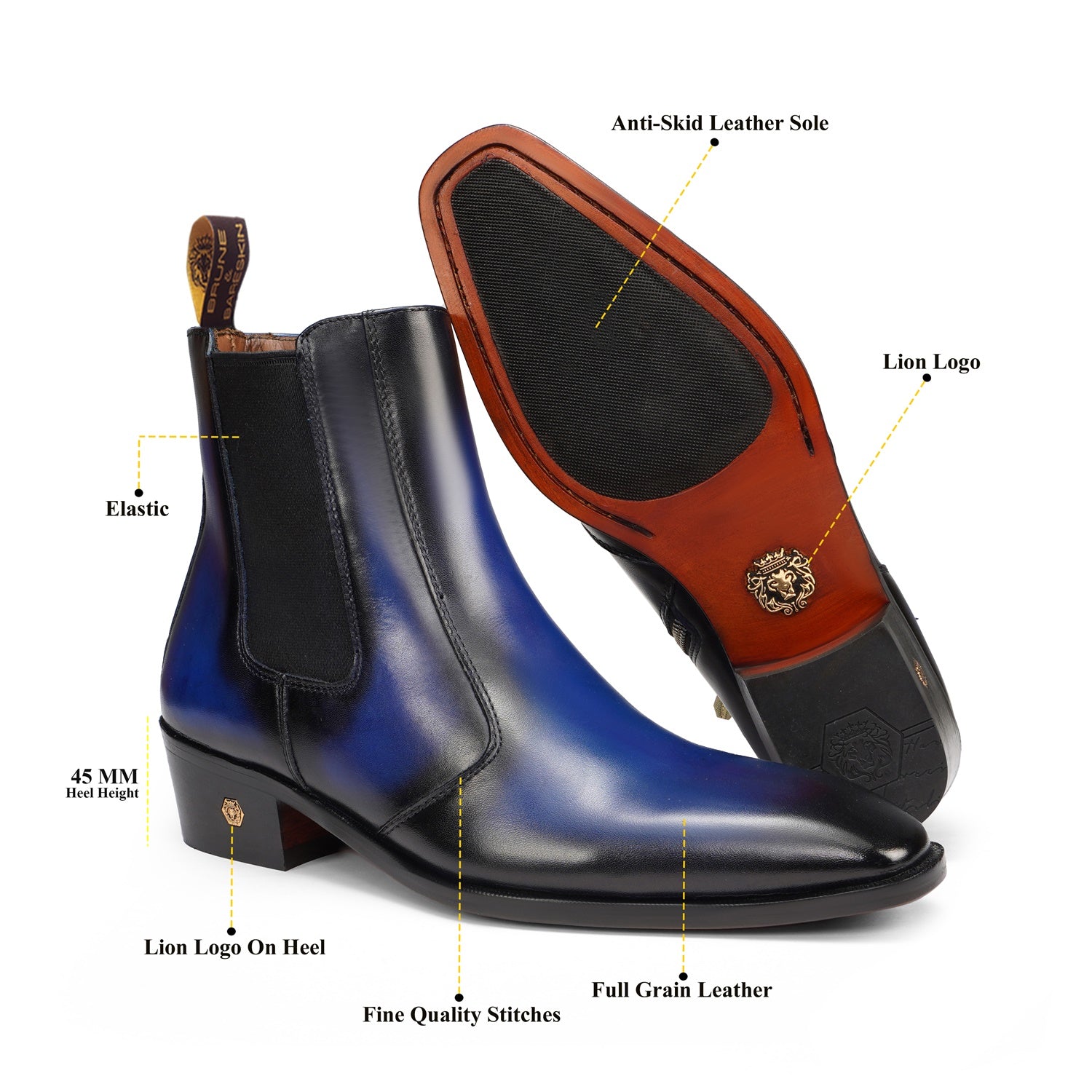 Dual Blu & Black Leather Cuban Heel Ankle boot in leather are a dream come true for many a fashion-aware executives. The classic elastic outside and easy access zip closure inner side made it very convenient to wear. These boots provide the distinct and sassy look. They are easy to team with formal trousers as they blend well with the classic fabrics as well as the modern blended synthetic fabric pants, slacks and trousers. The leather sole adds the extra elegance to it. You can customize this chic boots in any of your favorite color with our bespoke services.