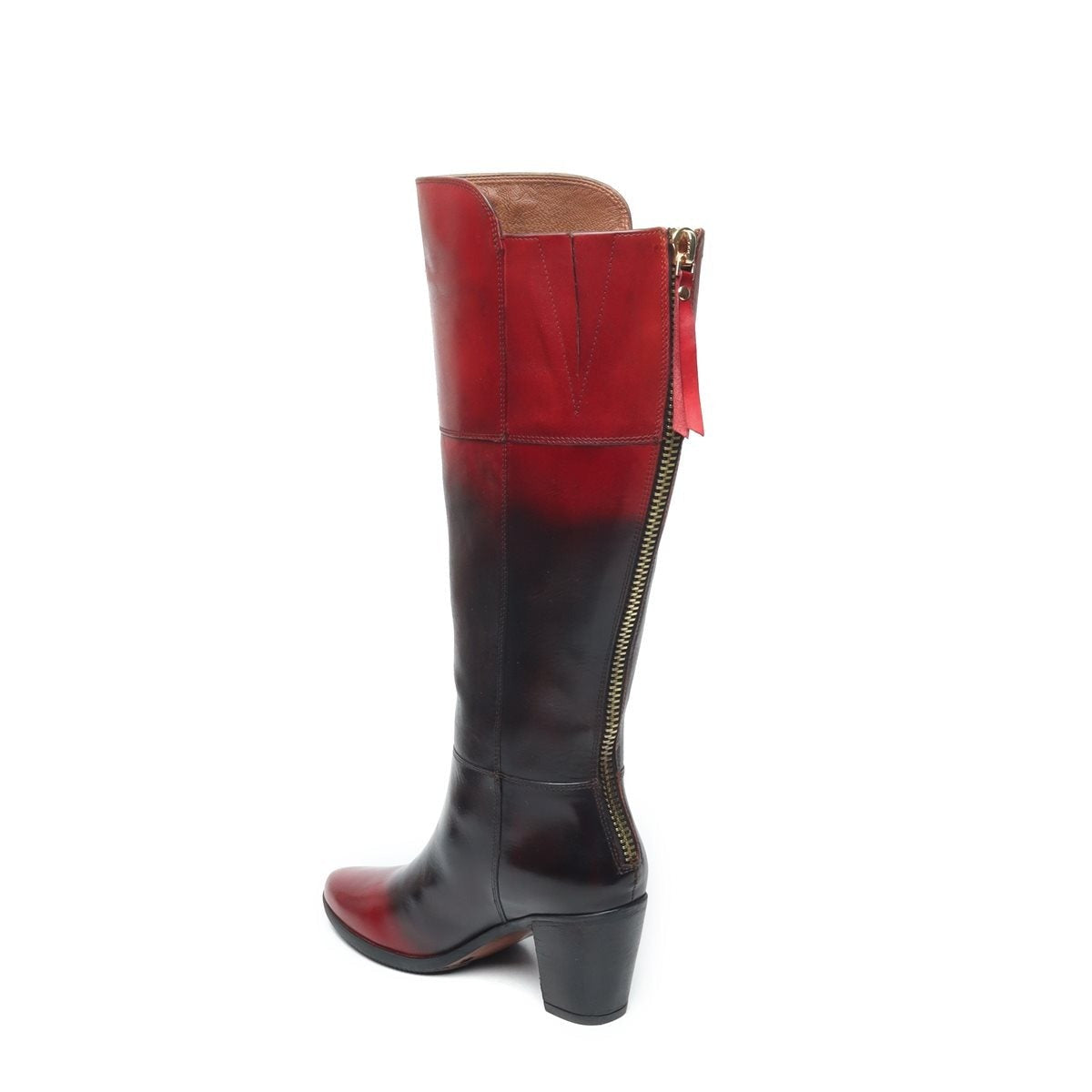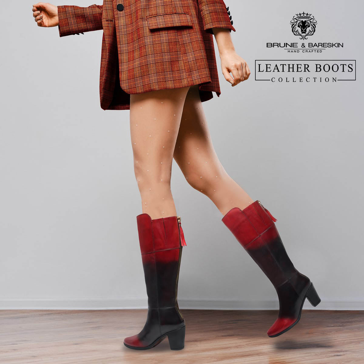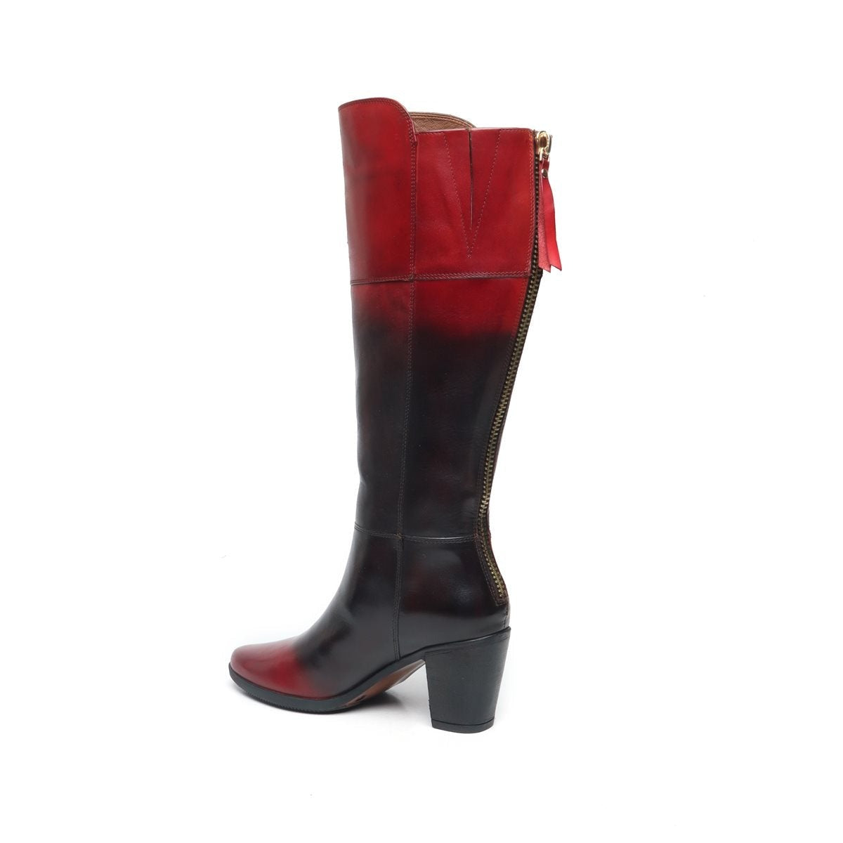 Knee Height Blocked Heel Boots with Dual Tone Black-Wine Genuine Leather By Brune & Bareskin
