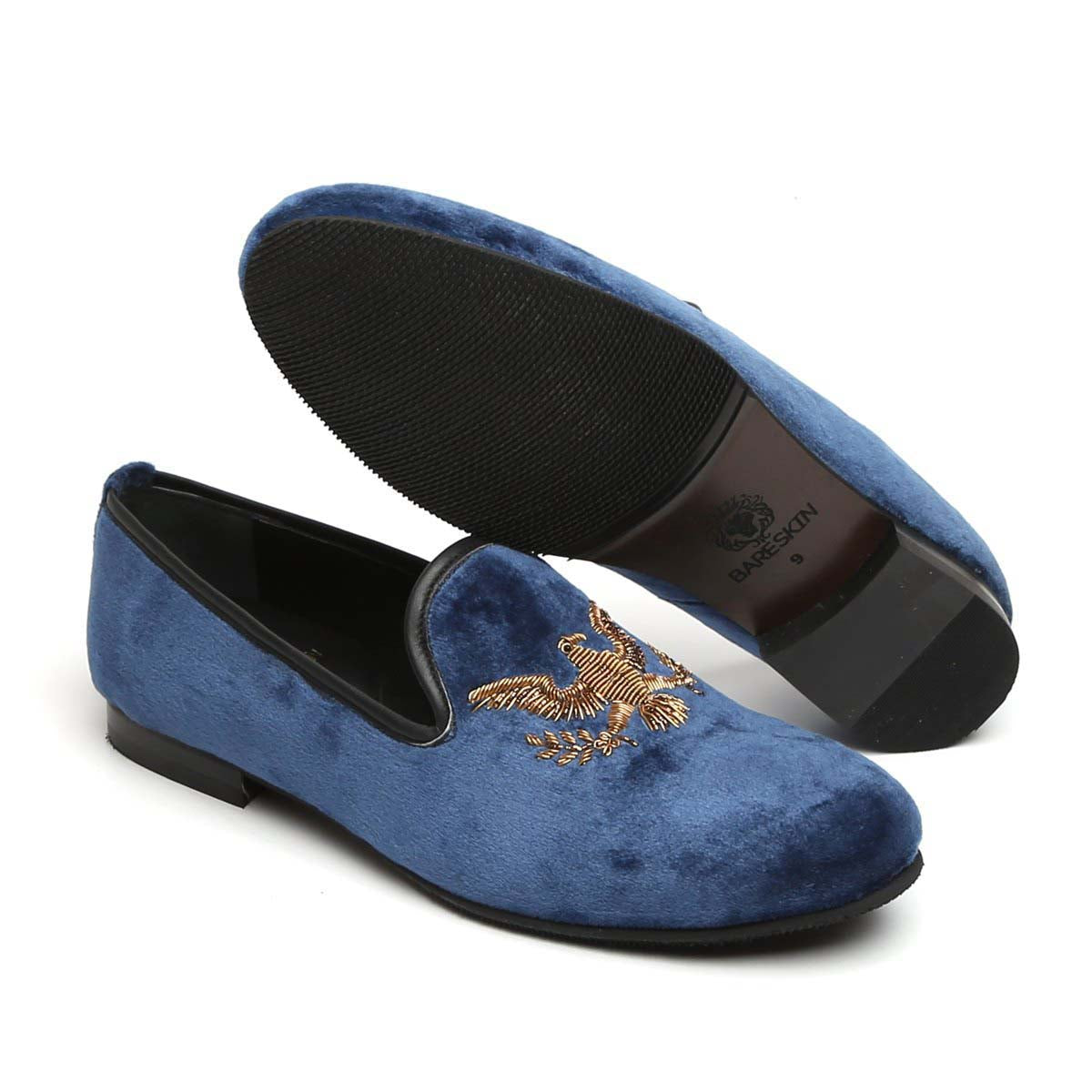 This elegant eagle Zardosi extra comfy Sleek Italian Navy Blue Velvet slip-on shoe is a pearl in style bucket. Zardosi Hand Work done by the most skilled sewing team in India makes this slip-on distinct from others. Rubber Sole with Anti Skid Pattern and extra cushioned padding in the insole. You just don't wear to Brune & Bareskin Shoes to Look Good. You wear Them, Because you have never worn a better Looking and Comfortable slip-ons ever. It is a must have footwear accessory to wear with ethnic to casual to semi formal clothes.