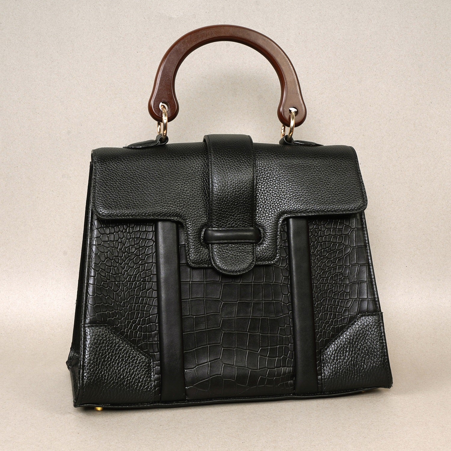 Elegant Large Black Croco Textured Leather Handbag with Wooden Handle