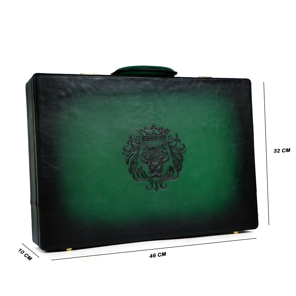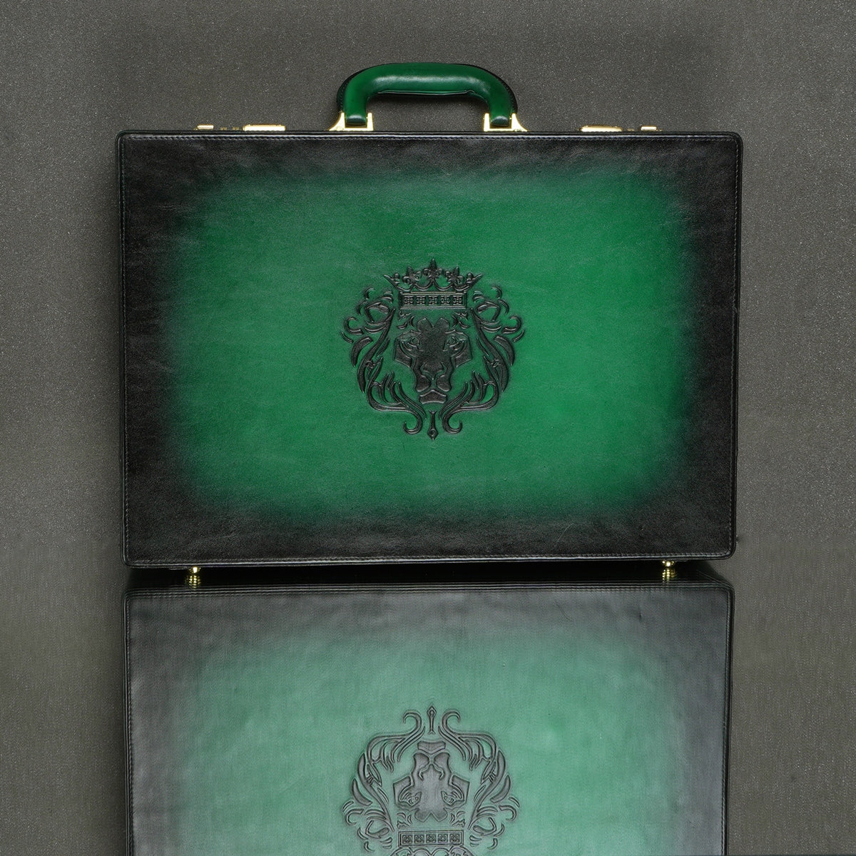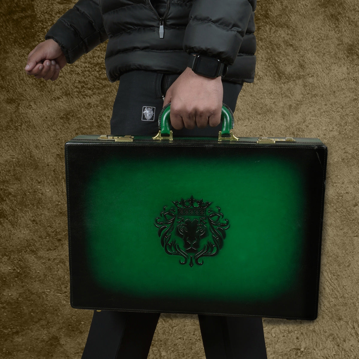 The green Italian leather office briefcase provides the perfect gentleman look. The embossed lion logo on this hard-case bag enhances the elegance. The high quality number lock system gives the extra layer of security. It has a multiple organizer compartments with multiple pockets. It is a perfect office bag in today's fast pace life. You can carry it easily with perfect size carry handles. You can get it customized with your name initials with our bespoke services.