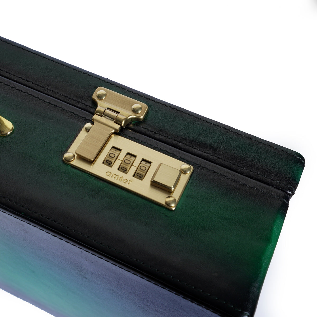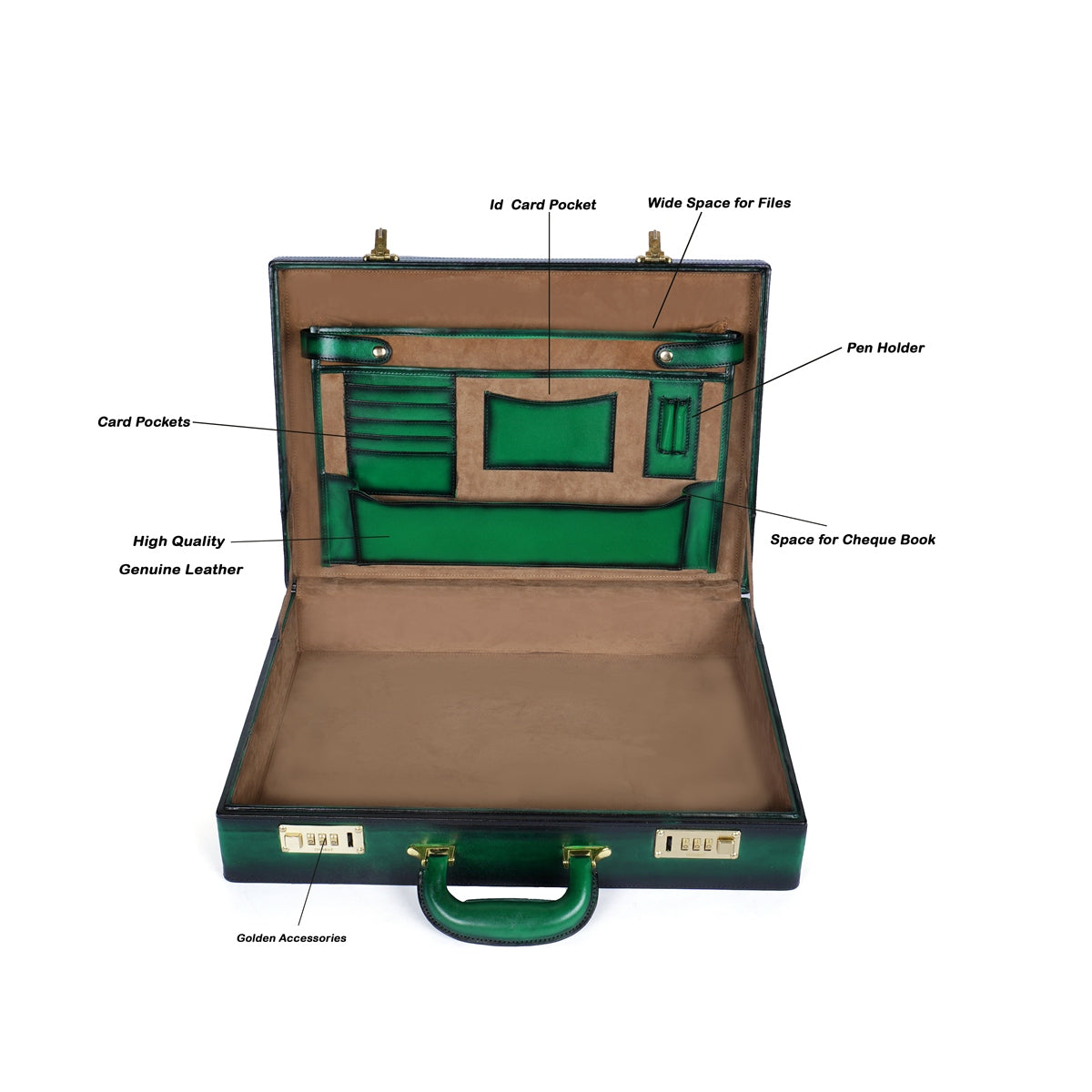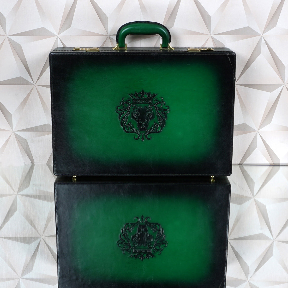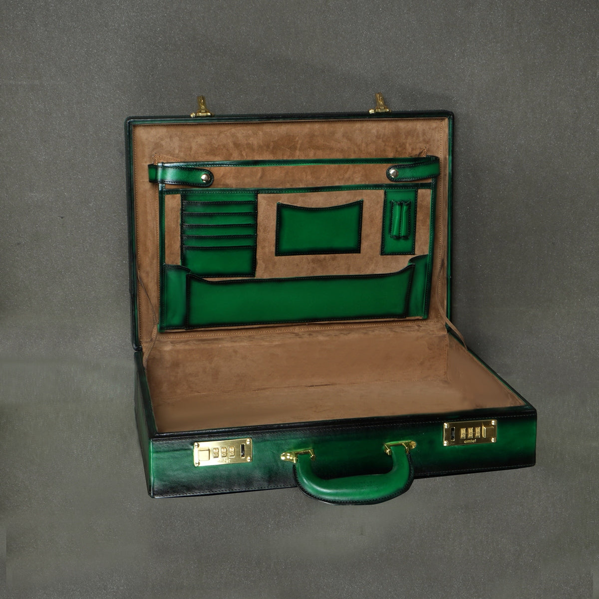 The green Italian leather office briefcase provides the perfect gentleman look. The embossed lion logo on this hard-case bag enhances the elegance. The high quality number lock system gives the extra layer of security. It has a multiple organizer compartments with multiple pockets. It is a perfect office bag in today's fast pace life. You can carry it easily with perfect size carry handles. You can get it customized with your name initials with our bespoke services.