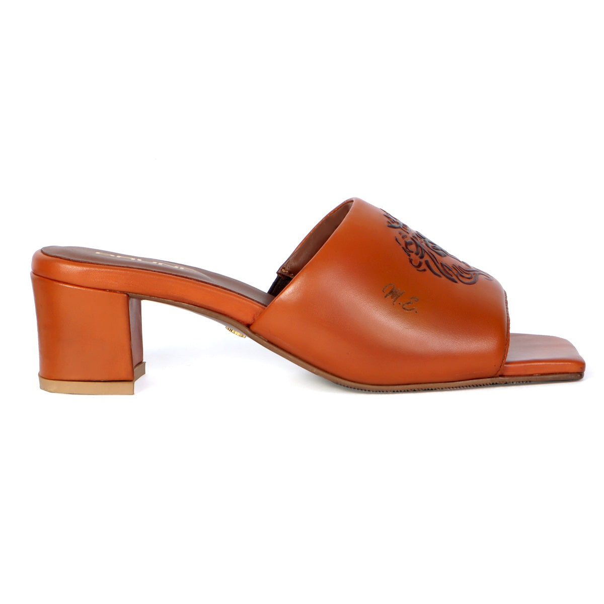 Embossed Lion Tan Open Toe Blocked Heel Leather Ladies Sandal by Brune & Bareskin