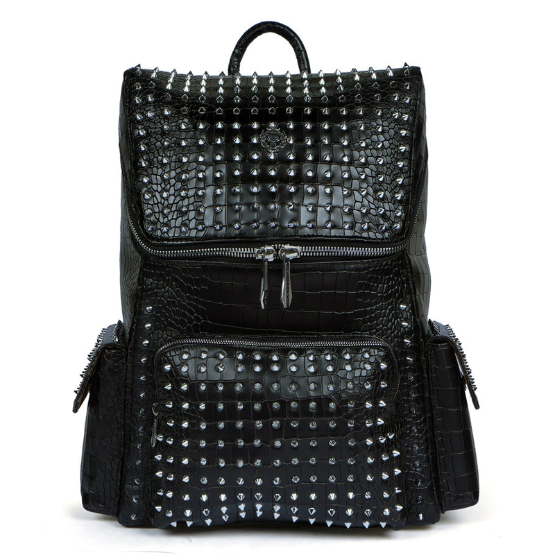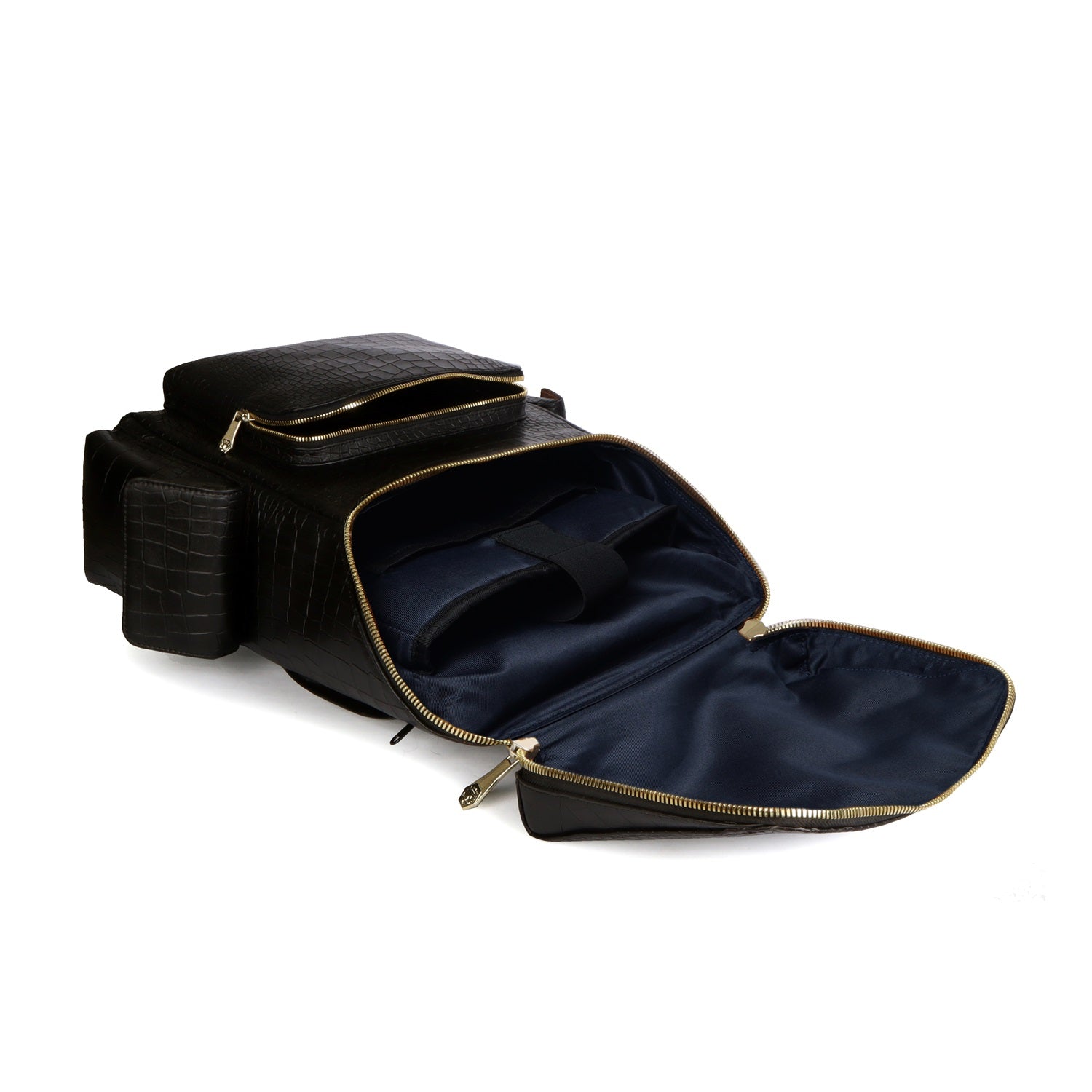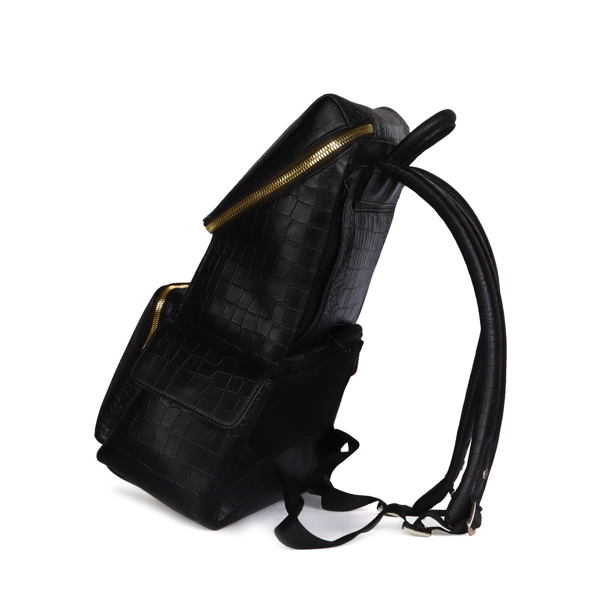 Top Opening Black Backpack Zip Compartment Croco Textured Leather
