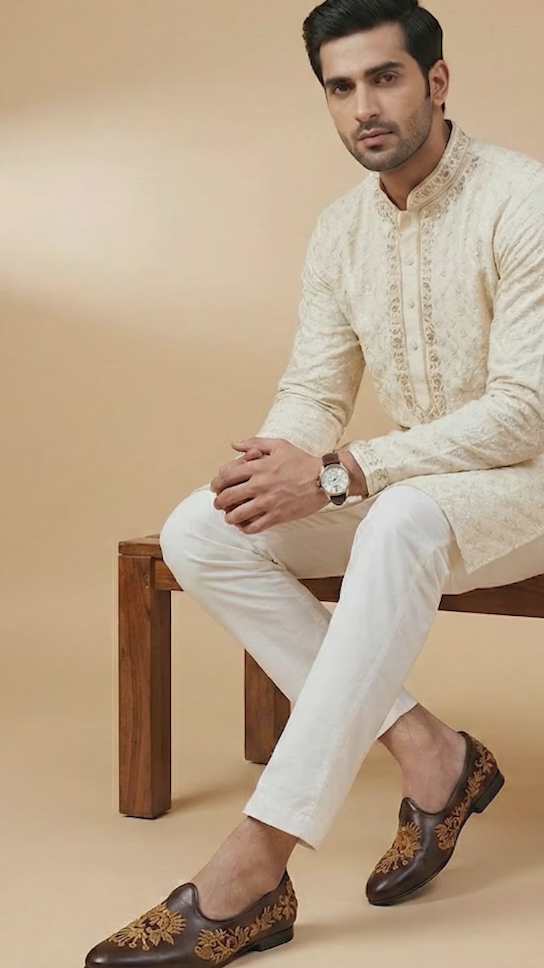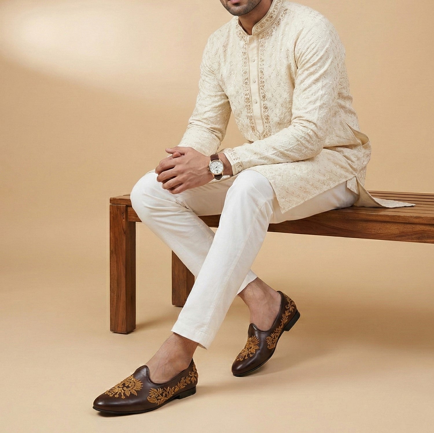 Rich dark brown full-grain leather forms the structured jalsa, handcrafted for a supple drape. Full-surface zardosi embroidery features authentic golden wires, hand-stitched by skilled artisans for heirloom-quality shimmer.