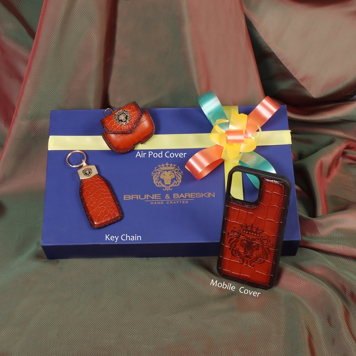 Exclusive Deep Cut Leather Combo Of Mobile Cover, Air-Pod Cover and Key-Chain By Brune & Bareskin
