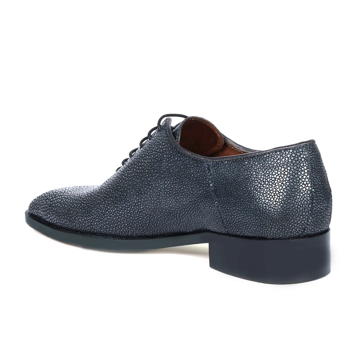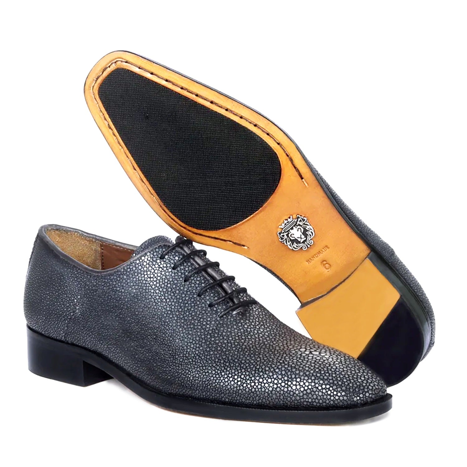 Brune & Bareskin offers sensational exotic stingray fish leather shoes that are completely hand crafted and hand stitched. It is a pair of hand-finished stingray fish genuine leather with sure-to-be satisfied fit and style. This grey oxfords shoes are typically made from high-quality stingray fish leather and feature a laced-up front design, which provides a secure fit and adds to the overall formal look of the oxfords shoe. This lace-up stingray fish leather formal oxfords shoes are also known for their comfort and support with anti-skid leather sole. The raised heel provides additional support to the arch of the foot, which can be especially helpful for individuals who spend long periods of time standing or walking in dress shoes. Stingray fish skin leather is known for its durability and strength, making it a popular material for use in high-end luxury goods such as handbags, wallets, and shoes. This leather has a natural shine which only increases with regular usage. Due to its superior quality & ultra durability it can last for 4 decades easily. It is water & scratch resistant.