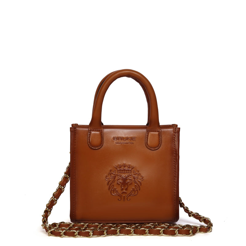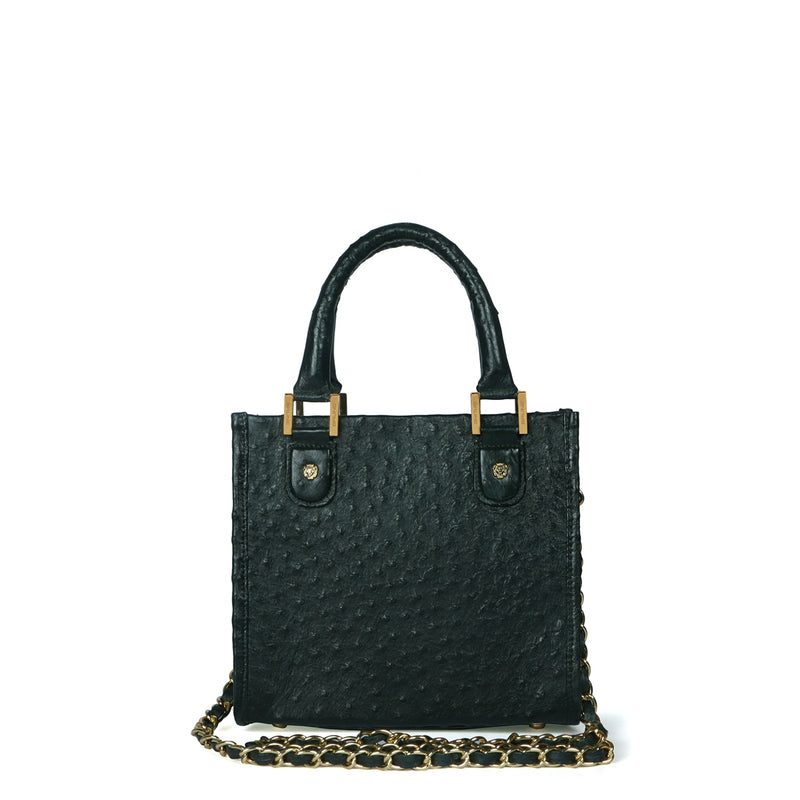 Brune & Bareskin real ostrich leather bag is highly sought after for its unique texture and durability. The leather is soft and supple, yet incredibly strong, making it an ideal material for handbags. Ostrich leather mini handbags come in a variety of styles, from clutches to totes, and are often adorned with embellishments like metal hardware, tassels, or fringes. This special tan ostrich leather Hand Bag/ Shopping Bag is made to give you a completely elegant look. This bag classic golden finish chain bag strap with tan leather weaved/threaded through choice of length and hook with two golden mini loin logo on front side. This ladies hand Bag for the modern entrepreneur, stylish in appearance with its real ostrich leather its gonna be an eye stopper. 100% pure ostrich leather is used for making your style. It is perfect for a long day out shopping. The ample space with multiple pockets allows it to carry for traveling. The main golden button compartment provides the extra security to it.