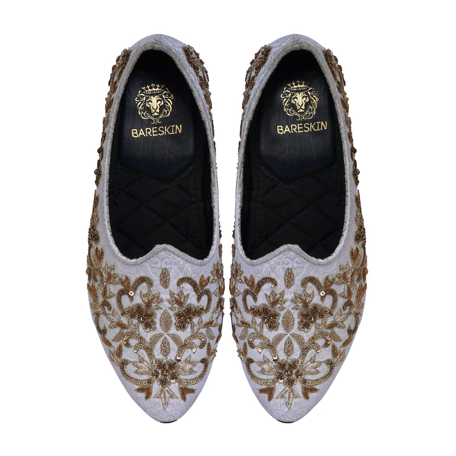 Take fashion to the next level, Capture timeless style with this pair of Men's White jalsa jutti with Golden Dapka Leaf Decorative Embroidery from Brune & Bareskin. Handcrafted with white fabric material and a golden zardosi embroidery, these jalsa juttie's are perfect for adding wedding-worthy flair to your look. An anti-skid rubber sole ensures comfort and stability. Where classic style meets modern convenience. You can match it up with any ethnic wear or into-western & get customized it with your choice of color & design.