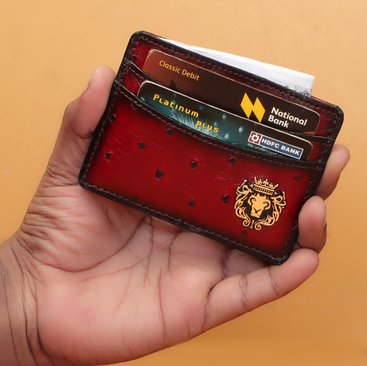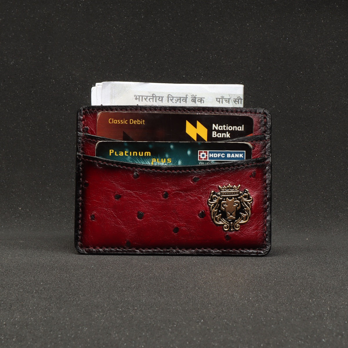 Unlock your style with this Exclusive Wine Card Holder crafted from luxurious real ostrich leather. Featuring the iconic metal lion logo and a fashionable wine color, this unisex, multi-slot holder is designed to carry all your cards in style - making it easy to slip into your pocket and carry on-the-go. This card holder has one pocket in the center & 4 card slots (2 on each side). Due to its ultra-durability & superior quality it can easily last up to 4 decades. With Brune & Bareskin's excellence, you're sure to turn heads. it's sure to get you noticed. you can bring this unisex card holder with you wherever you go!