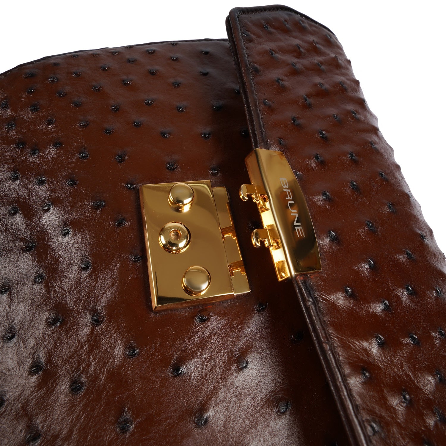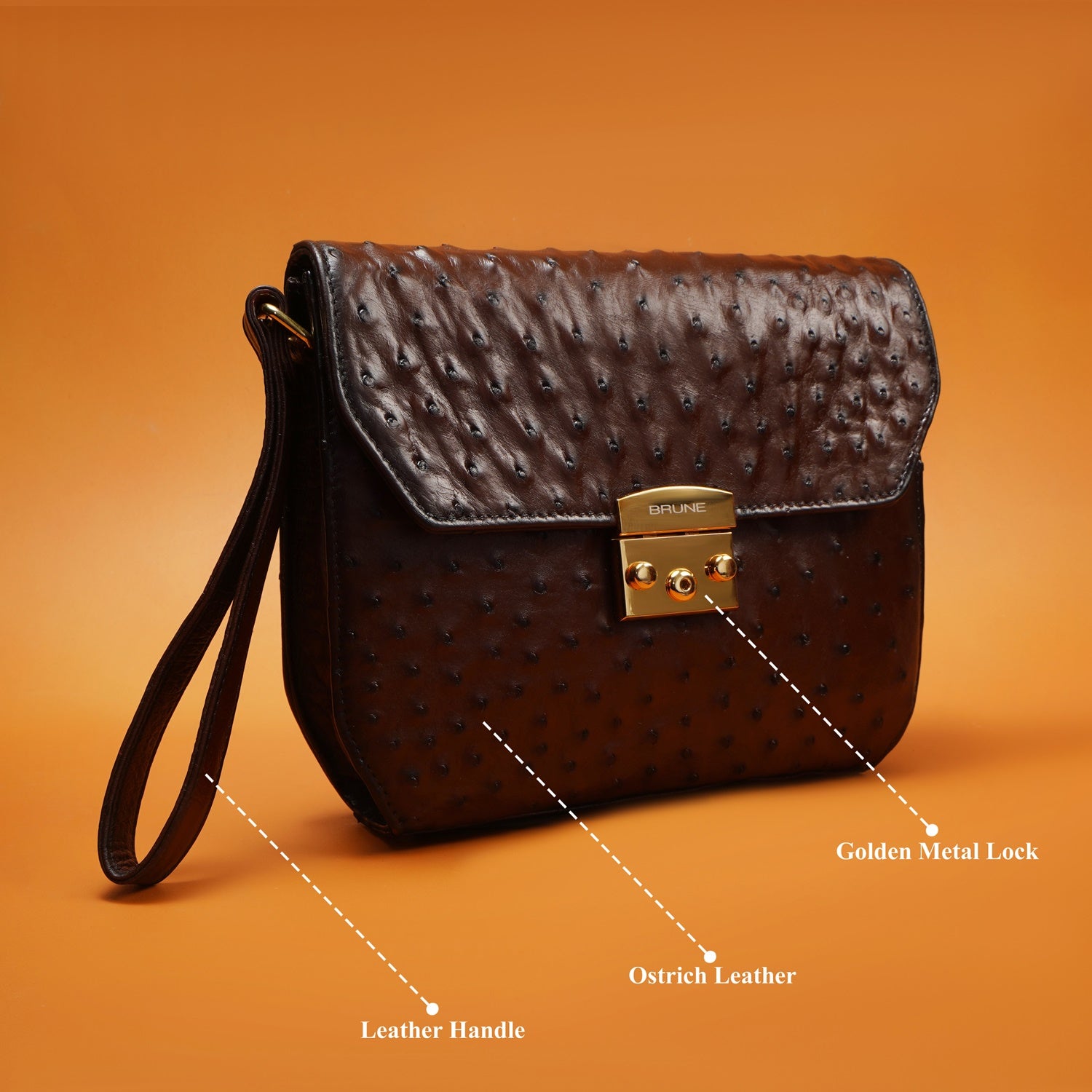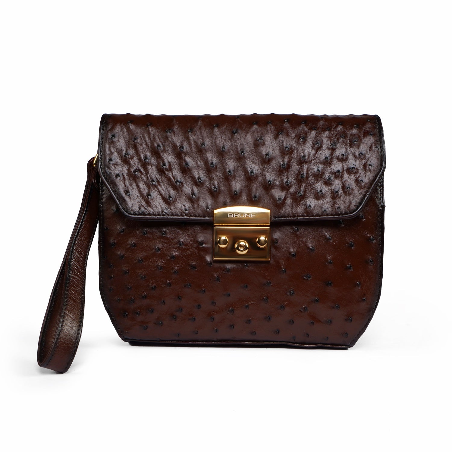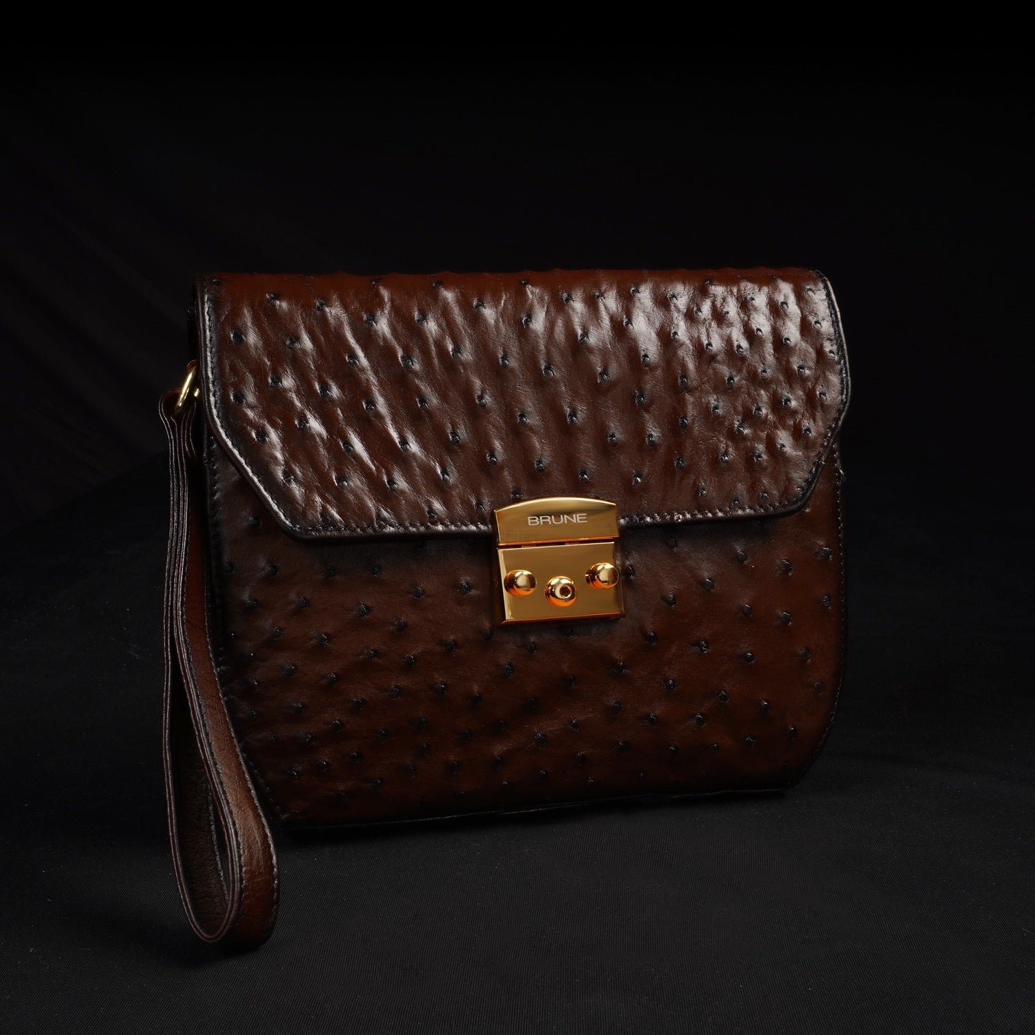 Indulge in the luxury of true craftsmanship with this dark brown ostrich leather clutch. Designed with an exotic textured finish, it reflects elegance and exclusivity. The premium golden lock closure adds a touch of sophistication while ensuring security for your essentials. Compact yet spacious, this versatile wristlet is perfect for carrying cash, cards, and small belongings with style.