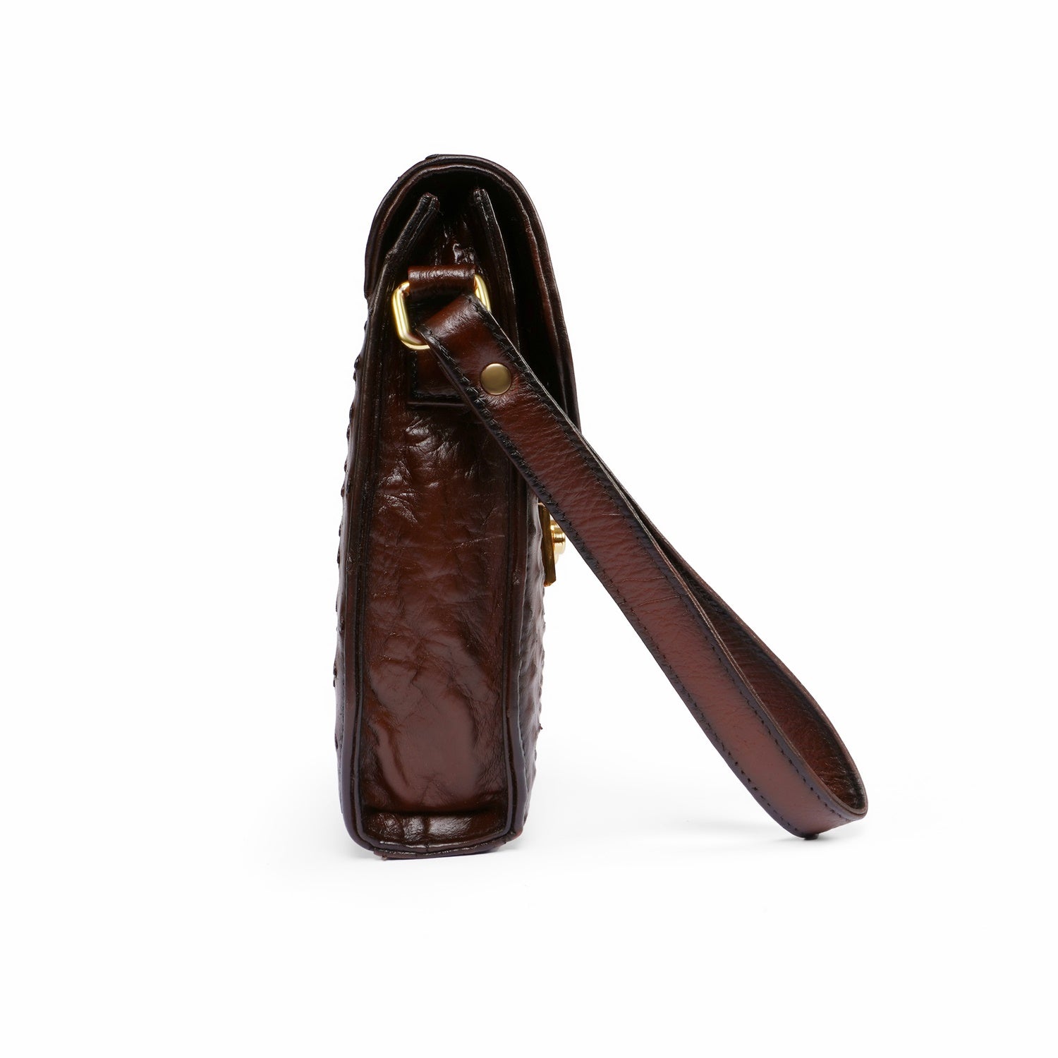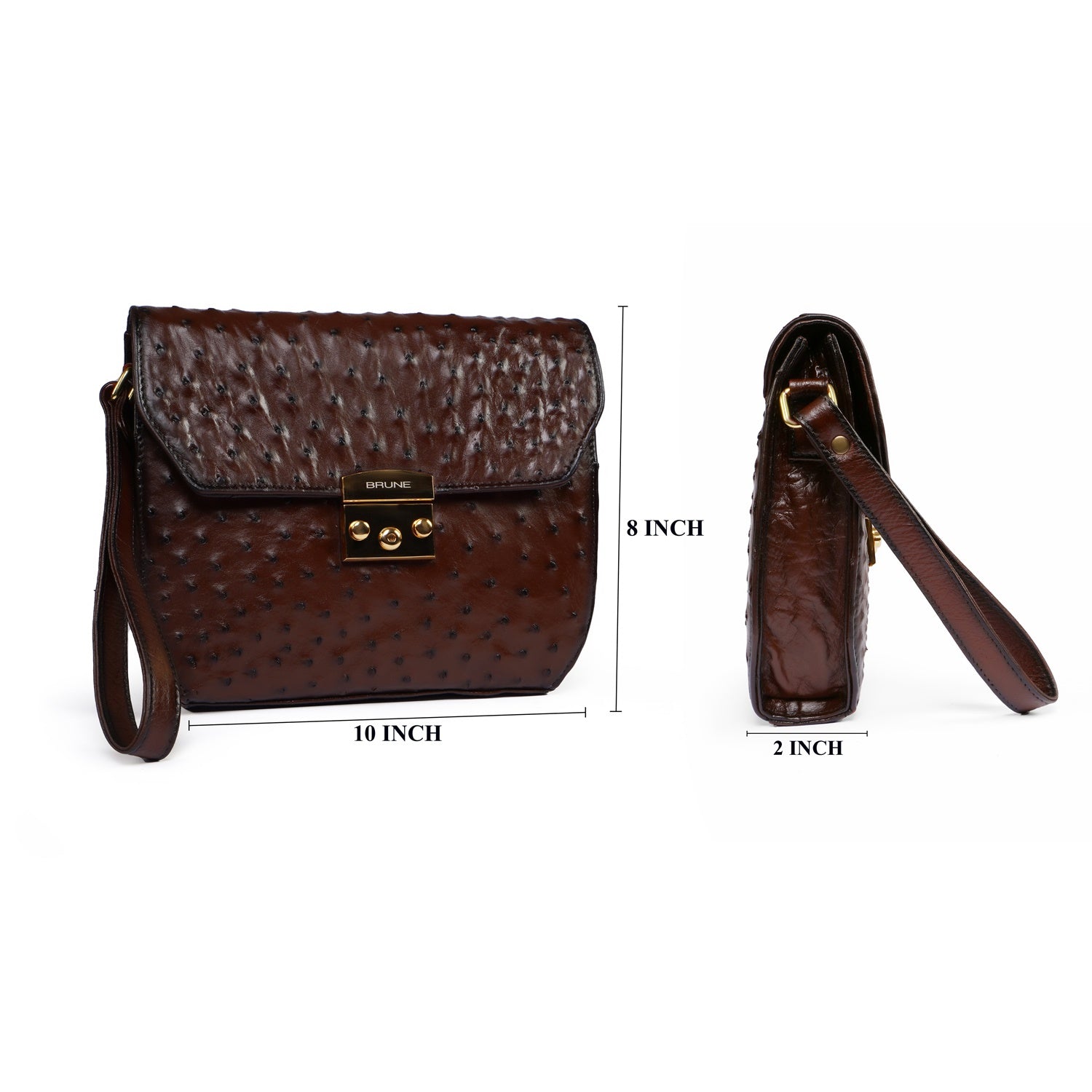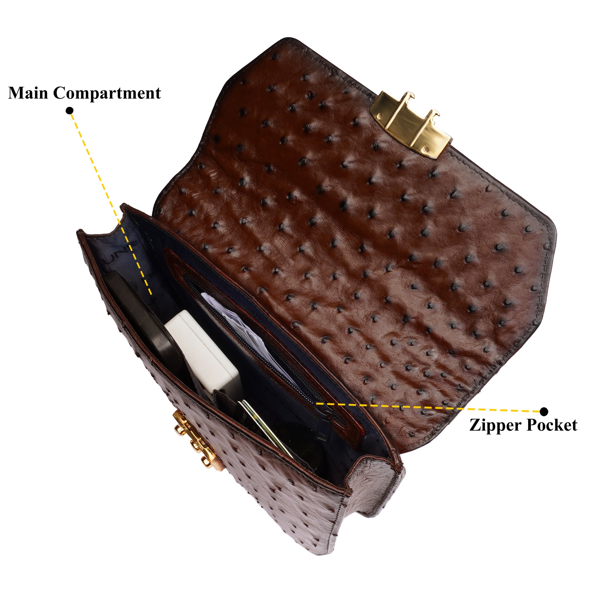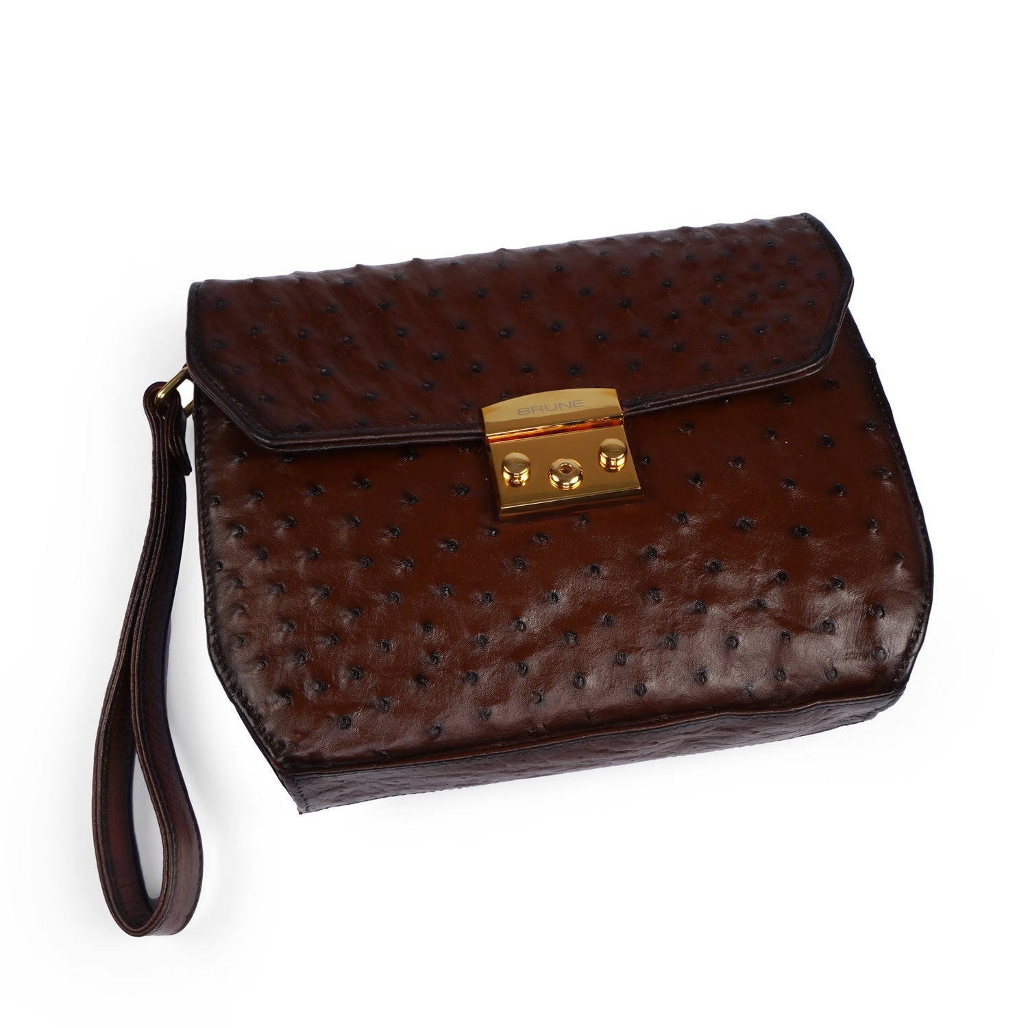 Indulge in the luxury of true craftsmanship with this dark brown ostrich leather clutch. Designed with an exotic textured finish, it reflects elegance and exclusivity. The premium golden lock closure adds a touch of sophistication while ensuring security for your essentials. Compact yet spacious, this versatile wristlet is perfect for carrying cash, cards, and small belongings with style.