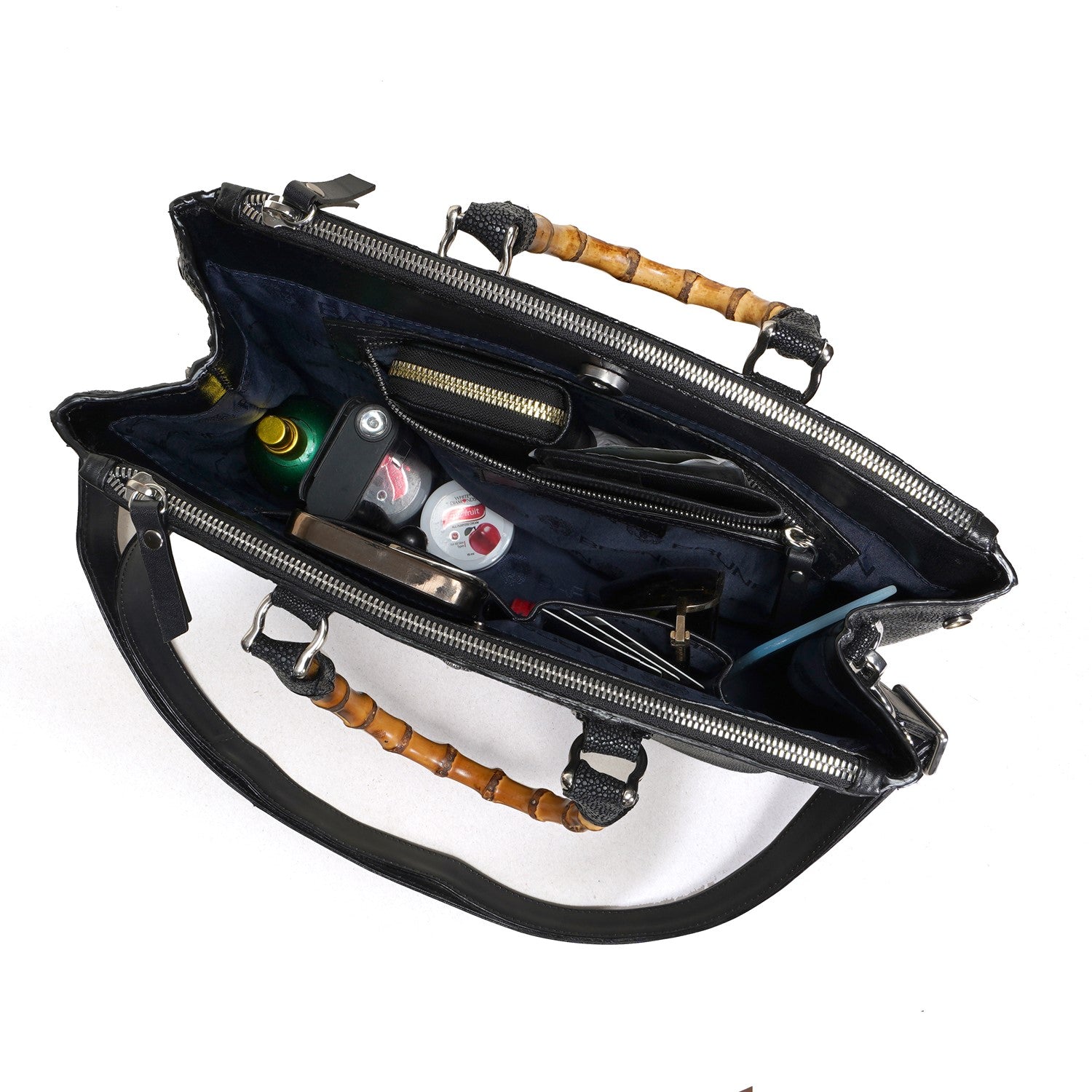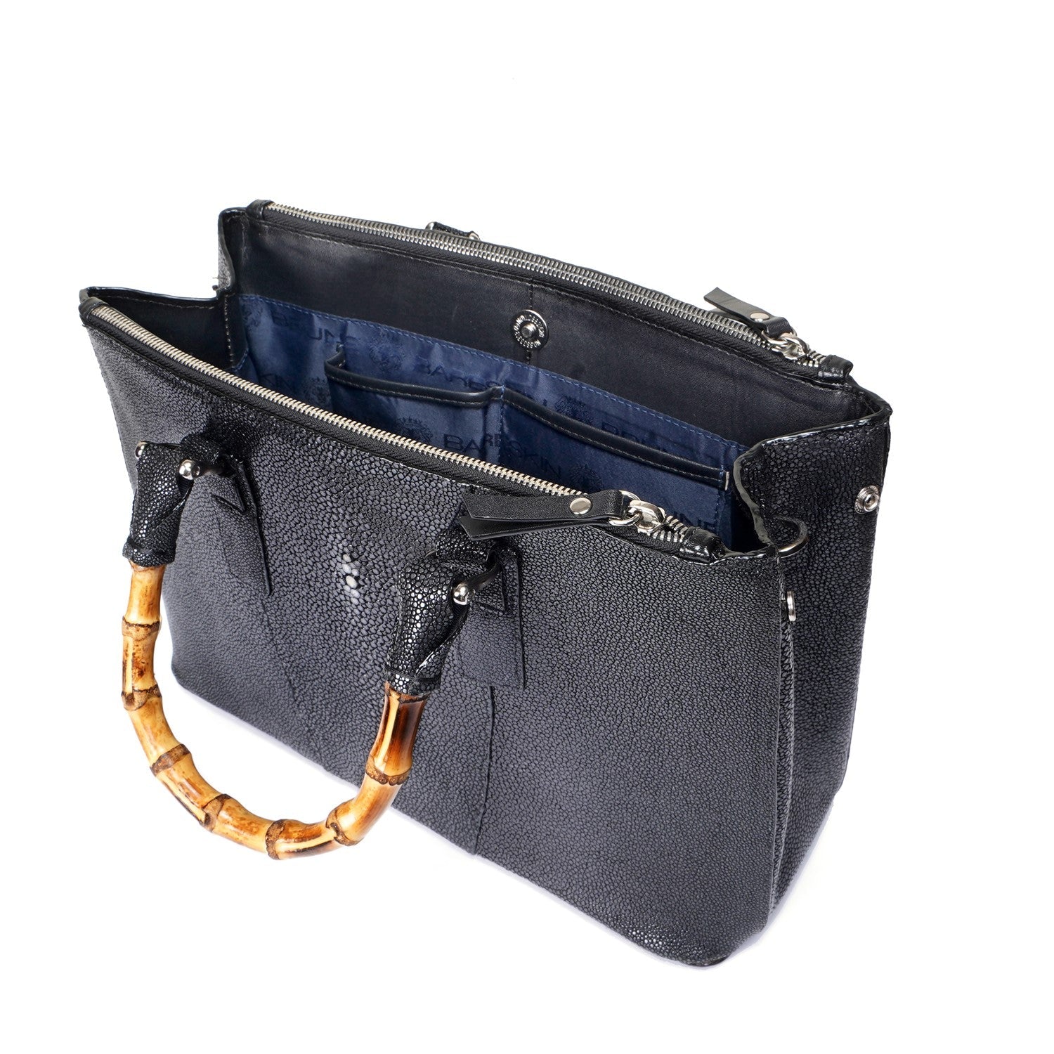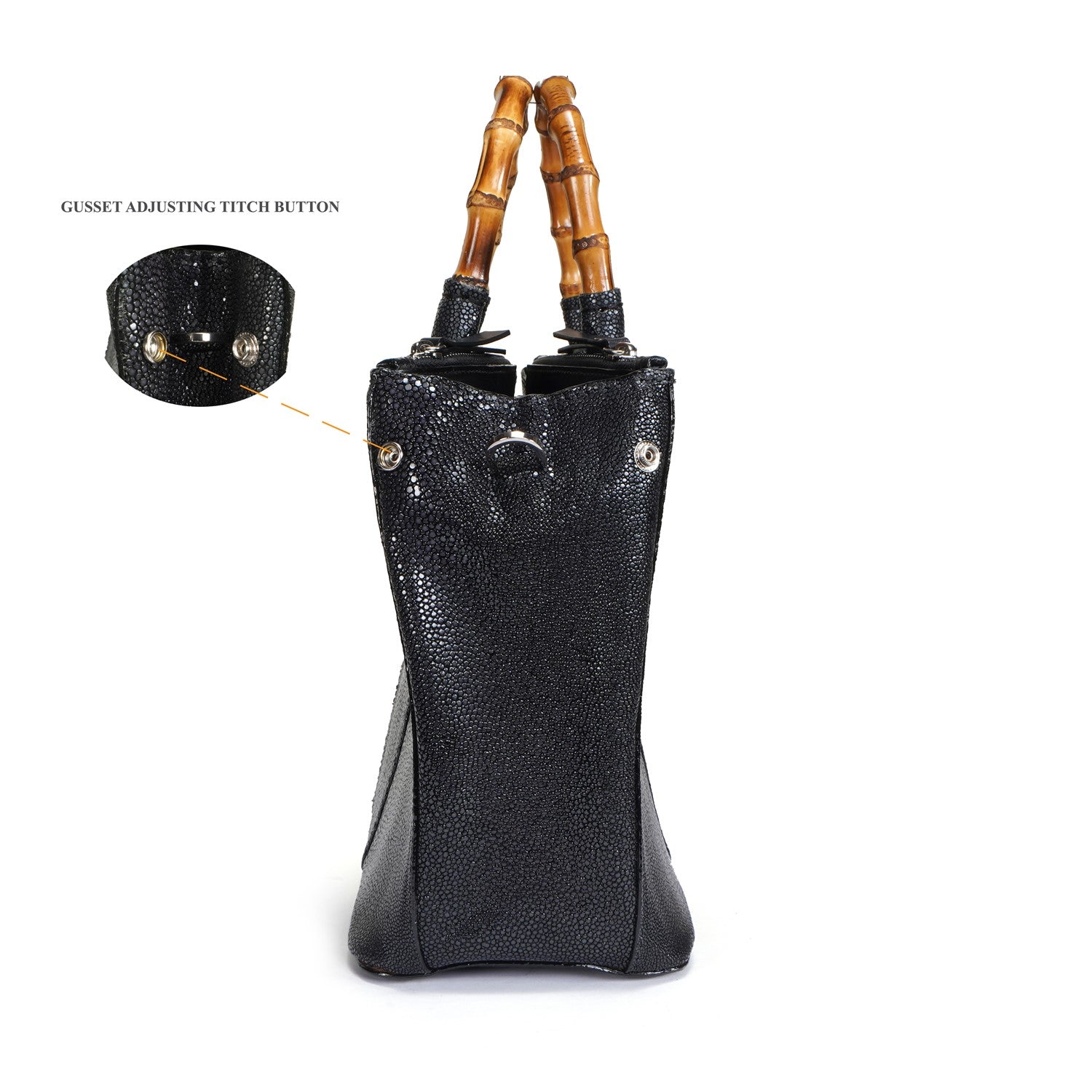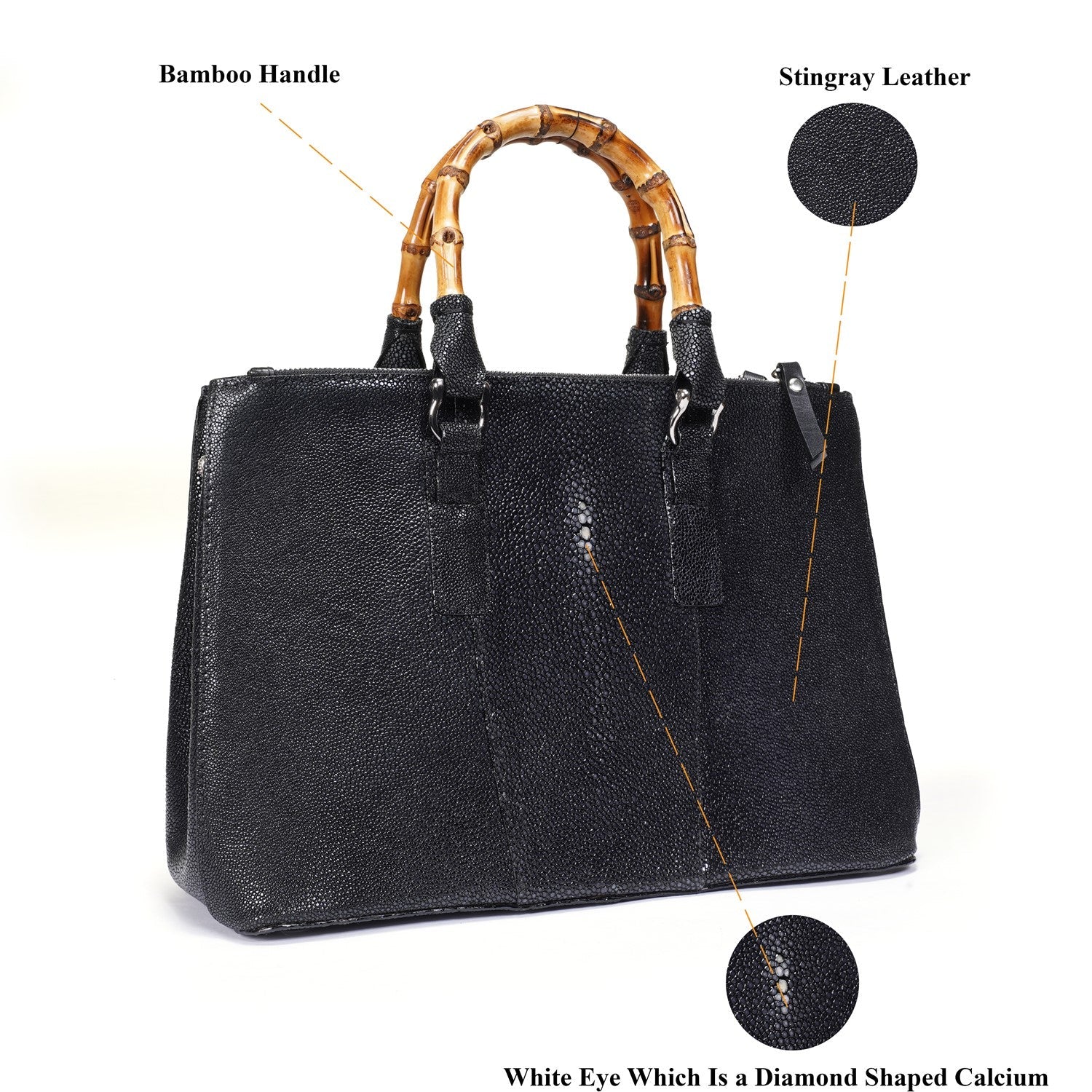 Elegance meets the extraordinary with our Stingray Leather Handbag, featuring a beautifully crafted bamboo handle. Made from genuine exotic stingray leather, this handbag is a true statement piece—luxurious, durable, and uniquely textured. The natural sheen of the stingray leather paired with the earthy charm of bamboo creates a perfect blend of sophistication and nature-inspired design.