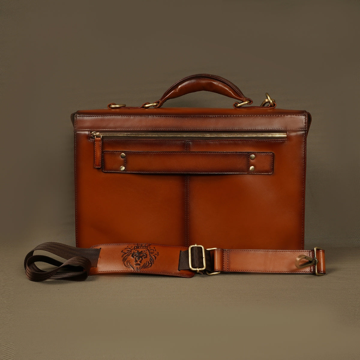 Get the style and convenience at the same time with this Brune & Bareskin laptop bag. The luxurious tan leather provides the durability which is hard to find anywhere else. This Brune & Bareskin unisex laptop office briefcase has a flap opening secured golden finish lock closure. It features large enough compartment to store your office essentials. It has a padded laptop sleeve which can go from holding your laptop with many pockets, You can easily carry your charger or other accessories. This sharp classic piece of well-crafted office laptop bag will complement a styled personality. This bag is made from the premium quality leather in a stunning tan shade. A golden finish zip compartment for holding your paper works safely. This bag has beautifully inclined organizer in the main compartment. The adjustable shoulder strap connects and removes easily with the hidden hardware loops and lion logo embossed. The trolley handle strap in a laptop bag is a convenient feature that allows you to easily attach your bag to the handle of your luggage when traveling.