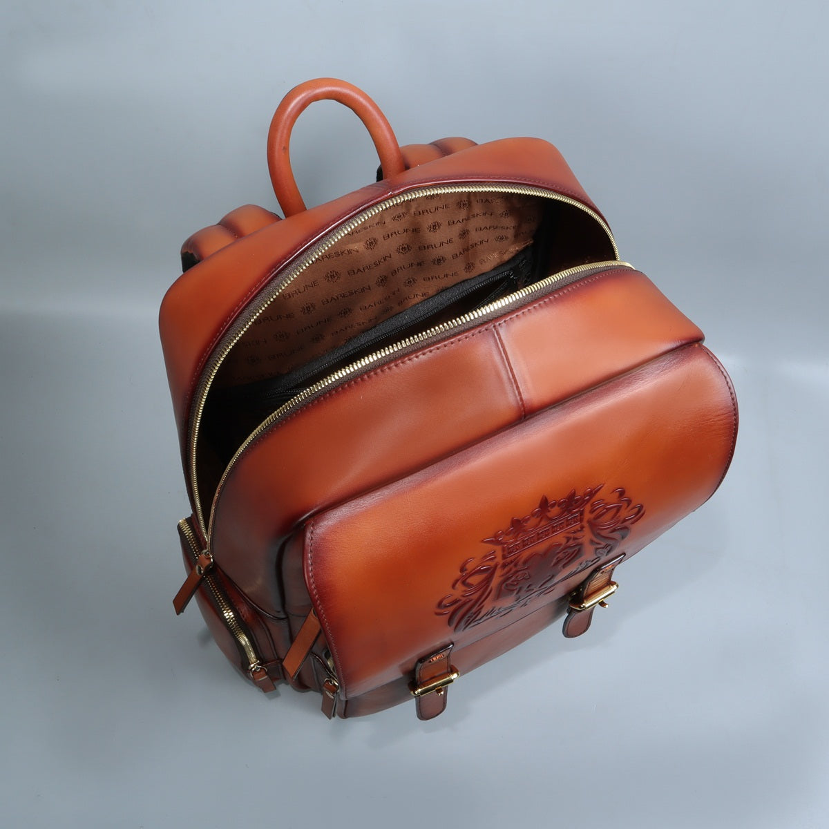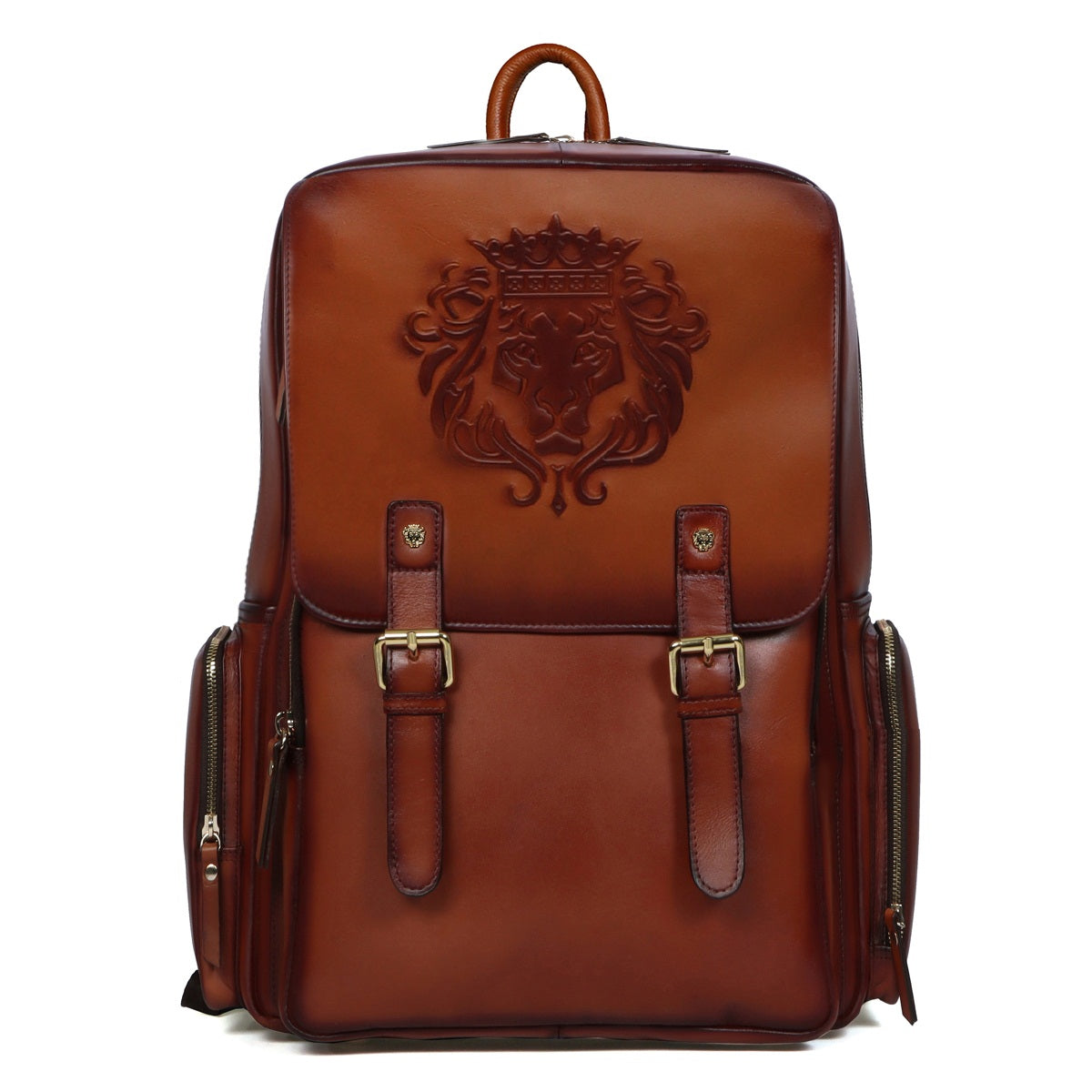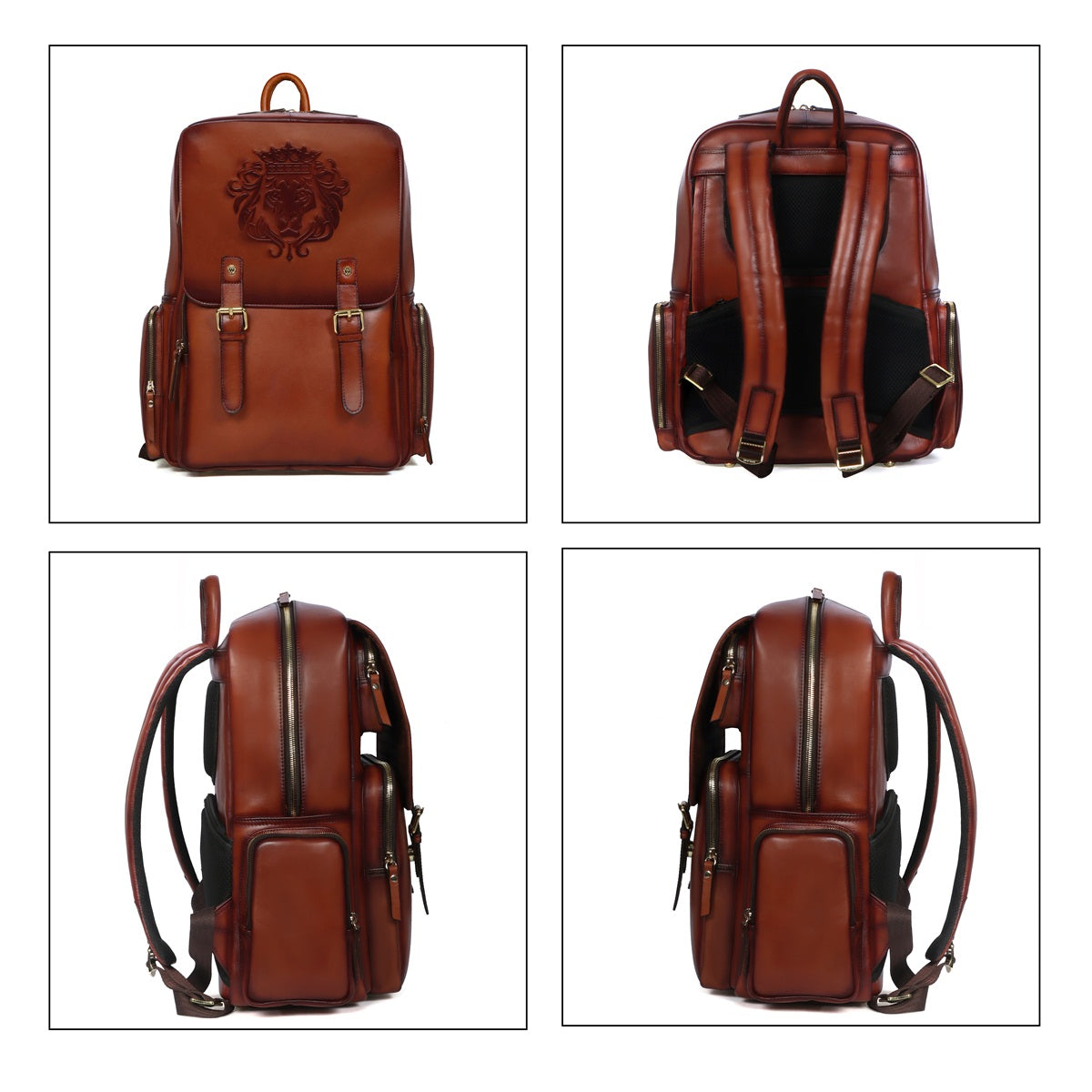 This backpack comes with 2 side pockets with a flap closure supported by magnetic button closure mechanism. This luxurious tan leather backpack has large zip compartments to carry clothes and other essentials. The front of the bag has an open pocket which can store an small iPad or a phone making them easily accessible. Its unique design enhancing the royalty of the product. Multi-pockets zipper closure help the easy access while traveling. Padded straps and back make it very comfortable while carrying on shoulders. You can get it made in any color shade and with your name initials or logos with our Bespoke Services.