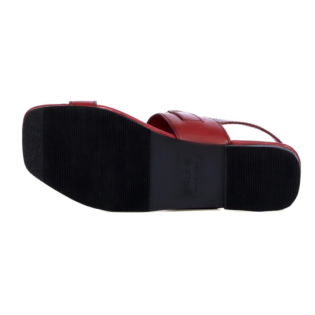 Introducing Brune & Bareskin handmade ladies sandals with a flat sole, genuine leather, and a tan red color. This versatile and stylish footwear features a golden horse-bit buckle strap, ensuring a secure fit and lasting quality. Enjoy the perfect blend of fashion and comfort with these beautiful sandals. Wear them with everything from pared-back suiting to special occasion dresses.
