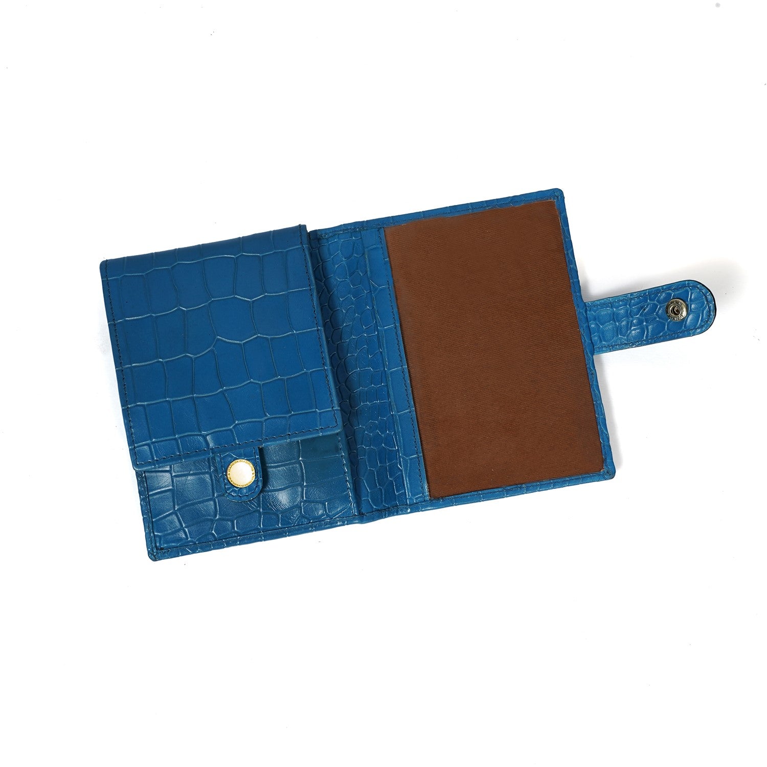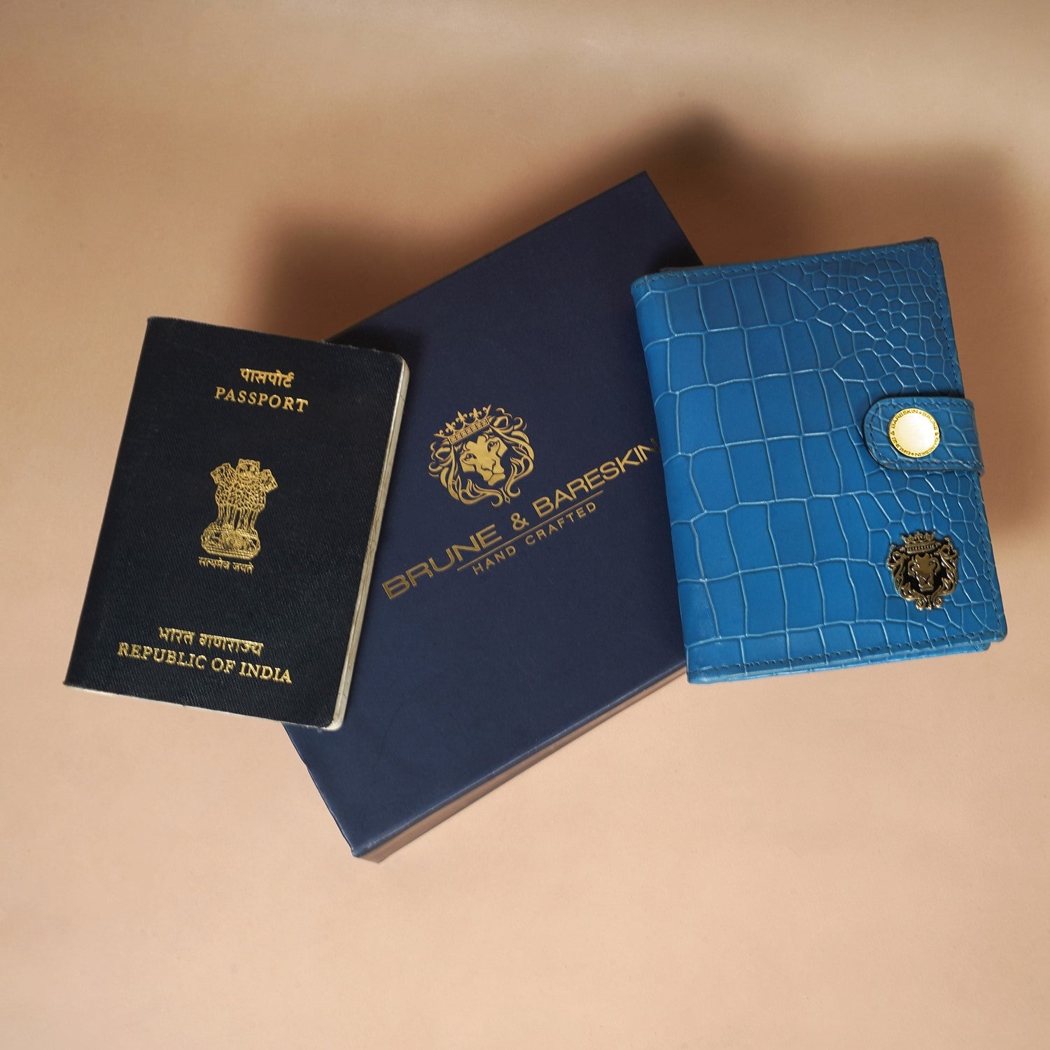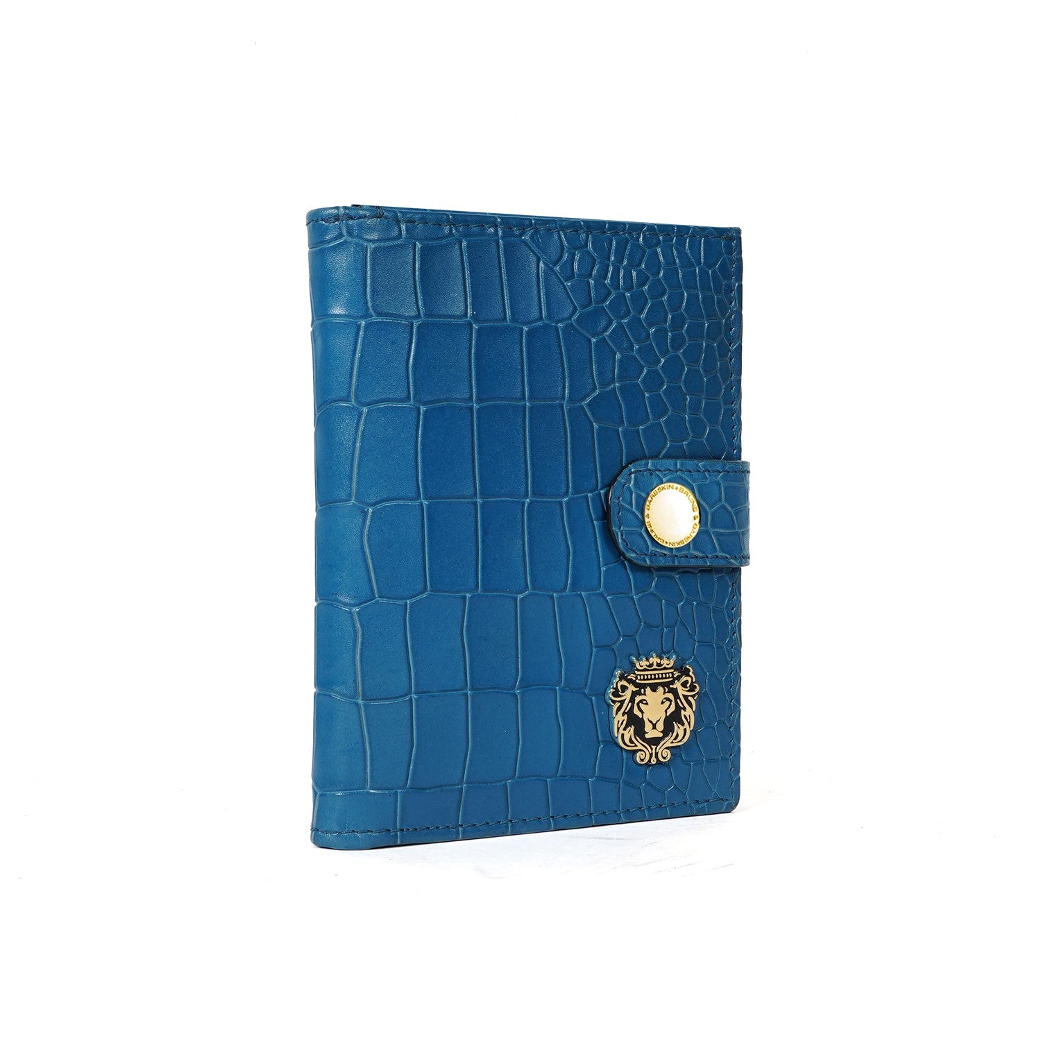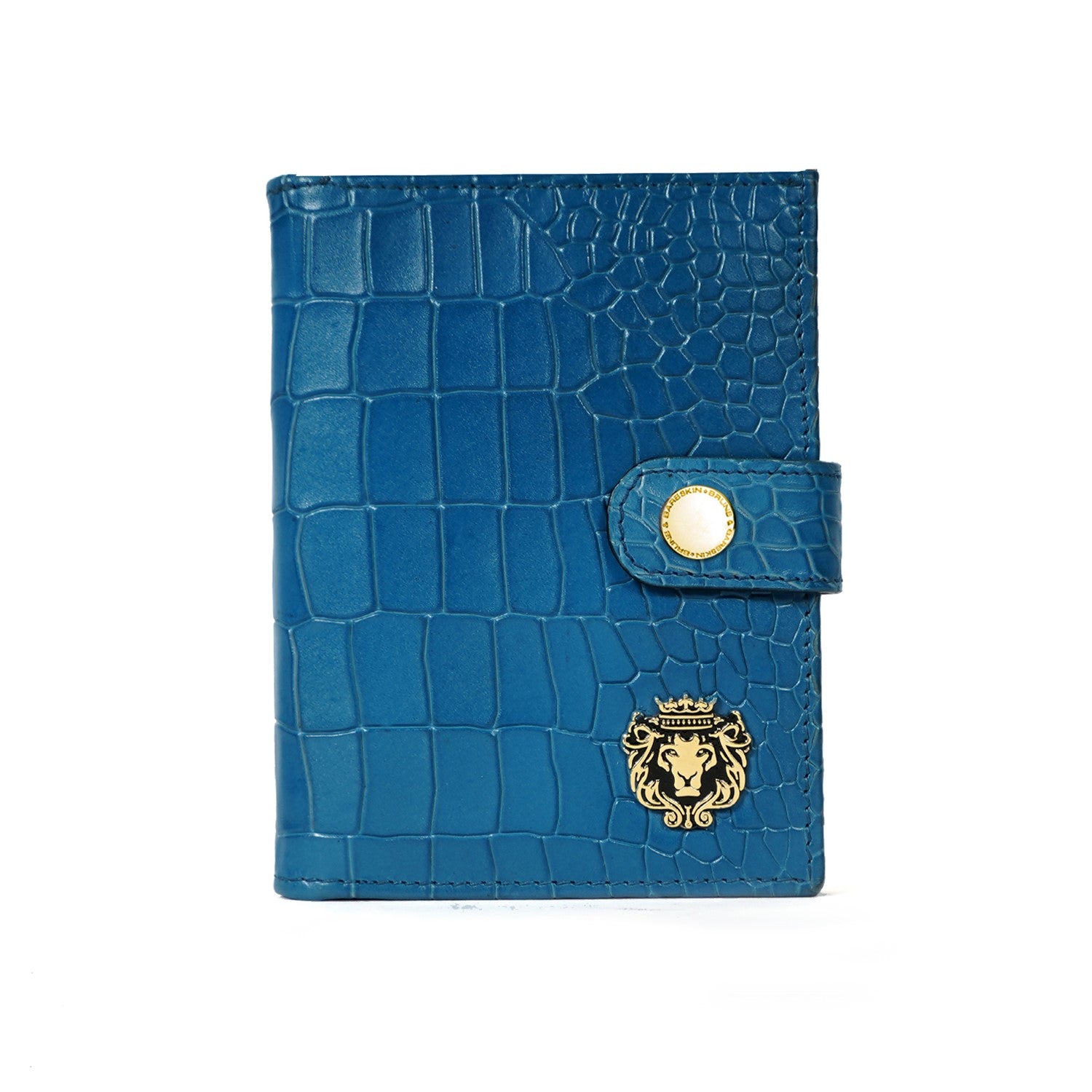 Keep your travel documents in style with this foldable passport holder from Brune & Bareskin. This sky blue passport holder is crafted from croco textured leather for a luxurious look, with a patina finish and a metal lion brand logo. Inside, you'll find a dedicated passport pocket, multiple card slots, and a foldable boarding pass pocket secured with a snap button closure for extra security. It a perfect accessory to use for countless years. You can get it personalized with your name initials with our Bespoke Services.
