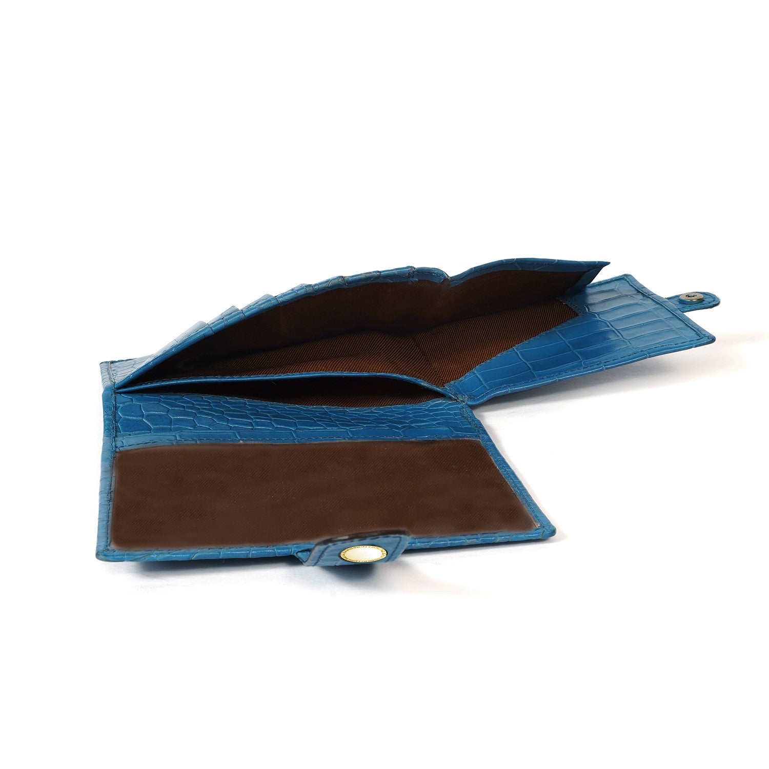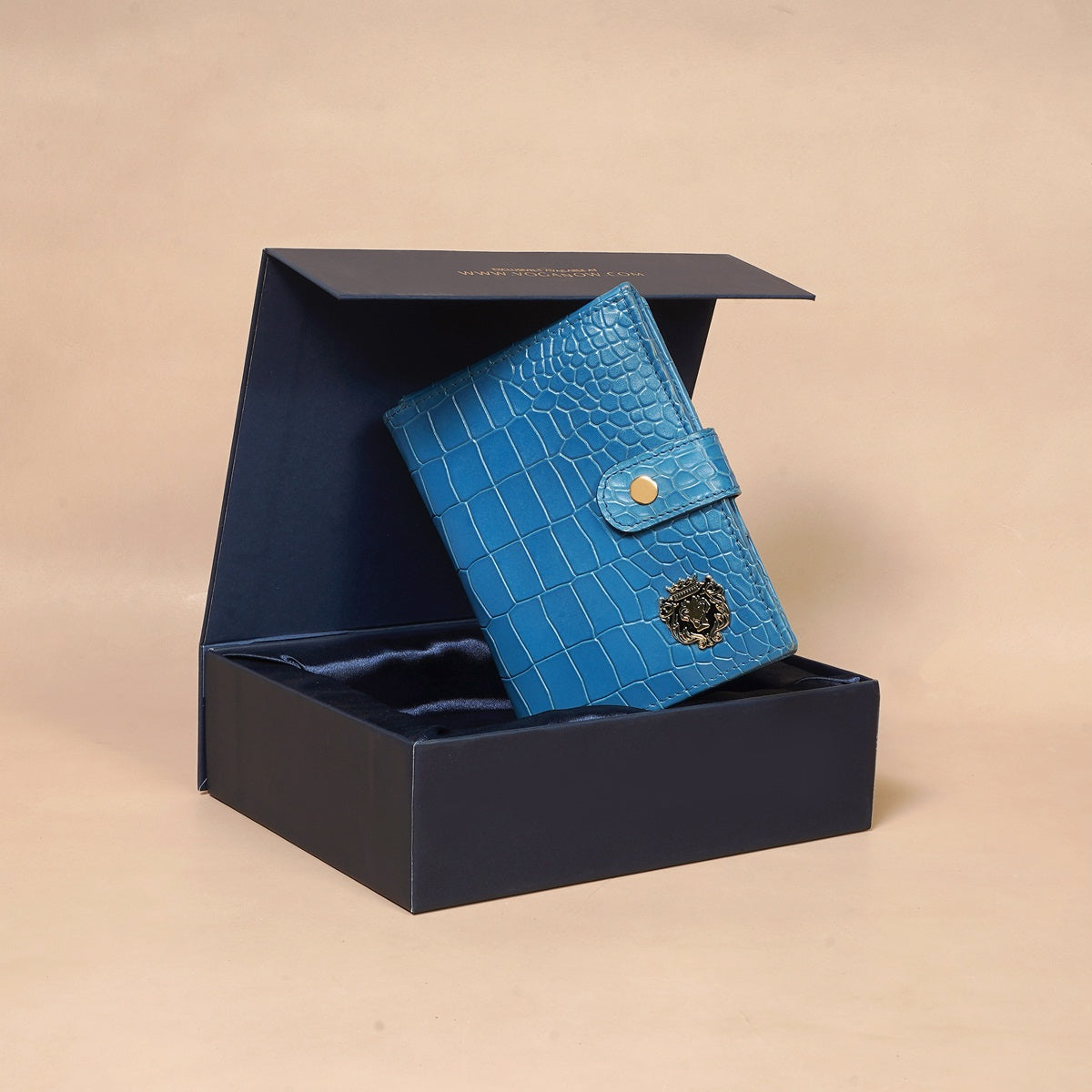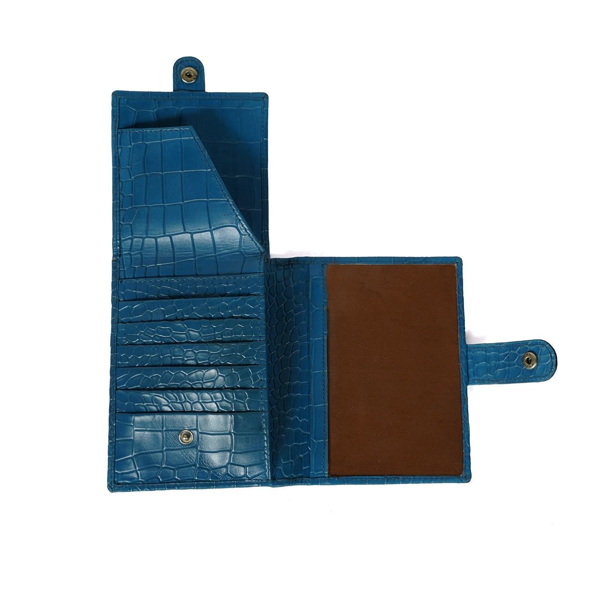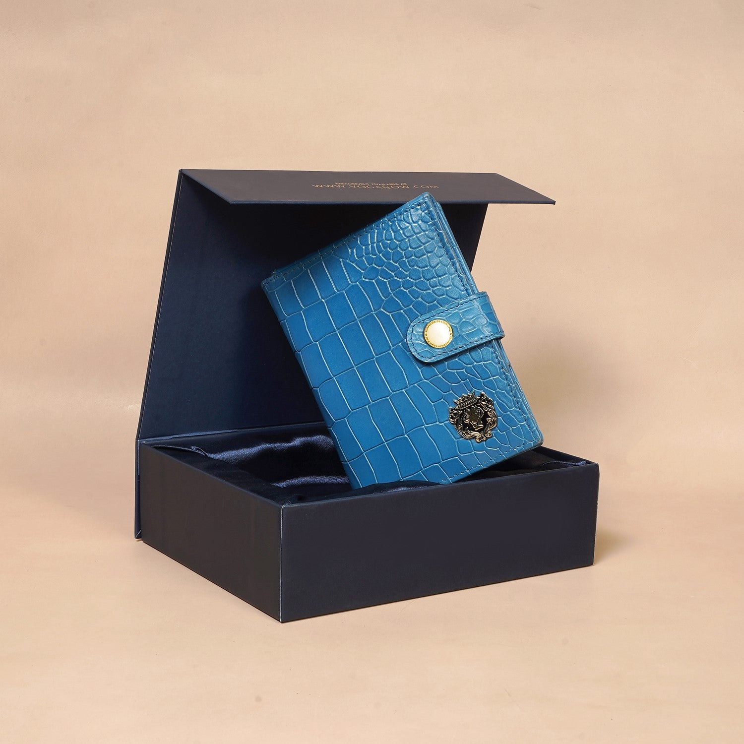Keep your travel documents in style with this foldable passport holder from Brune & Bareskin. This sky blue passport holder is crafted from croco textured leather for a luxurious look, with a patina finish and a metal lion brand logo. Inside, you'll find a dedicated passport pocket, multiple card slots, and a foldable boarding pass pocket secured with a snap button closure for extra security. It a perfect accessory to use for countless years. You can get it personalized with your name initials with our Bespoke Services.