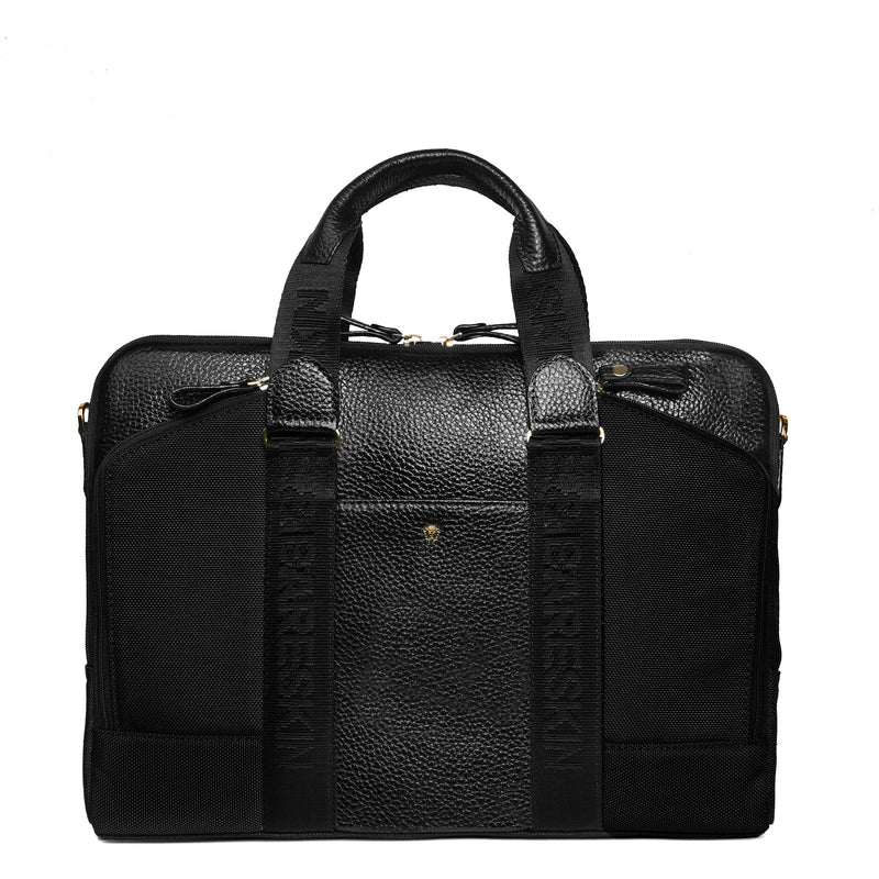 The Brune & Bareskin Brown Leather & Fabric Laptop Bag is a sleek and durable choice for professionals. Crafted from premium textured leather and high-quality fabric, it combines luxury with functionality. The spacious main compartment securely fits laptops up to 15.6 inches, with a padded sleeve for protection. Multiple pockets ensure organized storage, while the sturdy leather-wrapped handles and detachable shoulder strap offer versatile carrying options. Featuring gold-tone hardware, signature branding, and a trolley sleeve for easy travel, this lightweight and stylish bag is perfect for work, meetings, and business trips.