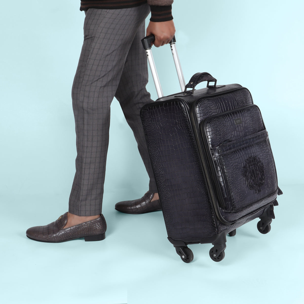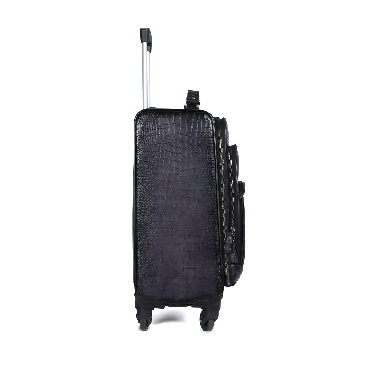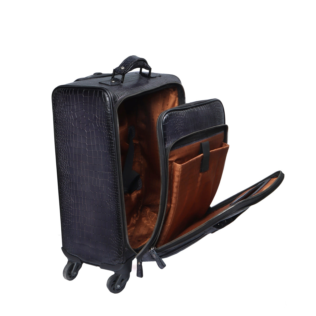 Full Deep Cut Croco Grey Textured Leather Quad Wheel Cabin Strolley Travel Bag
