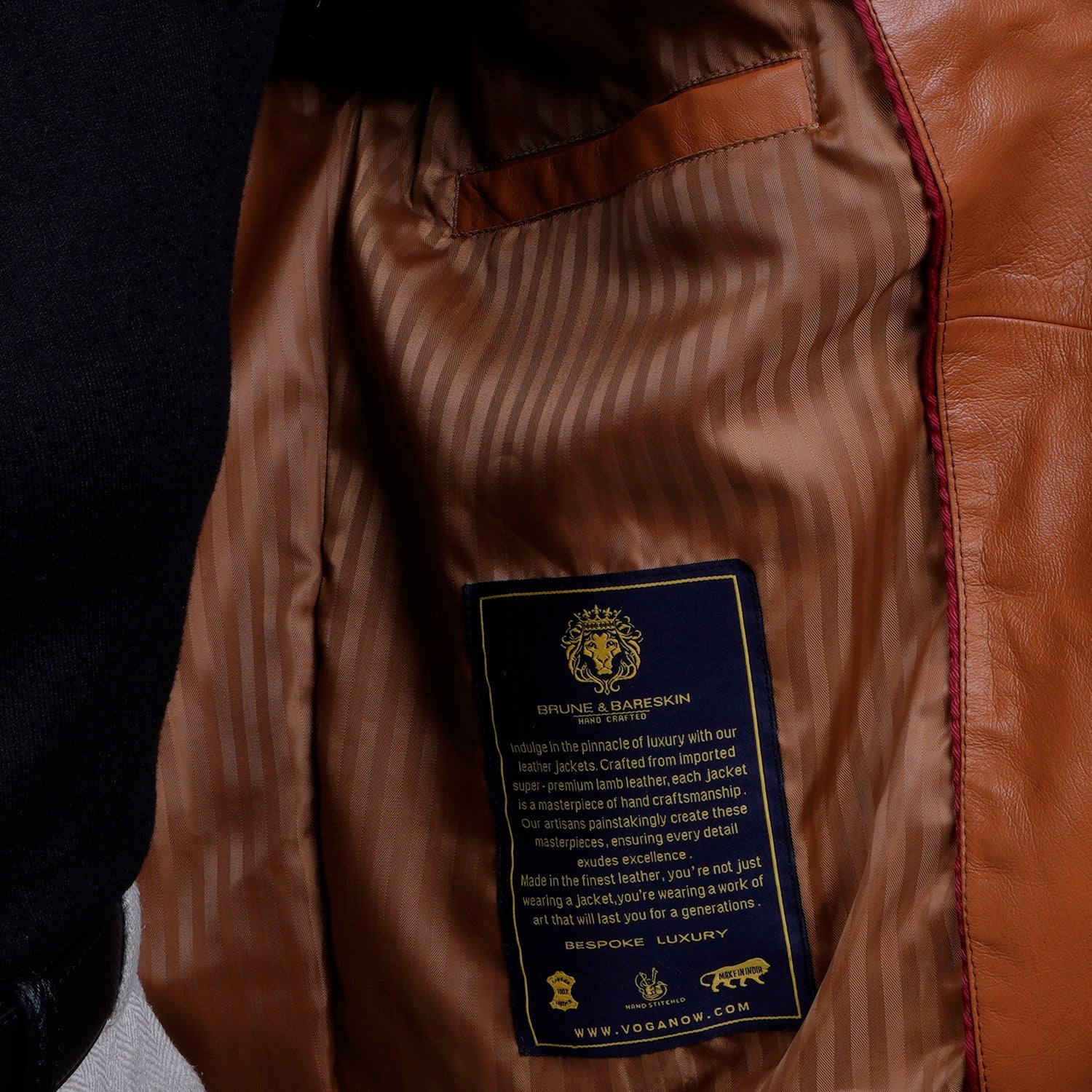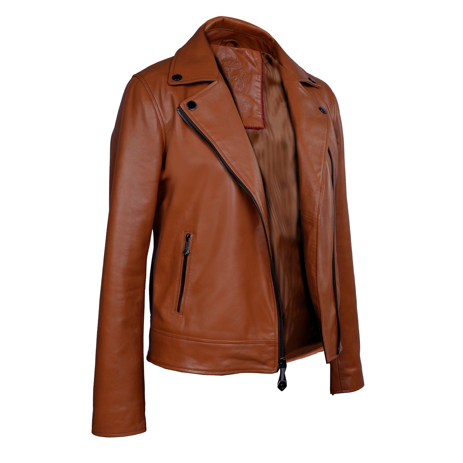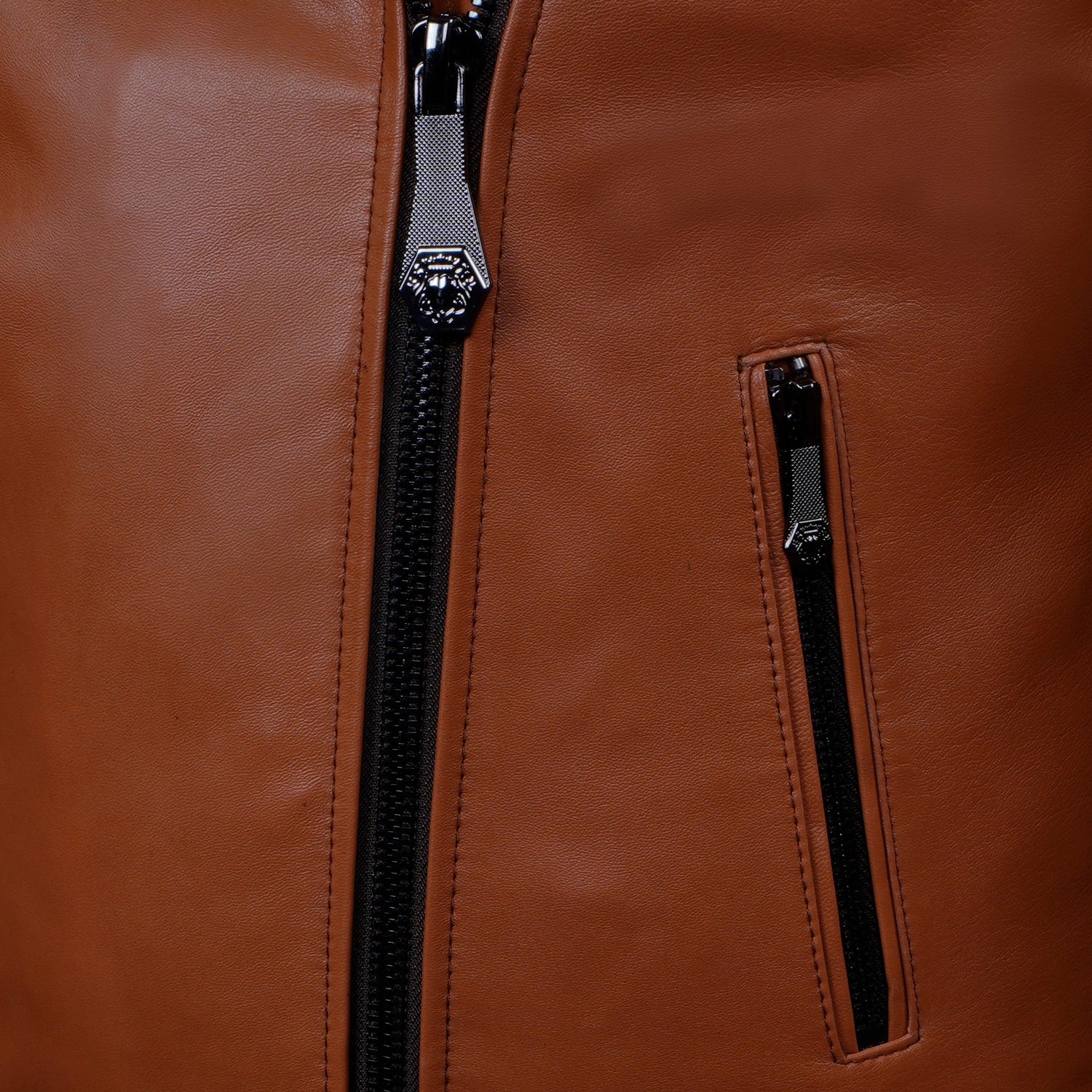 Tan color looks luxurious, especially in Leather. This jacket ensures that you look distinct and stylish in a crowded fashion-oriented world. If you're in need of an awesome, unique new piece to add to your wardrobe then you have come to the right place "Brune & Bareskin". This is a biker-style jacket with button details on the collar and a zipper up the front. This leather jacket features a long collar design along with two silver zip pockets on the front. The company " Brune & Bareskin" complements the fashion statement in a unique way to help customers cherry-pick from the collection & feel better & look better.