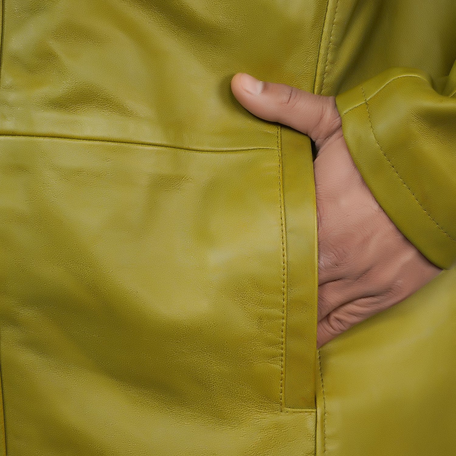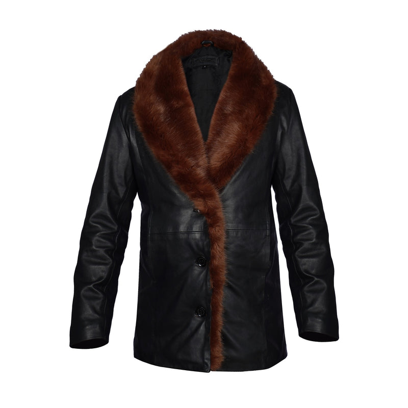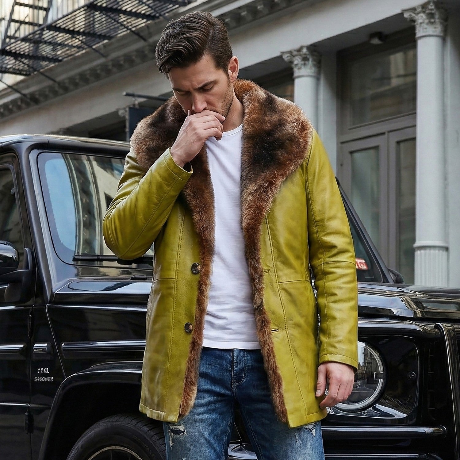 This olive green furr jacket is like a style gem in men fashion apparels. Sheepskin is one of the most luxurious leather and known for its soft touch feel. It's naturally very light in weight. This chic leather jacket has a shearling fur across collar and front with easy access button closure. This is a must have Jacket to enhance the luxurious elegance in your wardrobe.