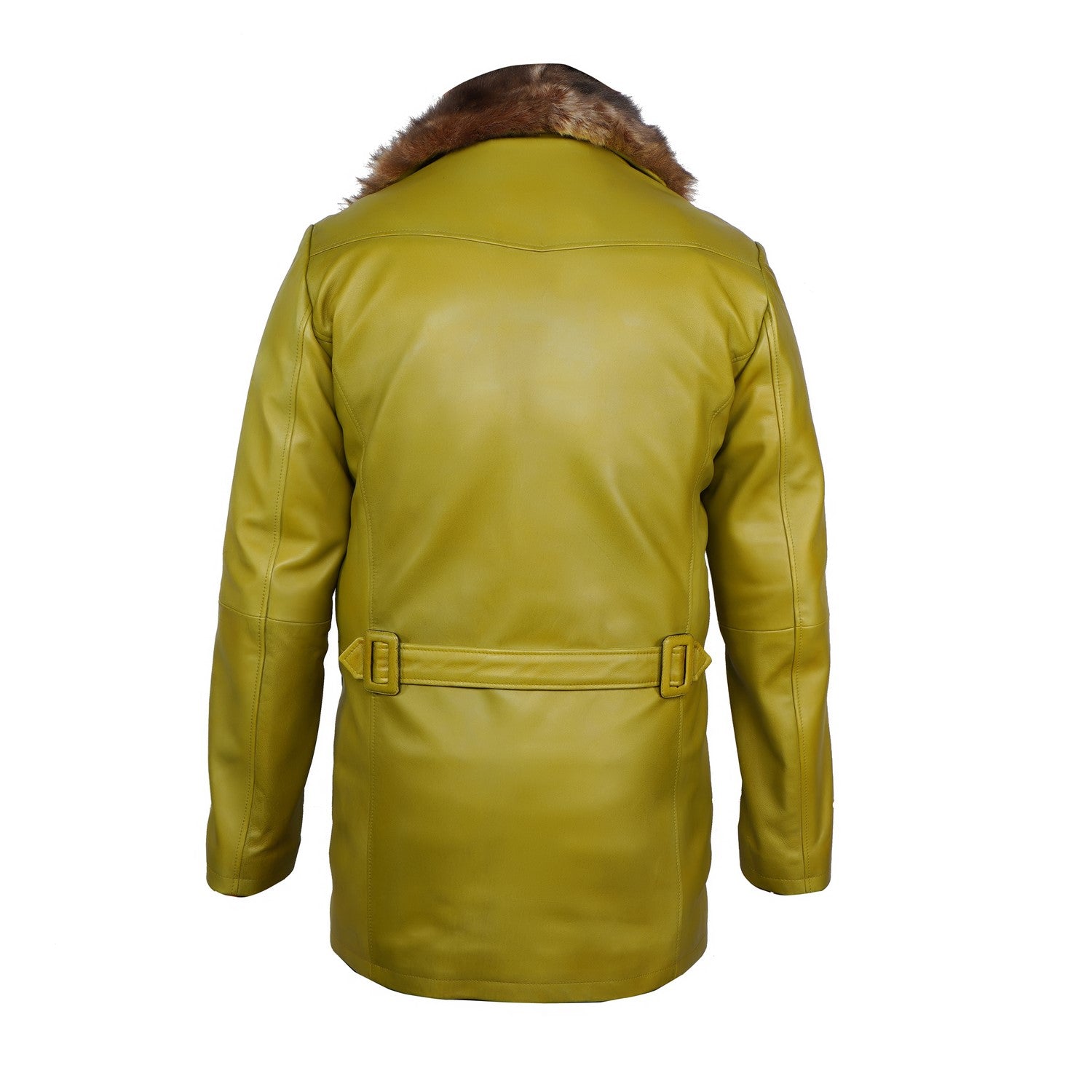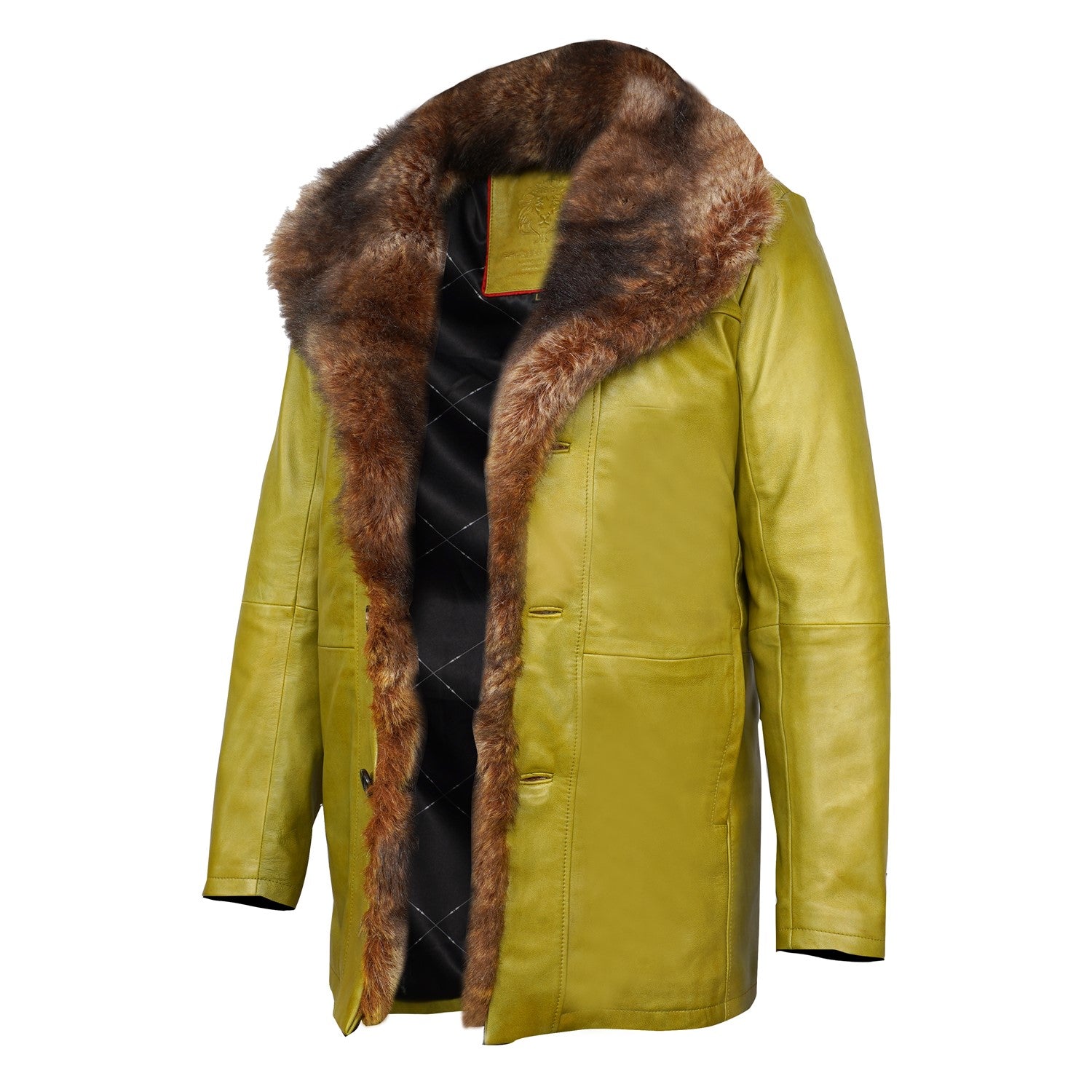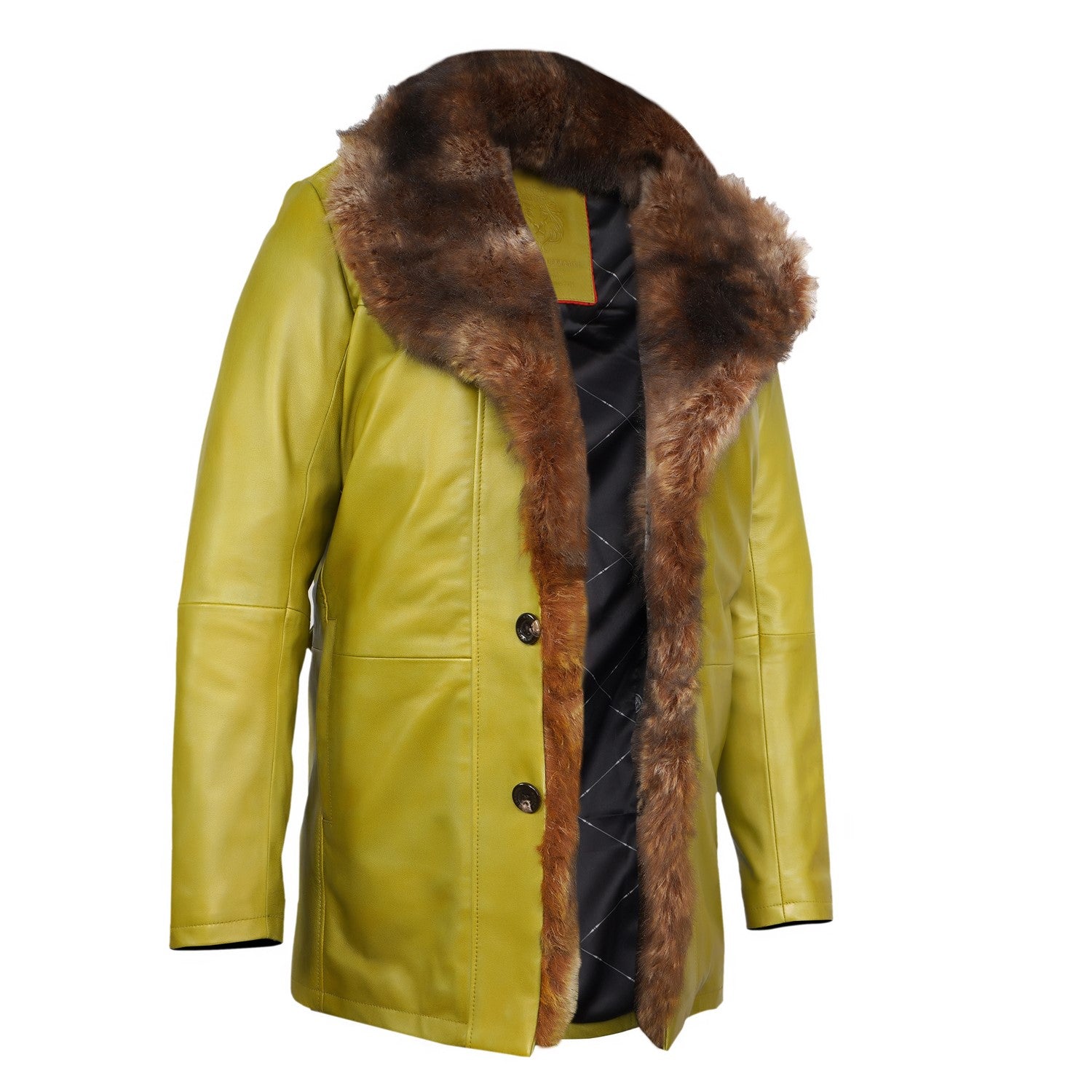 Furr Collar Leather Long Coat Jacket in Olive Green Leather